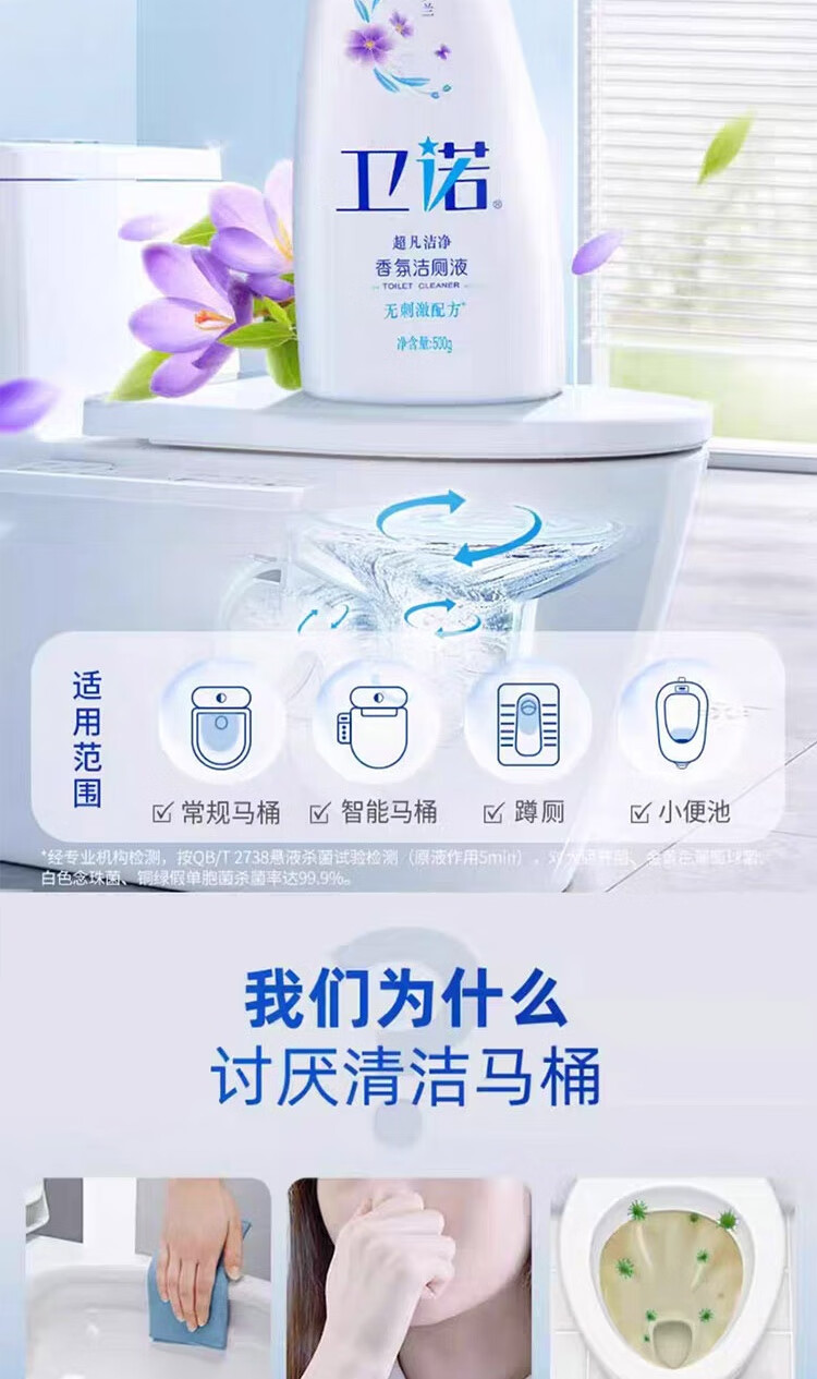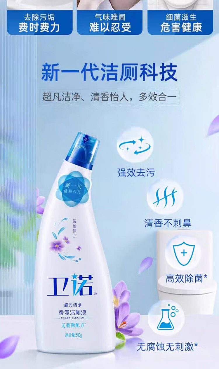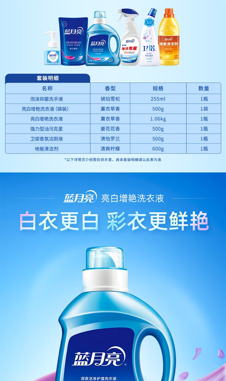 亮白薰衣草洗衣液1.06kg*1 亮白薰衣草洗衣液袋500g*1 除 菌地板清洁剂600g*1 强力型油污克星500g*1 卫诺罗兰洁厕液500g*1 琥珀雪松泡沫洗手液255ml*1
