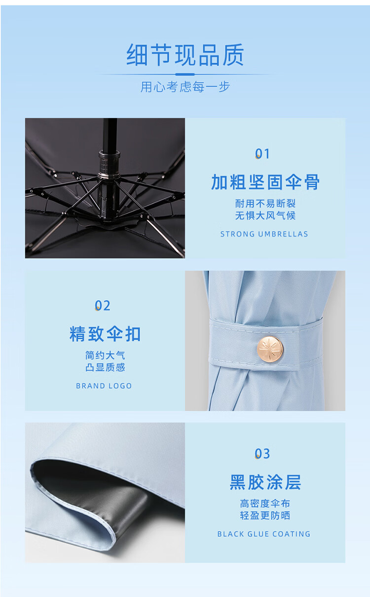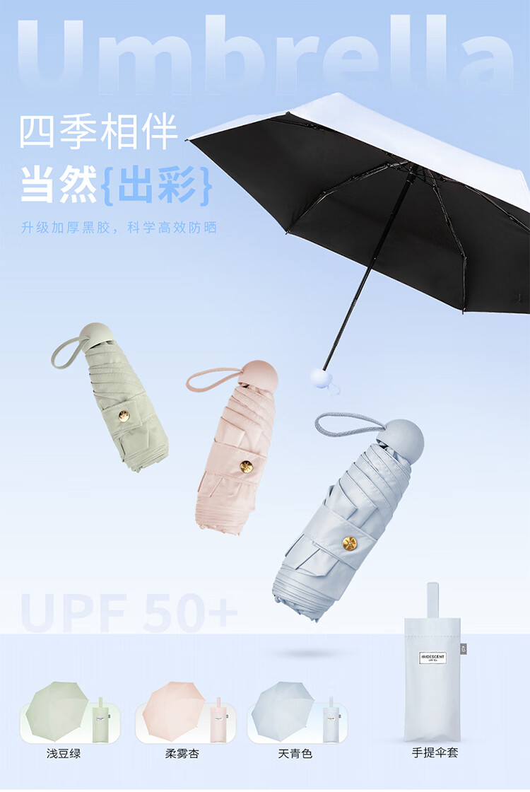 材 质:钢制+纤维伞骨 、黑胶碰起布规 格:50CM x 6K颜 色:天青色、柔雾杏、浅豆绿、箱 规 :50PCS