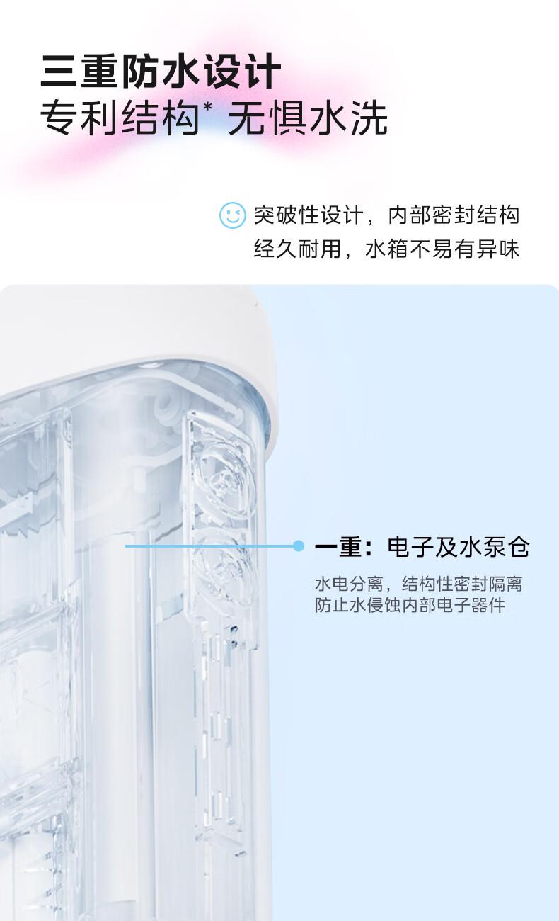 产品颜色:海盐蓝/香芋粉 充电时间:4h默认挡位:清爽 额定电压:3.7V额定功率:10W充电方式:Type-C水箱容量:180mL商品条形码:6973540202866毛重:7.02 kg 包装尺寸:234.7 x 189.7 x 60.9 mm