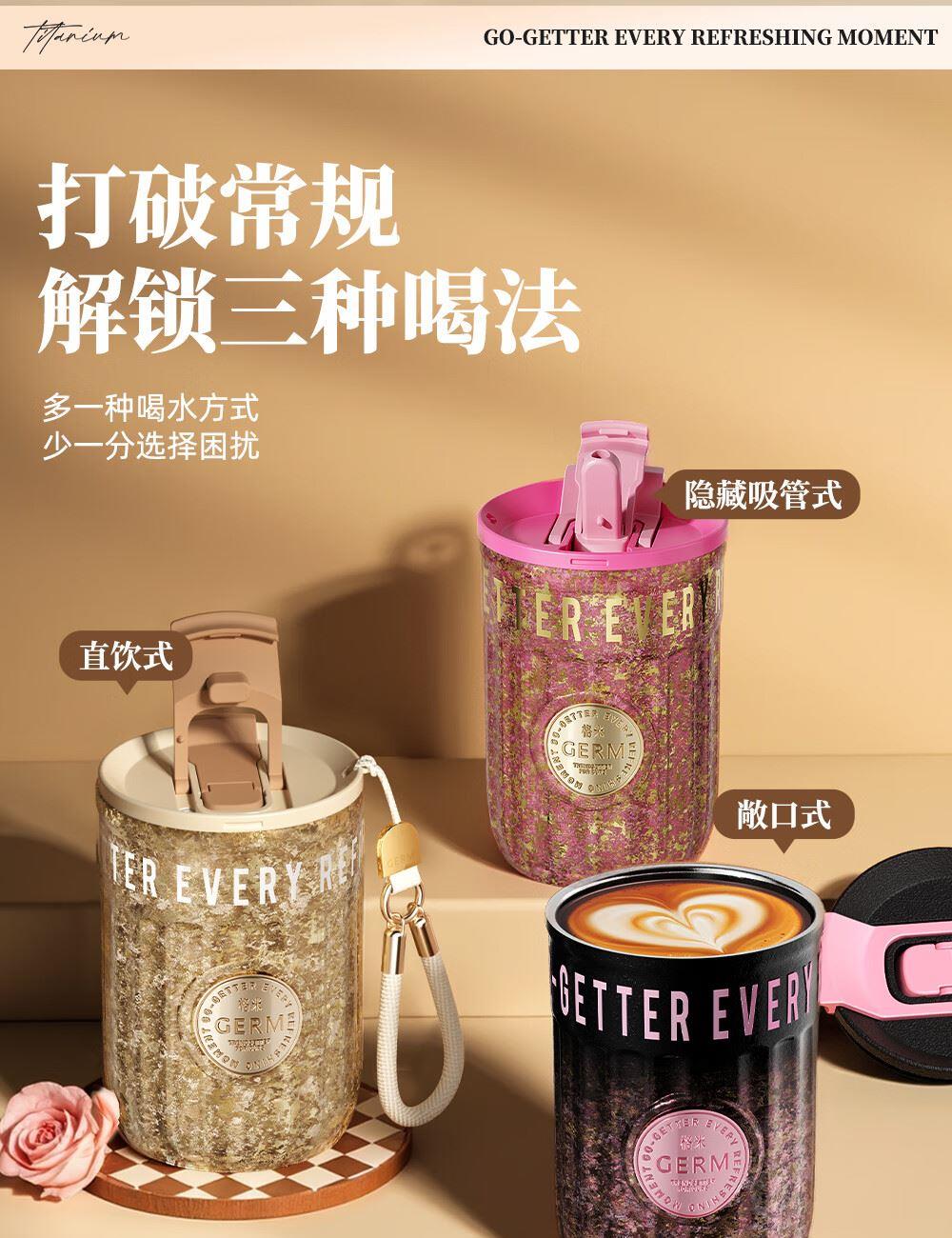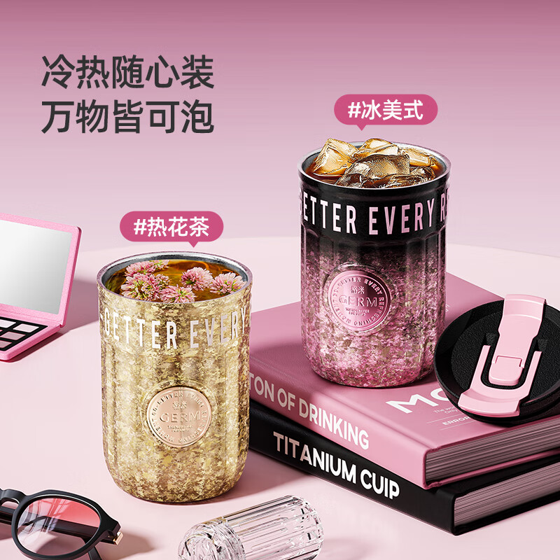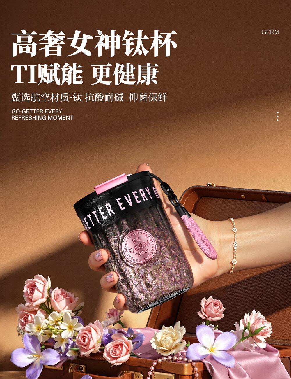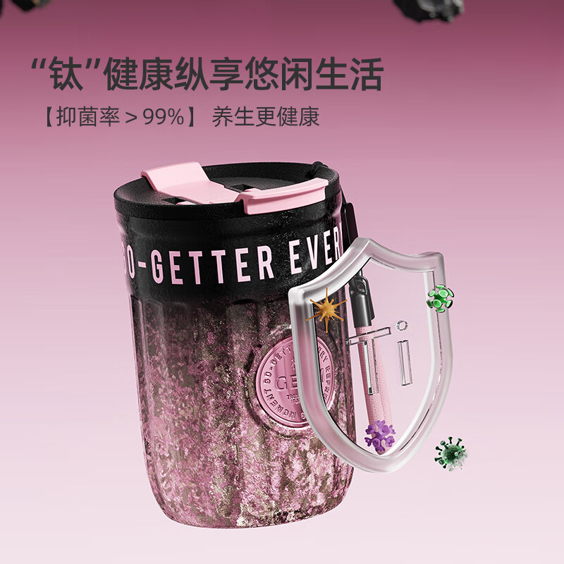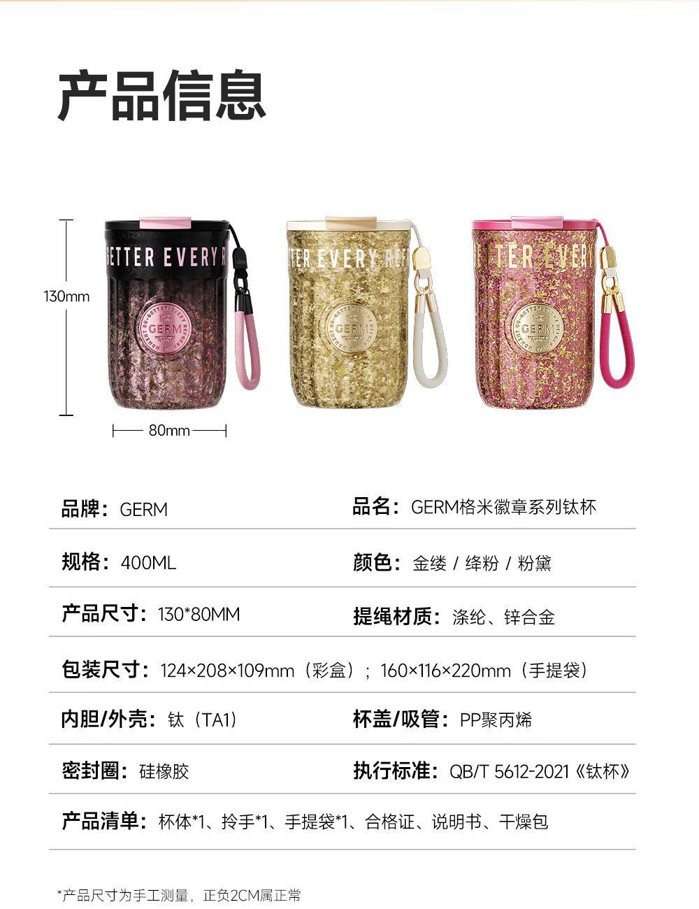 颜色: 绛粉/ 金缕/ 粉黛 产品规格:400ml材质:内胆/外壳 - 钛; 杯盖/吸管 - PP; 拎手 - 涤纶、锌合金; 密封件 - 硅橡胶; 包装尺寸:124×208×109mm 装 箱明细:20pcs/箱