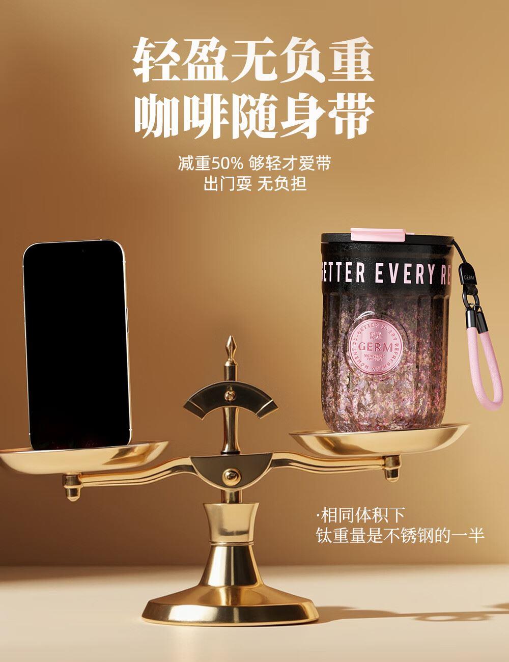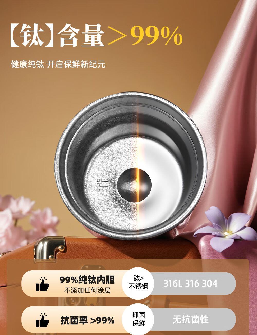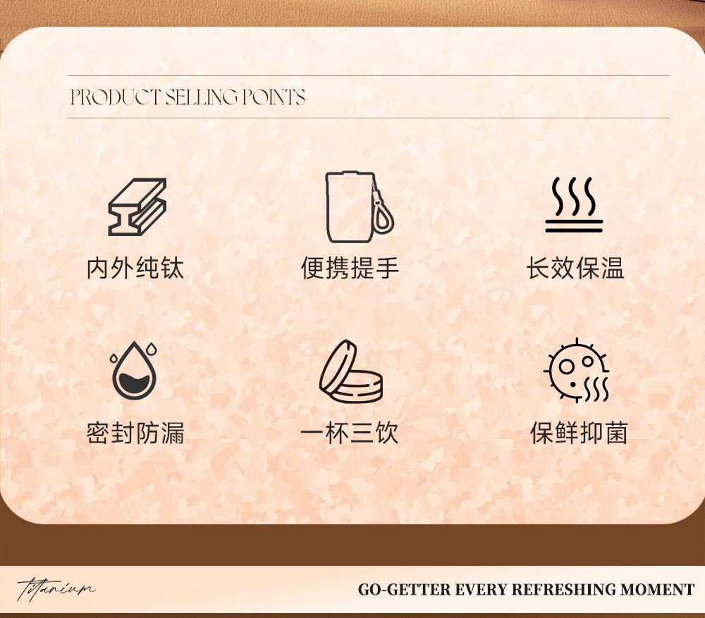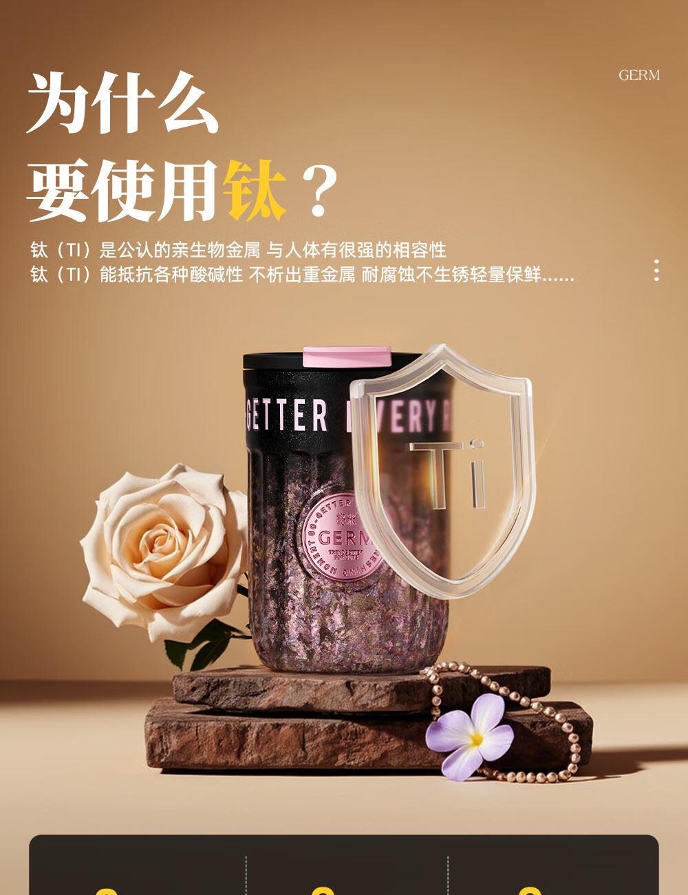 颜色: 绛粉/ 金缕/ 粉黛 产品规格:400ml材质:内胆/外壳 - 钛; 杯盖/吸管 - PP; 拎手 - 涤纶、锌合金; 密封件 - 硅橡胶; 包装尺寸:124×208×109mm 装 箱明细:20pcs/箱