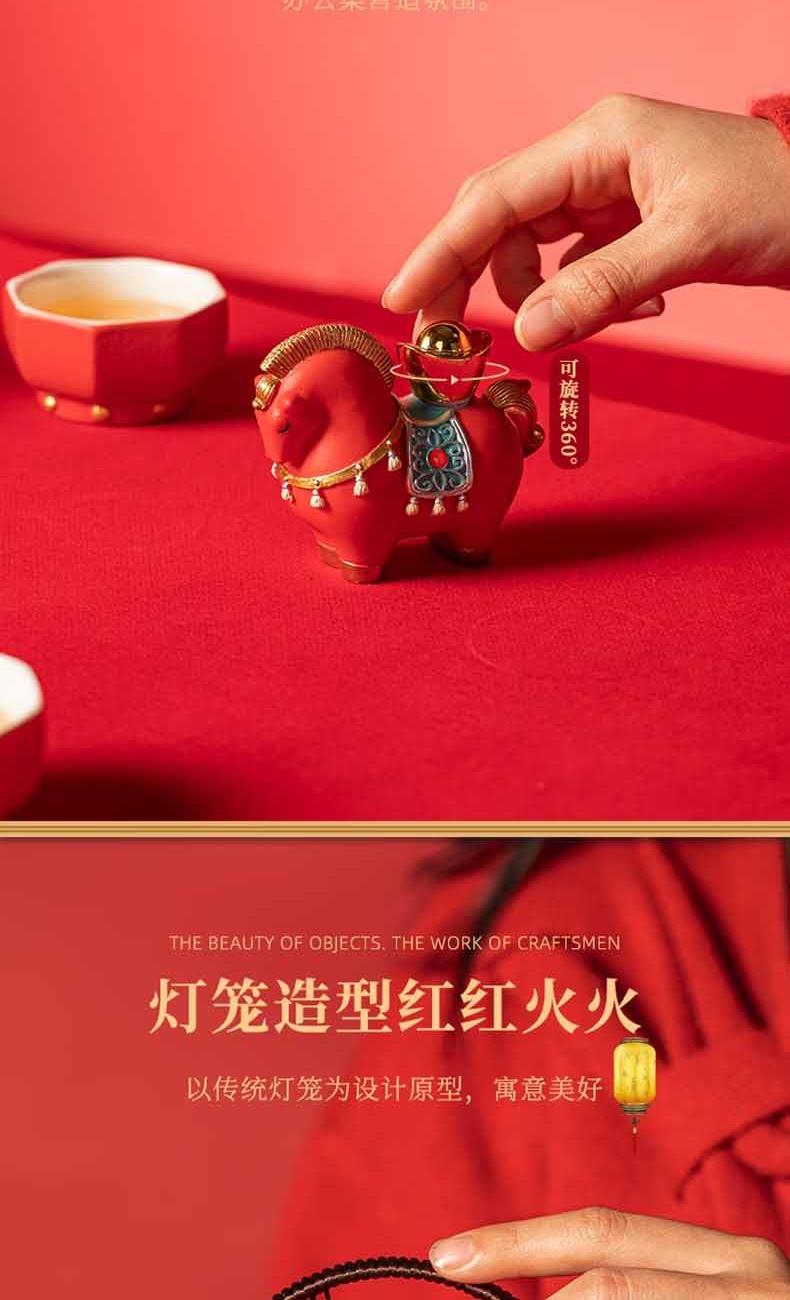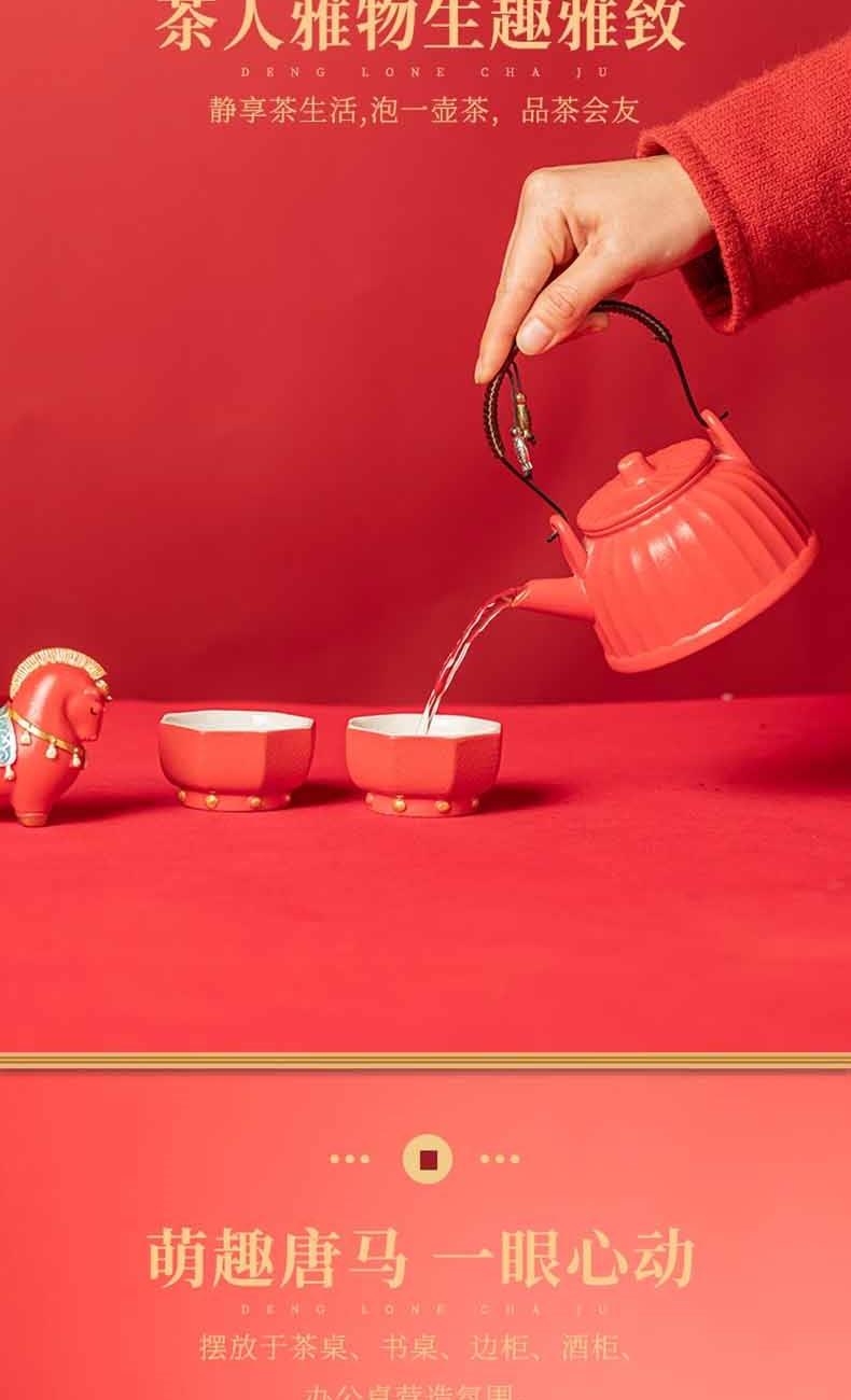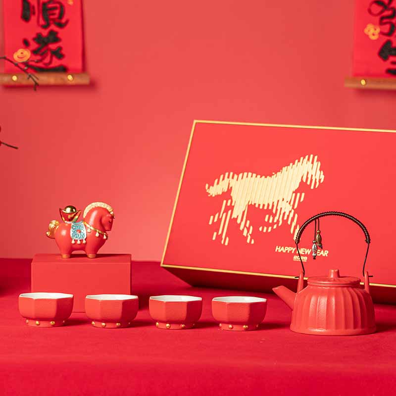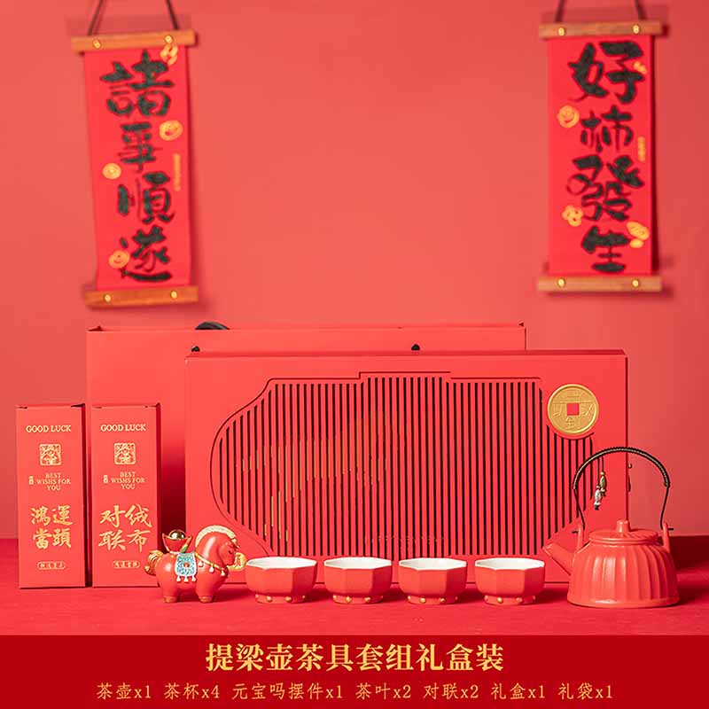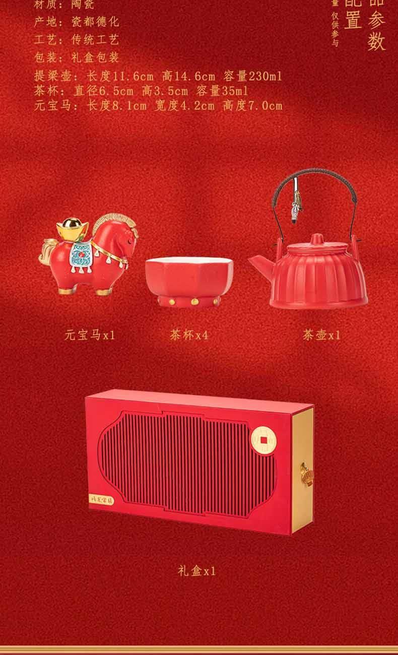 配置:茶壶1、茶杯4、元宝马摆件1、茶叶2、对联2、礼盒1、礼袋1 材料:陶瓷 包 装:礼盒包装