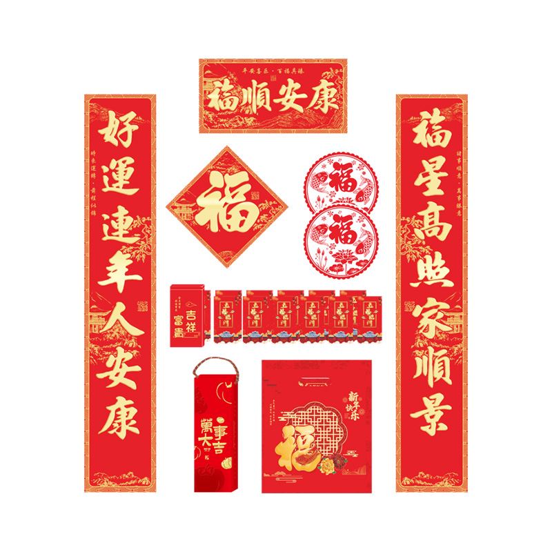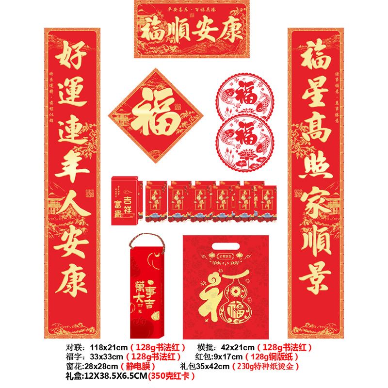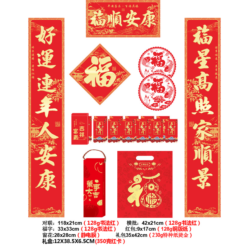 对联:118x21cm(128g书法红) 横批:42x21cm(128g书法红) 福字:33x33cm(128g书法红) 红包:9x17cm(128g铜版纸) 窗花:28x28cm(静电膜) 礼包35x42cm(230g特种纸烫金) 礼盒:12X38.5X6.5CM(350克红卡)