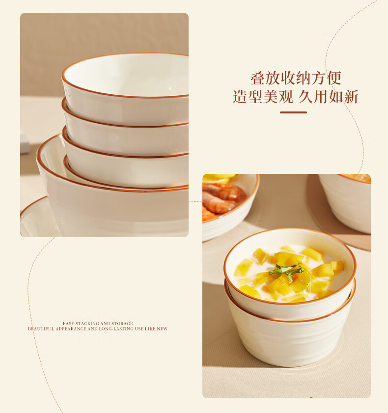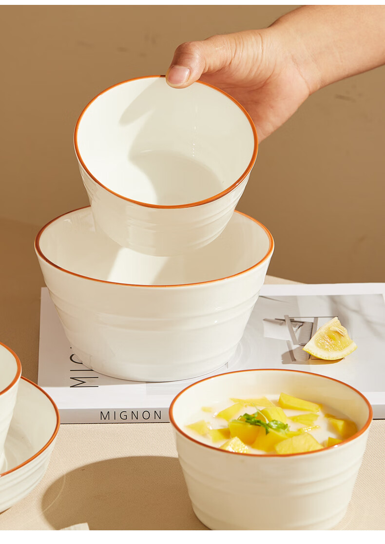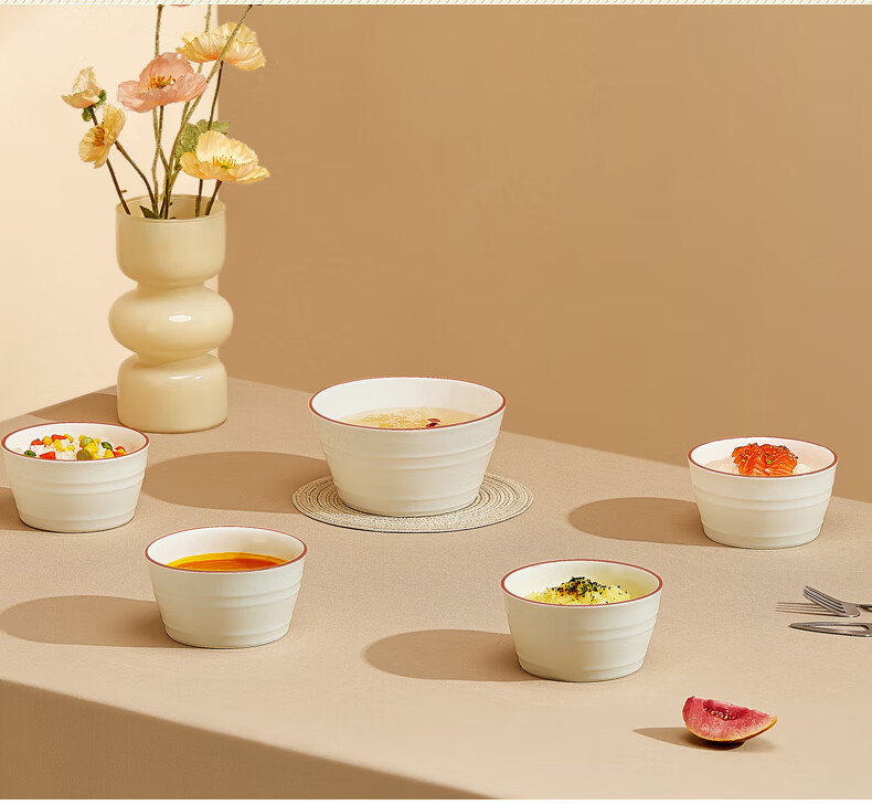 材 质:高温瓷装 箱 规格:10套 /箱产品参数:4.5英寸小碗*4、6英寸中碗*1彩盒尺寸:417*87*236mm 外箱尺寸:45.7*43*49cm