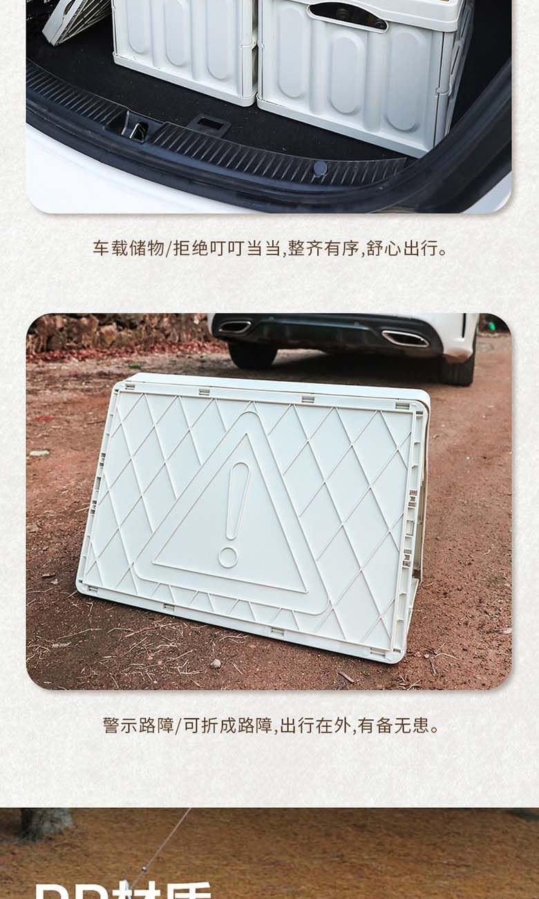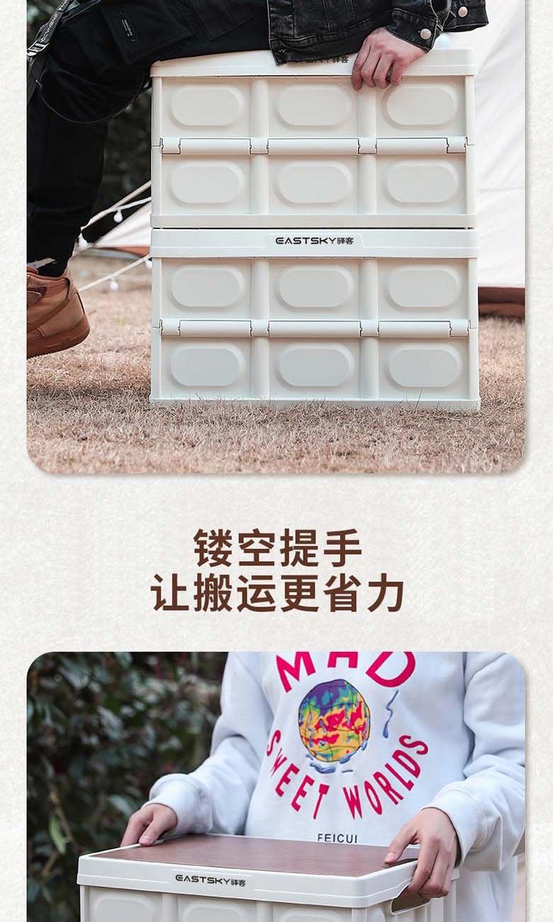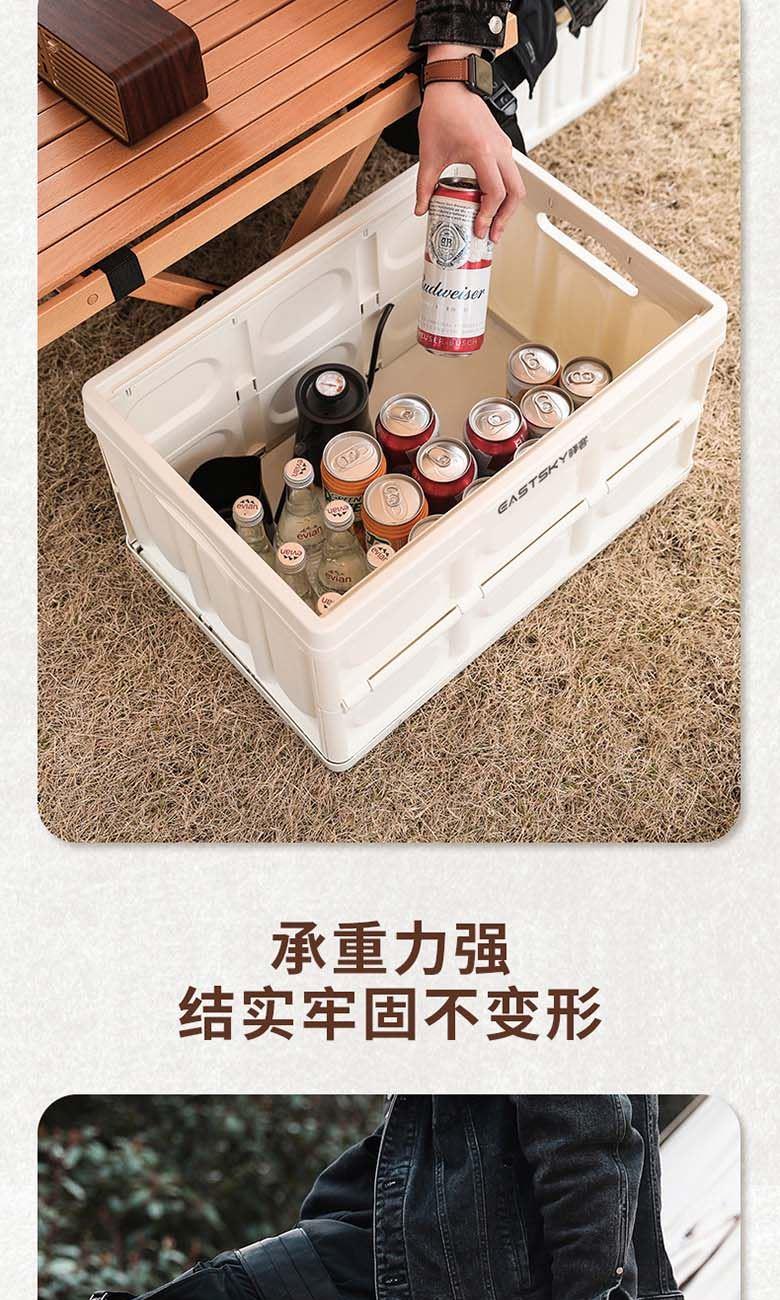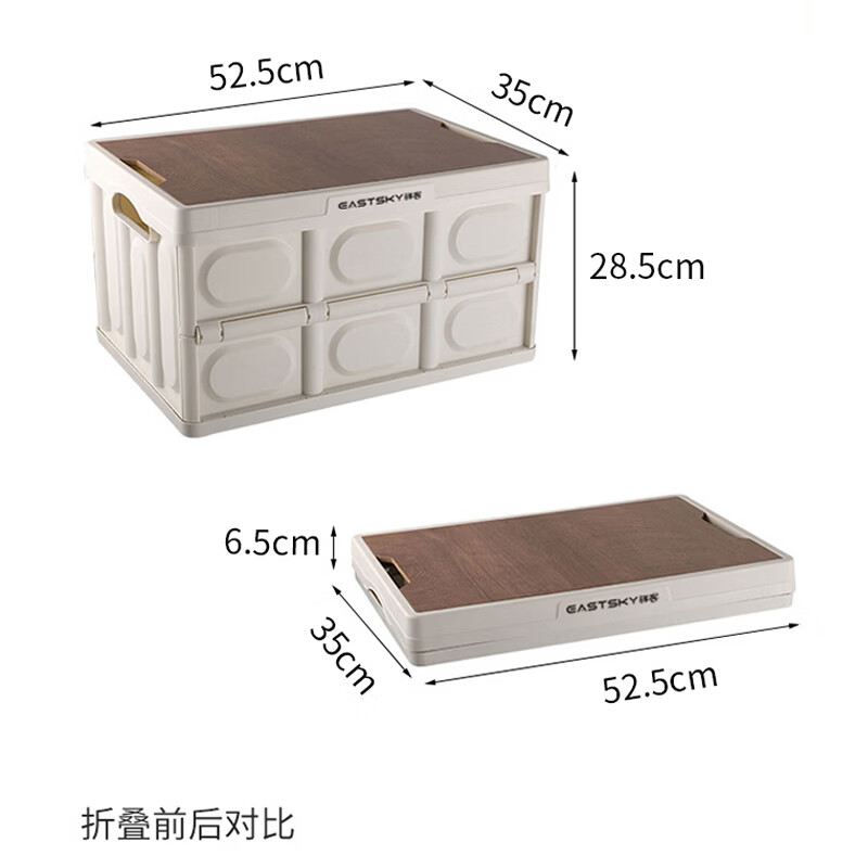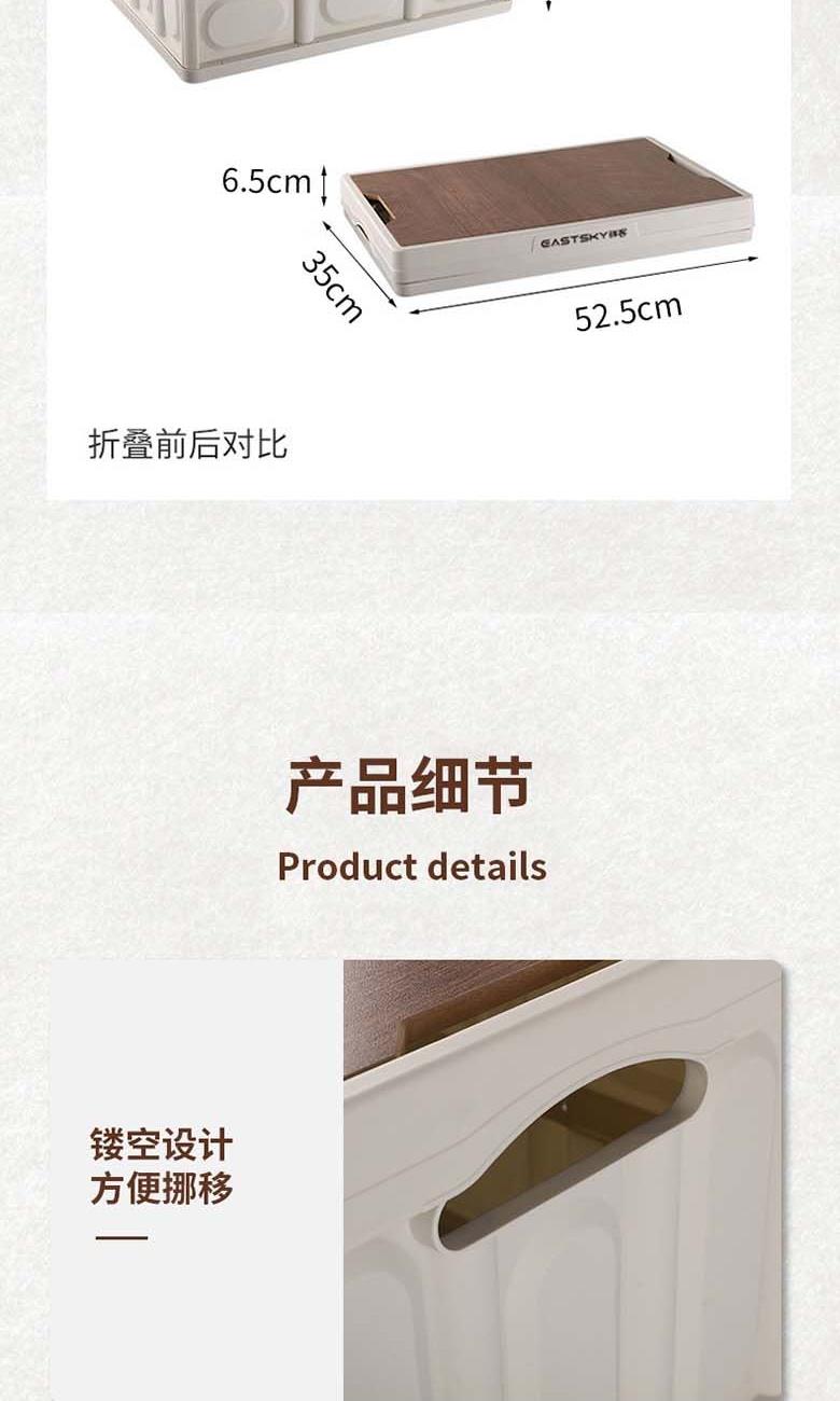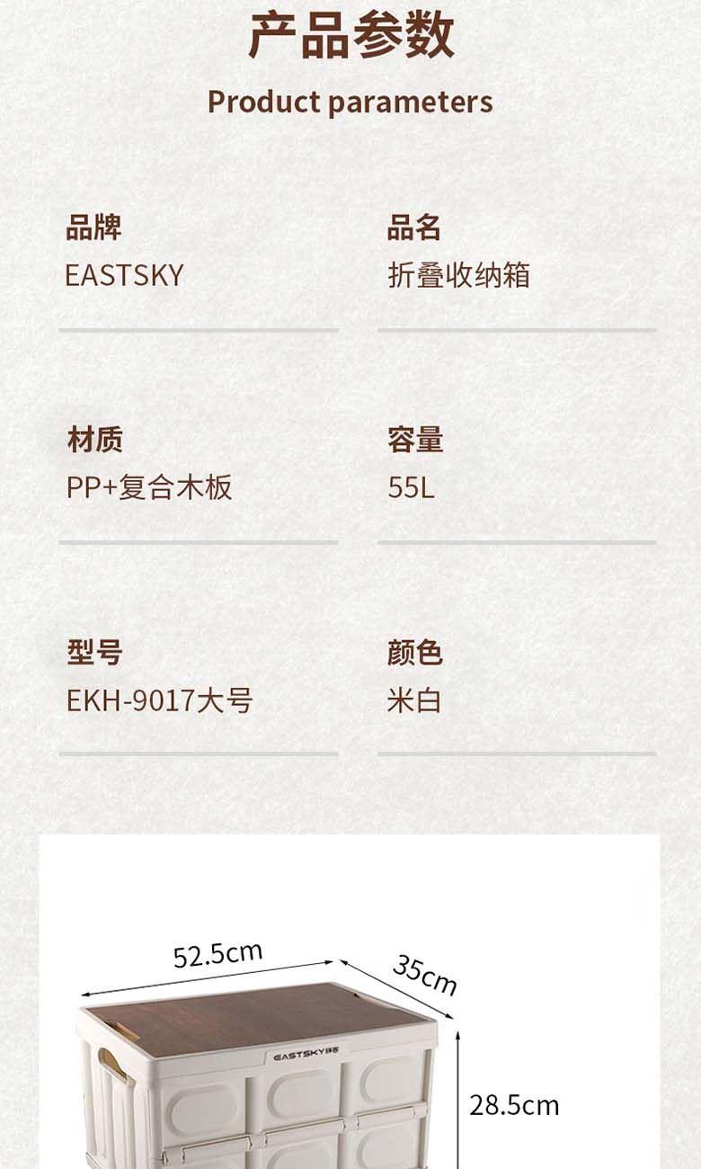 型号:EKH-9017 颜色:米白色 材质:箱体-PP 盖子-复合木板 规格尺寸:28.5*35*52.5(展开尺寸) 35*52.5*6.5cm(折叠尺寸) 容量:55L