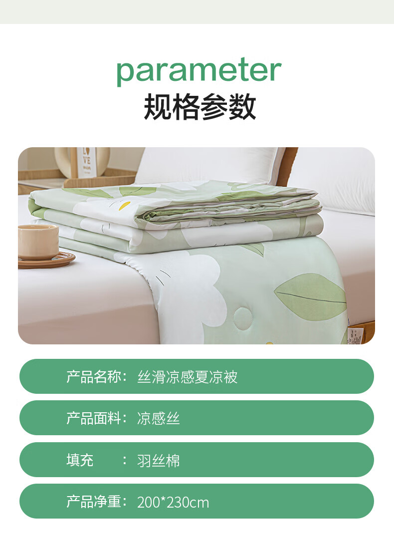 面 料: 凉感丝 填 充: 羽丝棉 规 格: 200*230cm 克 重: 1600g 包 装: 手提盒