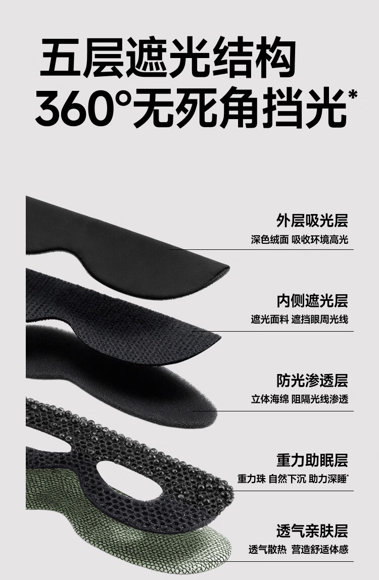 360°仿生遮光、光线无处渗入戴上就天黑 3D立体凹槽结构不压眼球、午觉趴睡不易花妆 多穴位重力触压舒缓紧绷神经、更快入睡