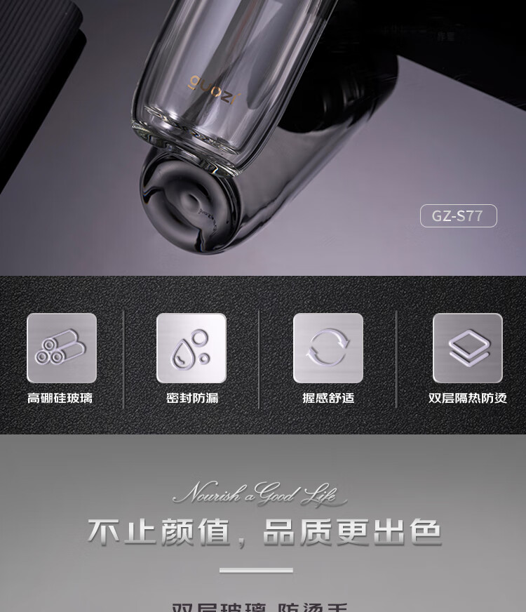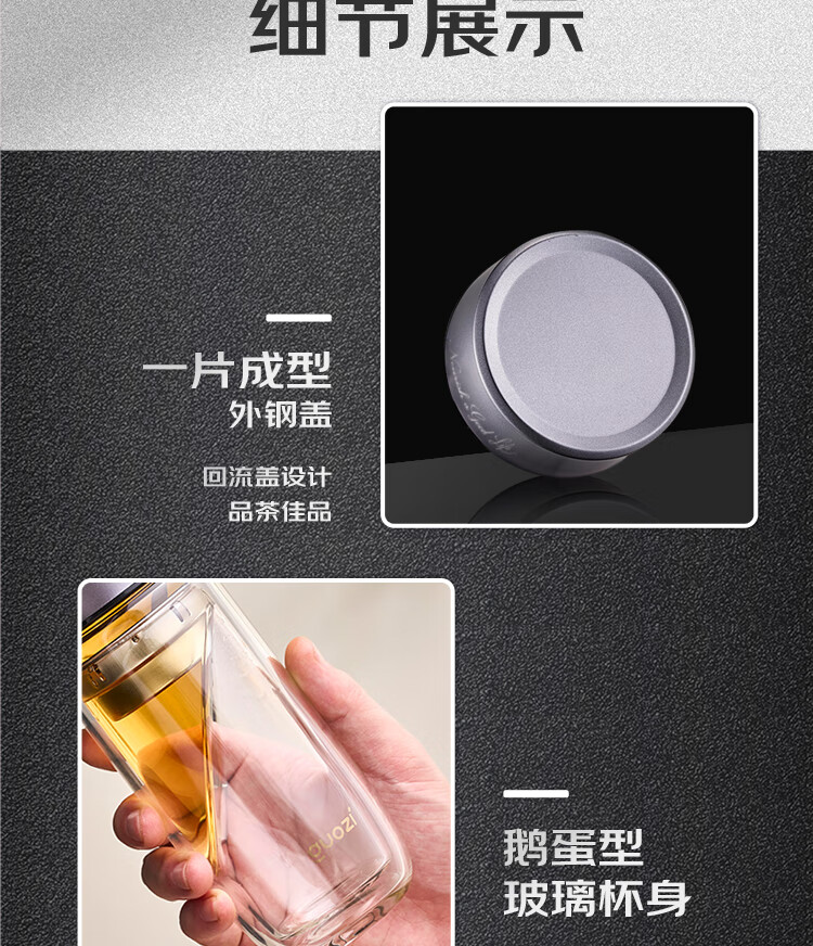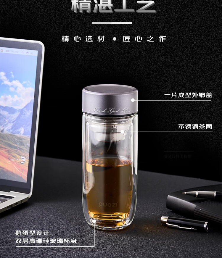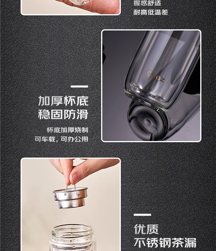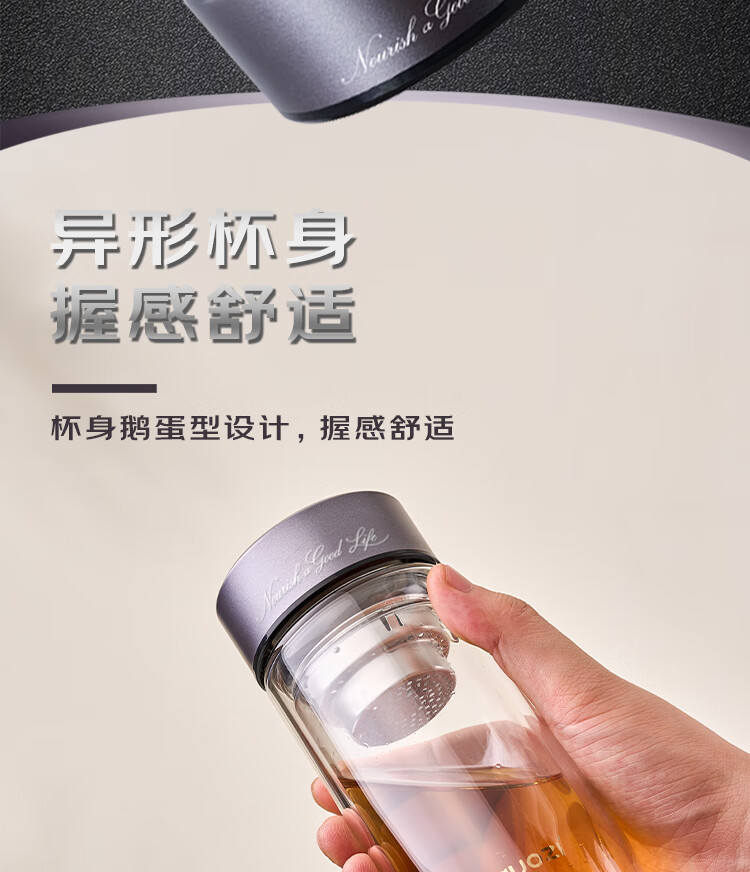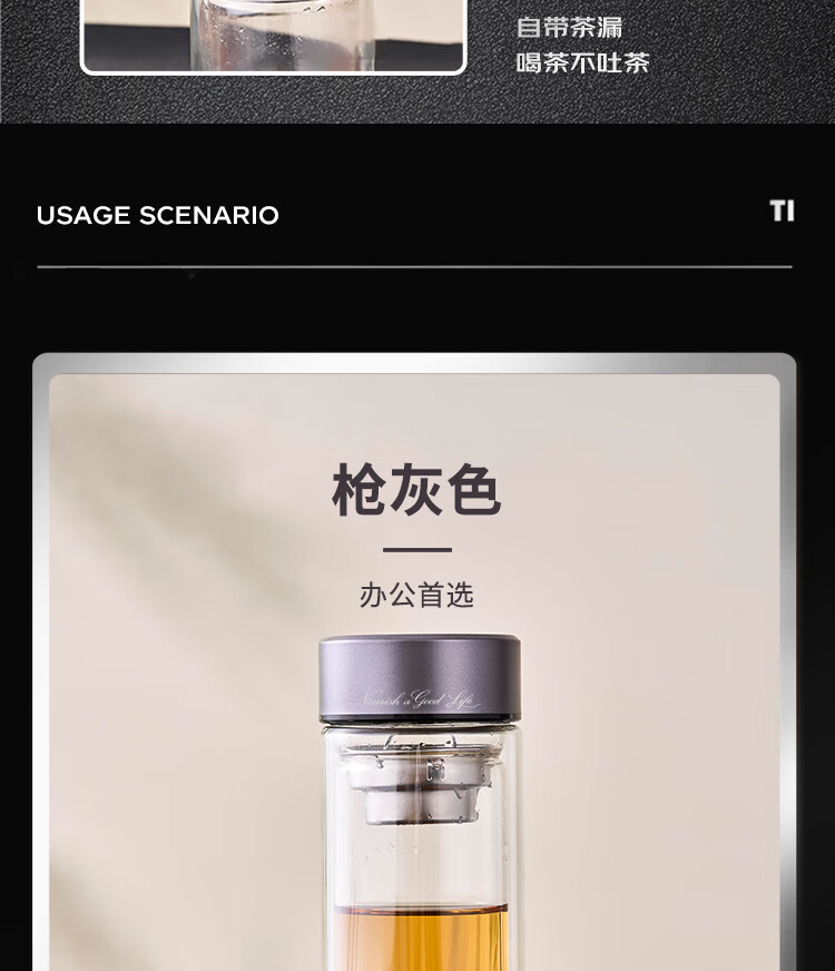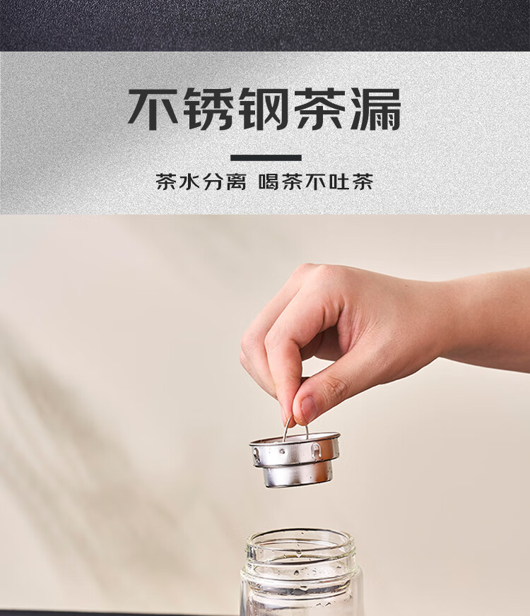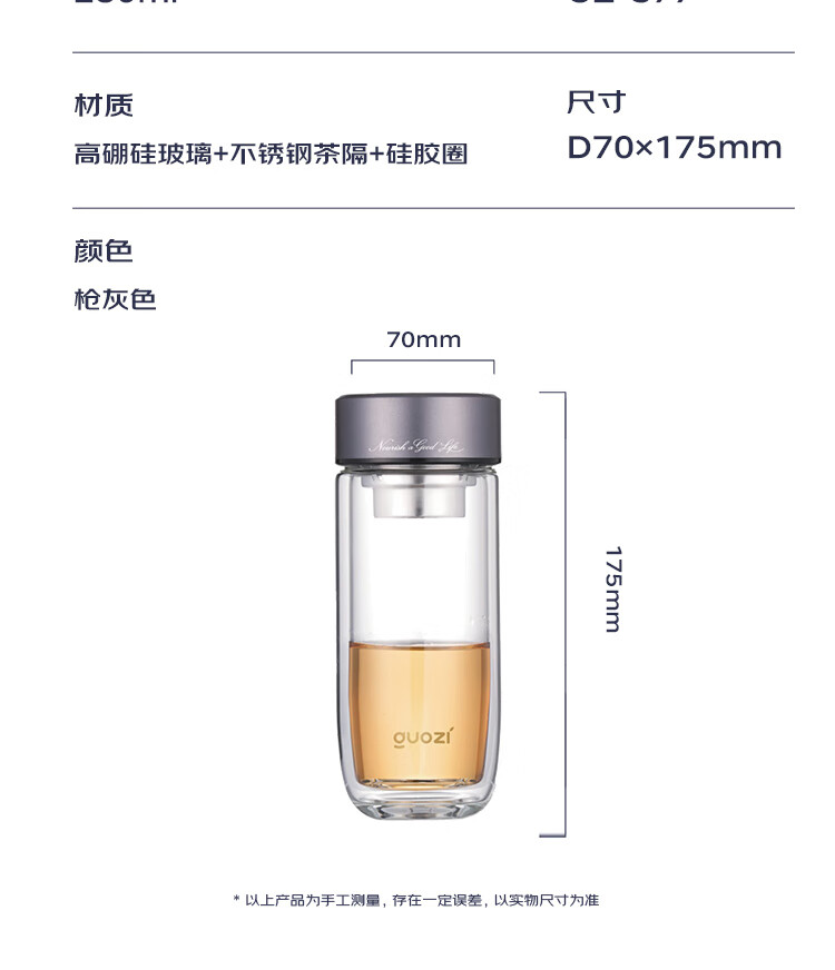 容 量:280ml 材 质:高硼硅玻璃+不锈钢茶隔+硅胶圈 尺 寸:D70×175mm 装 箱数量:60只 /箱 颜 色:枪灰色 产品条码:6932968609305