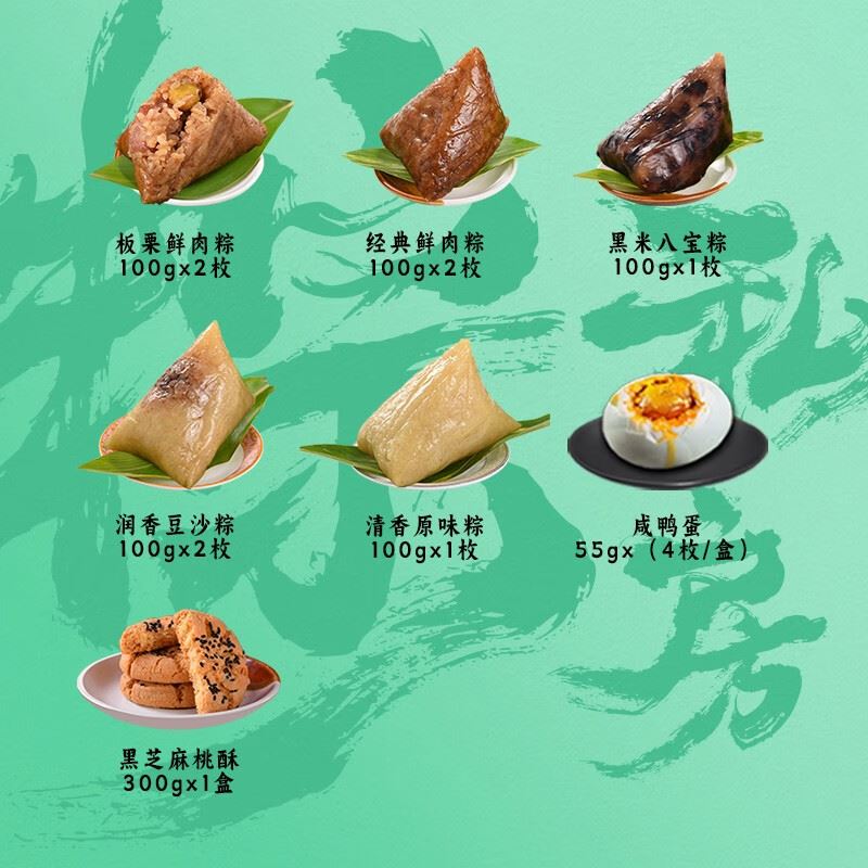 板栗鲜肉粽 100g*2枚 经典鲜肉粽 100g*2枚 黑米八宝粽 100g*1枚 润香豆沙粽 100g*2枚 清香原味粽 100g*1枚 咸鸭蛋 55g*4枚*1盒 黑芝麻桃酥 300g*1盒