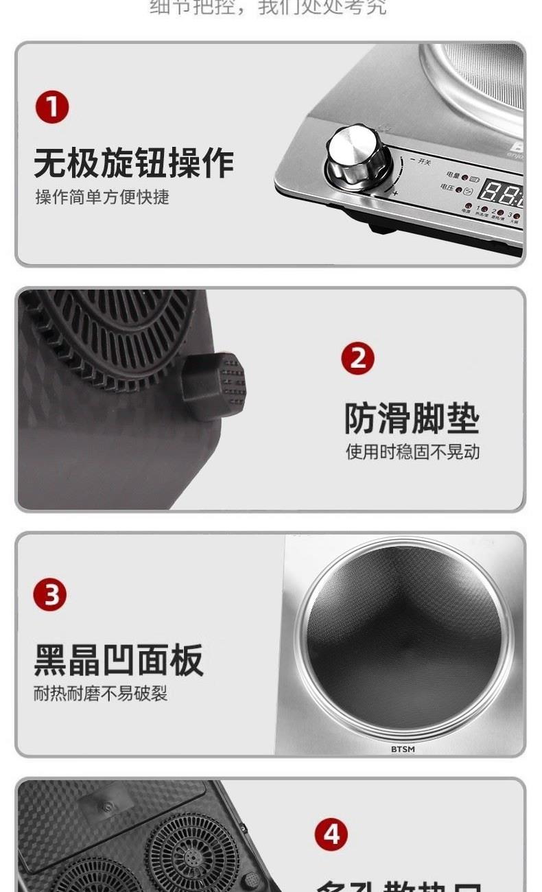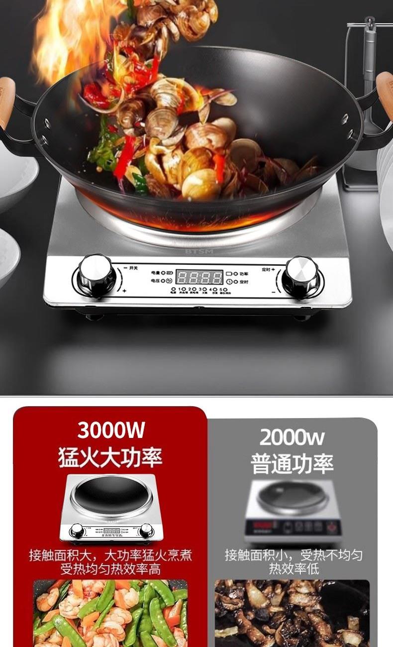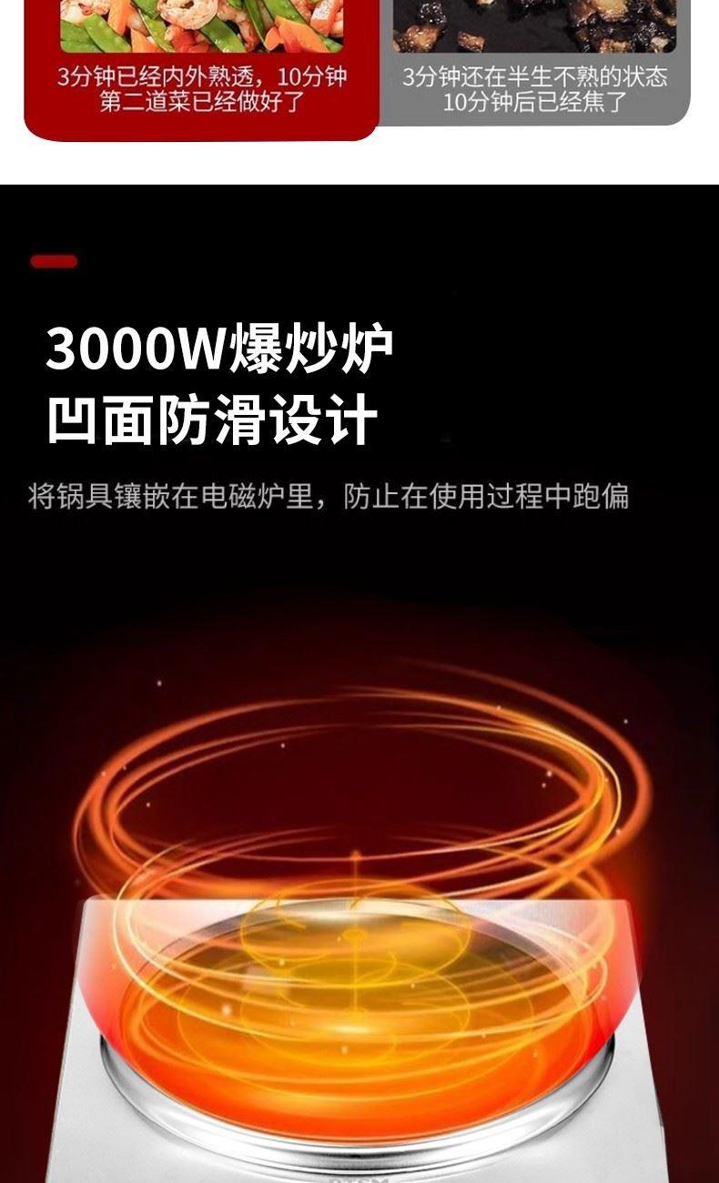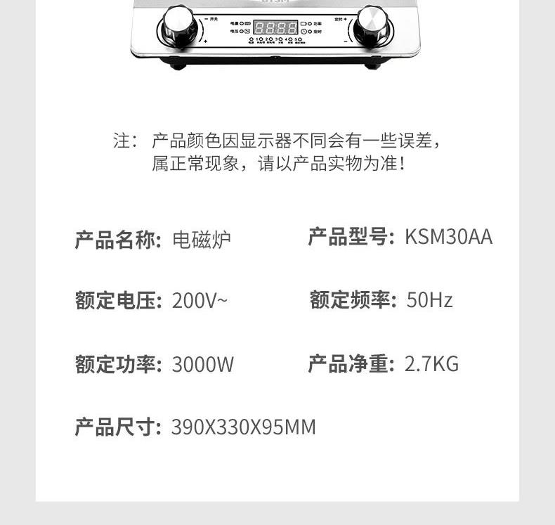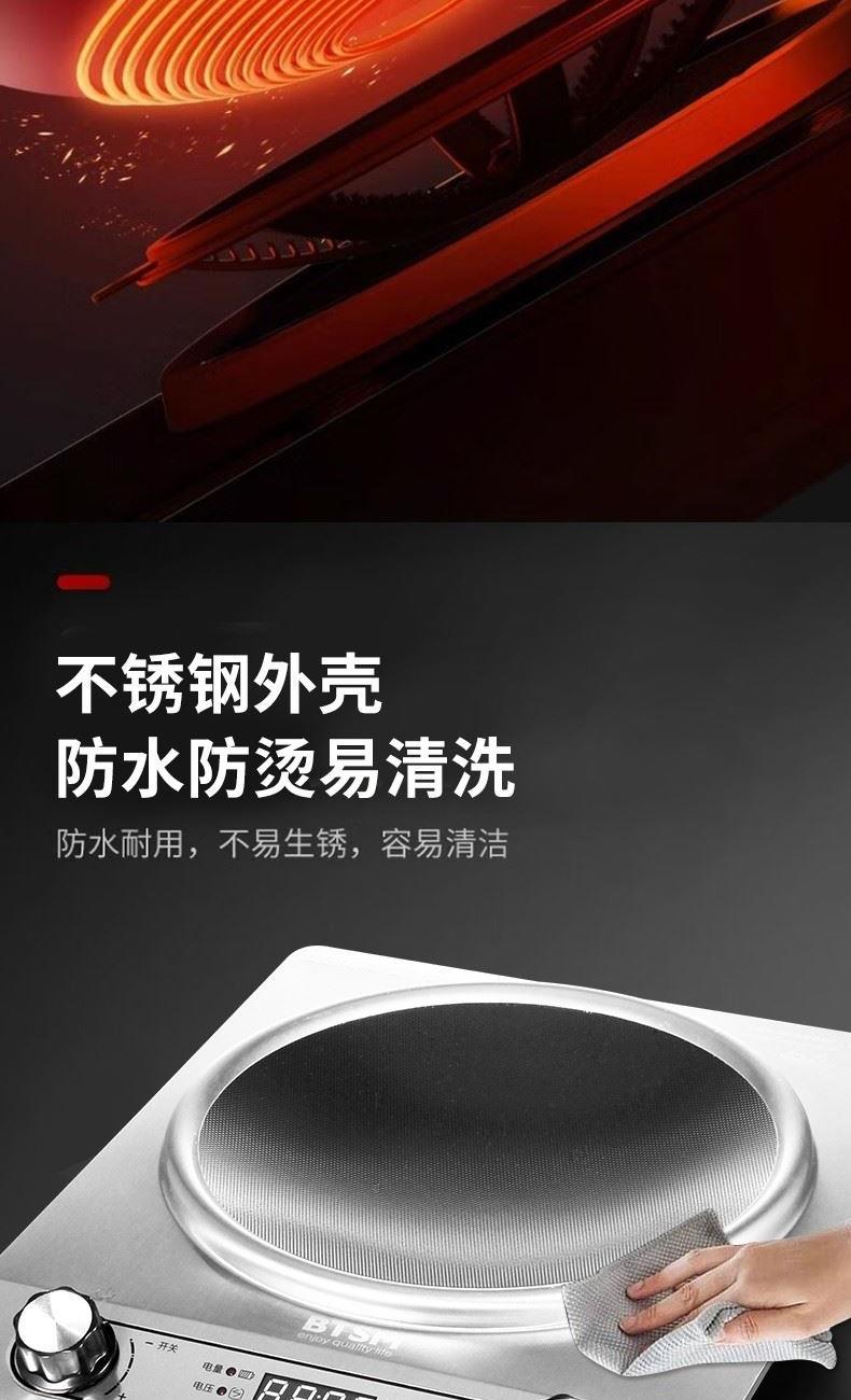 内控编码:BT-CL824 额定功率:3000W 额定电源:220V~50Hz 产品净重:2.7kg 产品材质:面壳201不锈钢、底壳PP、晶板 条形码:6971679081512 装 箱数:1*1 产品尺寸:390*330*95mm 邮购箱尺寸:400*144*440mm 装 箱清单:电磁炉*1、说明书*1