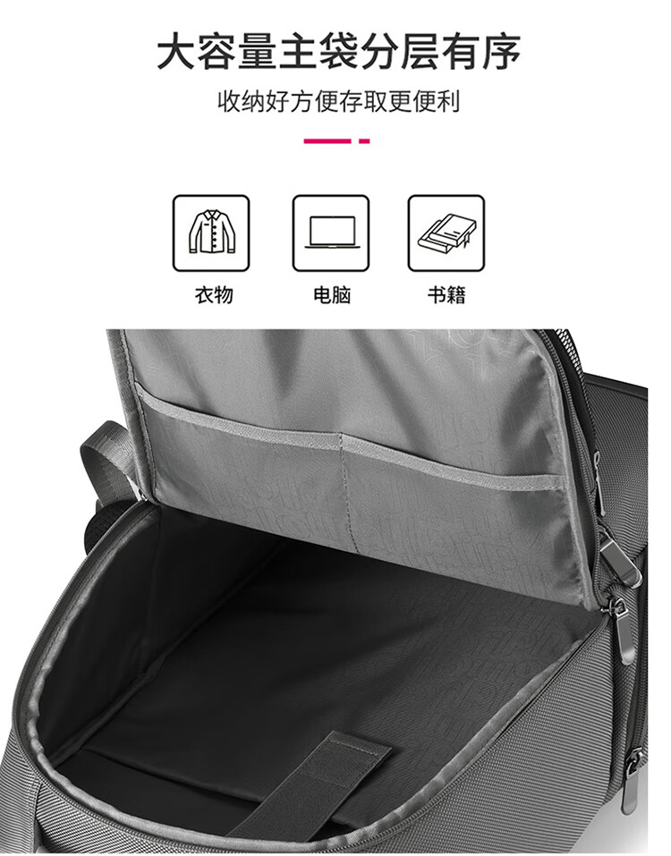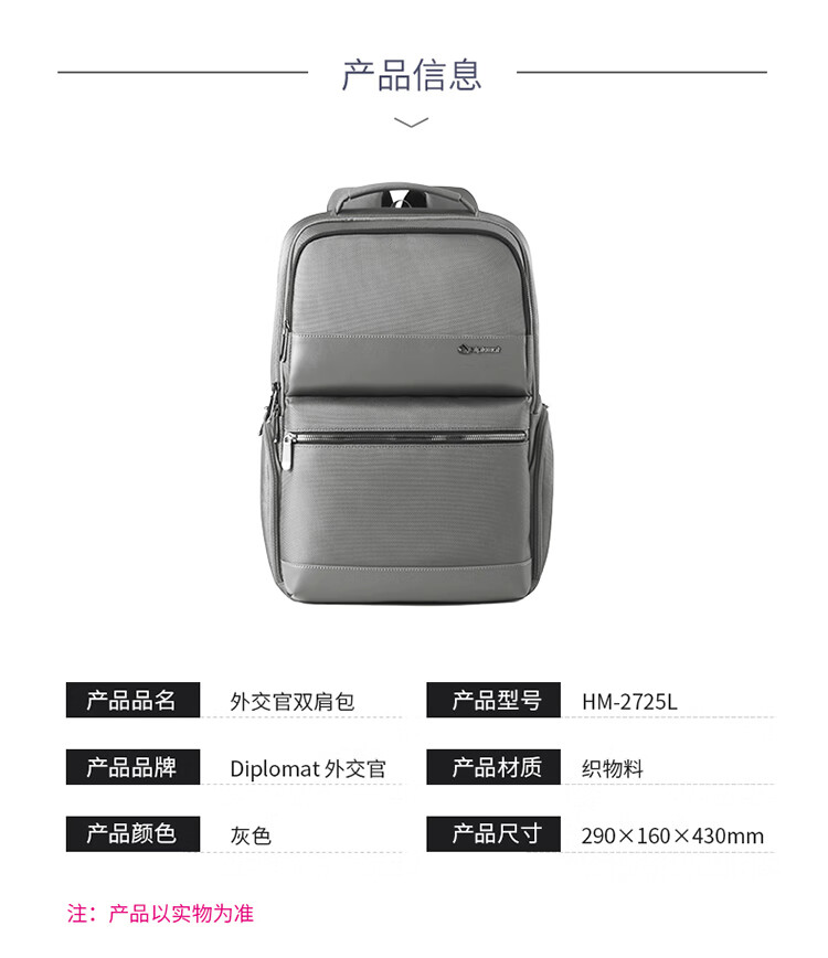 产品材质:织物料 产品颜色:灰色 外观尺寸:290*160*430mm 产品容量:20L 产品条码:6958698325544 装 箱数量:6pc
