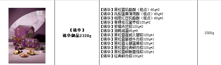 黑松露乳酪酥(糕点)60g*2 凤梨蛋黄薄荷酥(糕点)60g*2 相思红豆乳酪酥(糕点)60g*2 青稞桂花蜜枣粽120g*2 紫糯赤豆粽120g*2 海鸭咸蛋65g*8 黑松露宣威火腿粽120g*1 黑松露藤椒牛肉粽120g*1 黑松露云腿蛋黄粽120g*1 黑松露经典鲜肉粽120g*2 黑松露鲜嫩菌菇粽120g*1 经典鲜肉粽120g*2