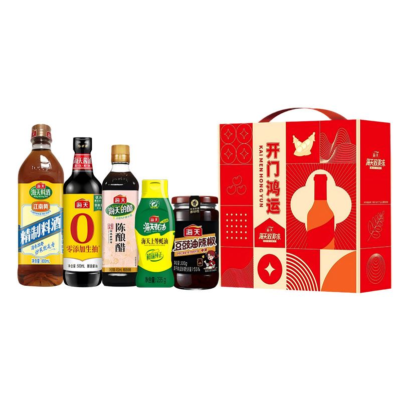 净含量:1750ml+535g 内配: 海天零添加生抽500ml*1 海天陈酿醋450ml*1 海天精制料酒800ml*1 海天豆豉油辣椒300g*1 海天上等蚝油235g*1 开门鸿运礼盒(小)*1