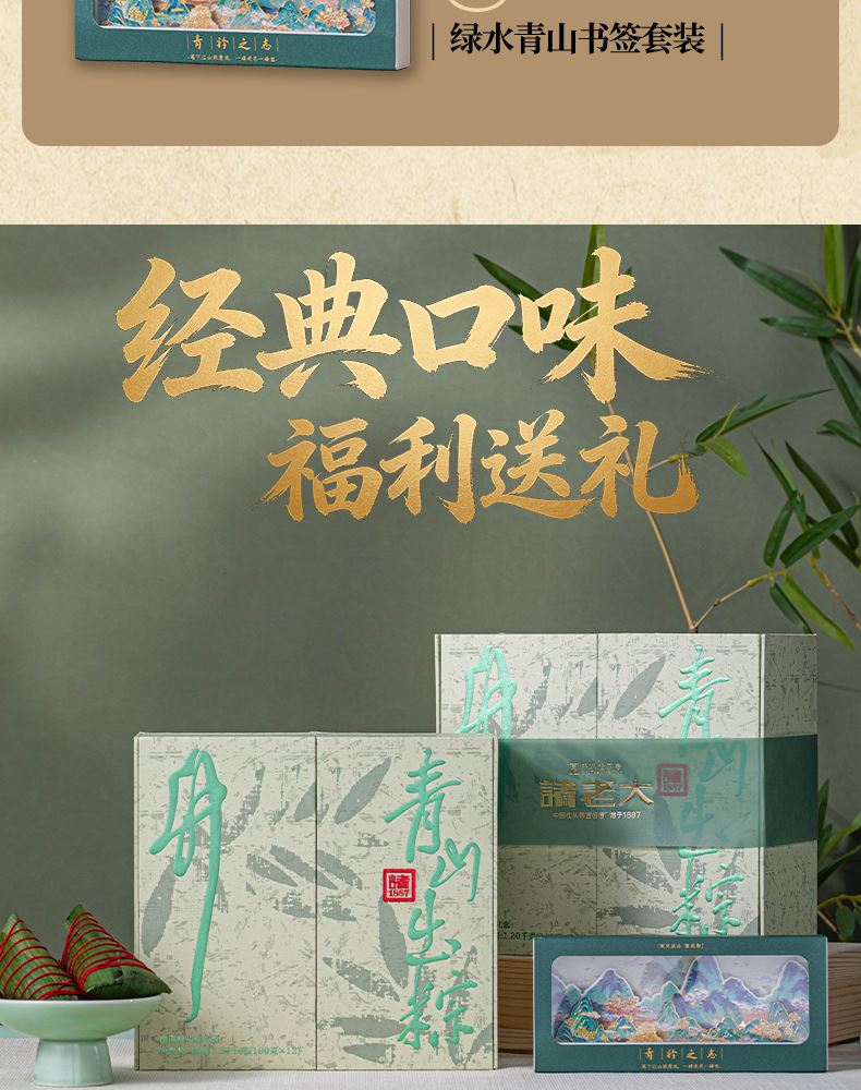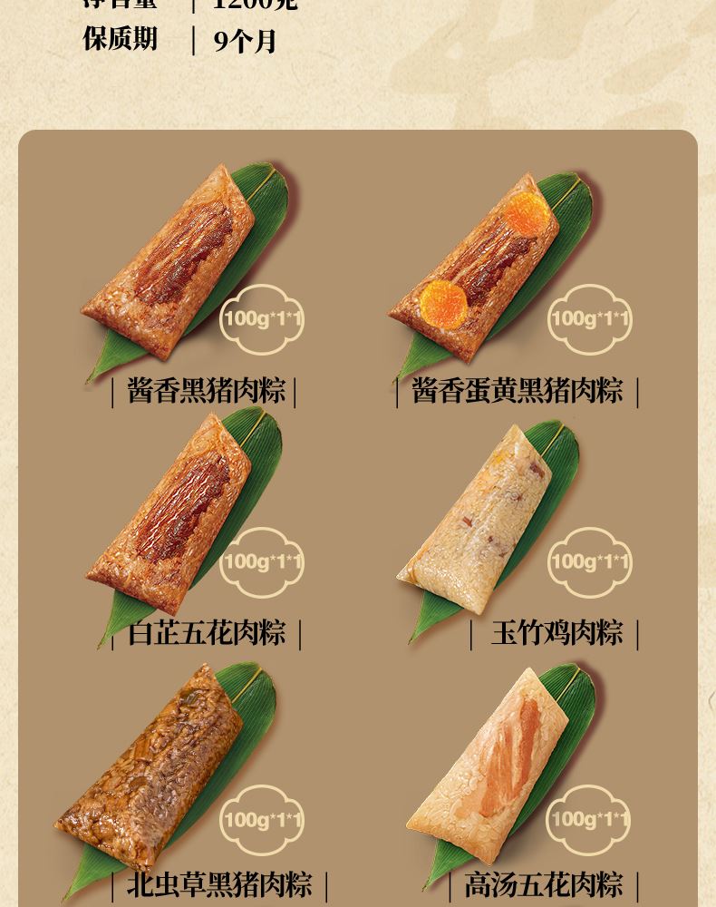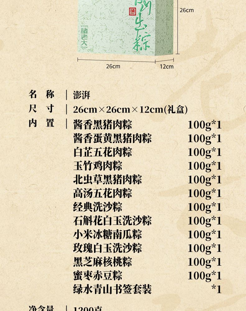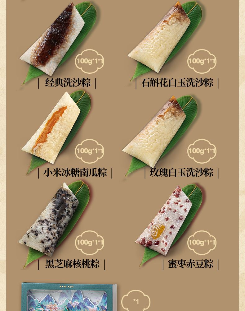 100克*1真空酱香黑猪肉粽 100克*1真空酱香蛋黄黑猪肉粽 100克*1真空白芷五花肉粽 100克*1真空玉竹鸡肉粽 100克*1真空北虫草黑猪肉粽 100克*1真空高汤五花肉粽 100克*1真空经典洗沙粽 100克*1真空石斛花白玉洗沙粽 100克*1真空小米冰糖南瓜粽 100克*1真空玫瑰白玉洗沙粽 100克*1真空黑芝麻核桃粽 100克*1真空蜜枣赤豆粽 绿水青山书签套装