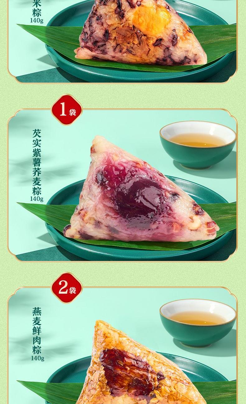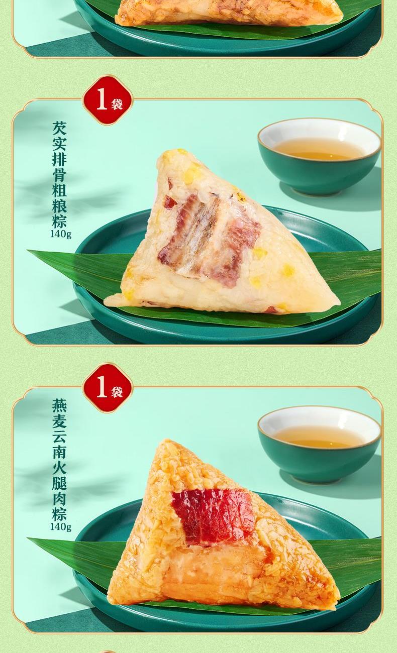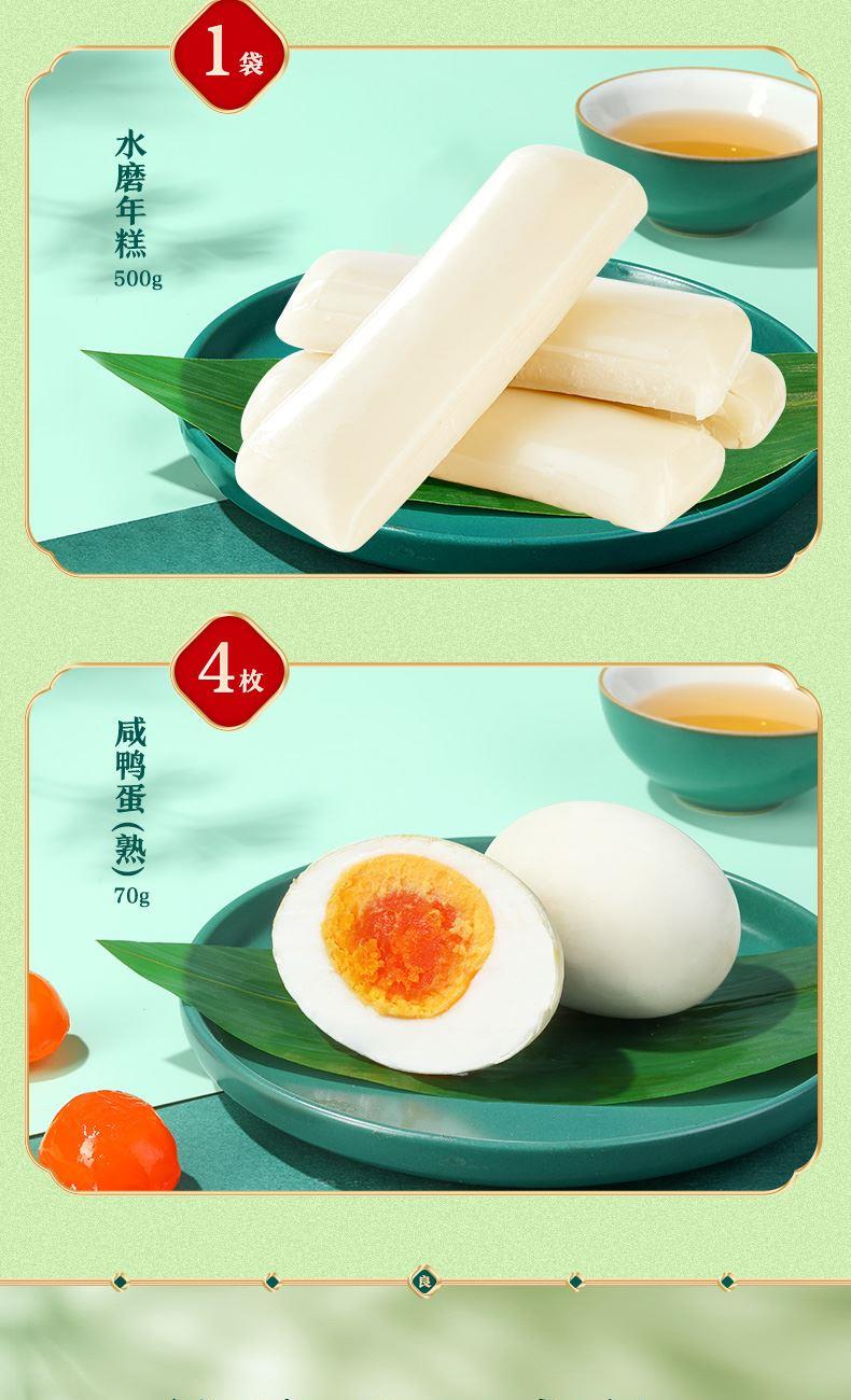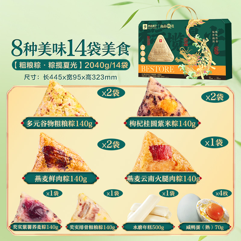 多元谷物粗粮粽140g*2 枸杞桂圆紫米粽140g*2 芡实紫薯荞麦粽140g*1 燕麦鲜肉粽140g*2 芡实排骨粗粮粽140g*1 燕麦云南火腿肉粽140g*1 水磨年糕500g*1 咸鸭蛋(熟)70g*4