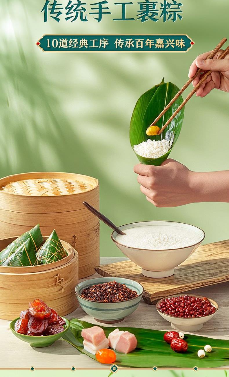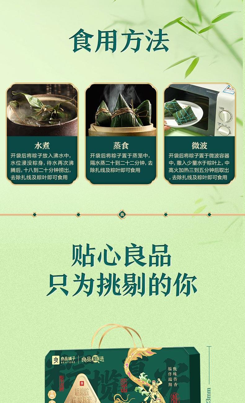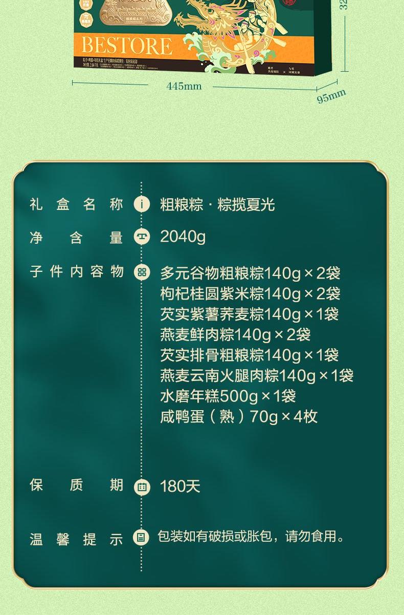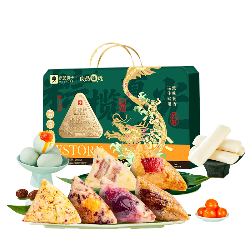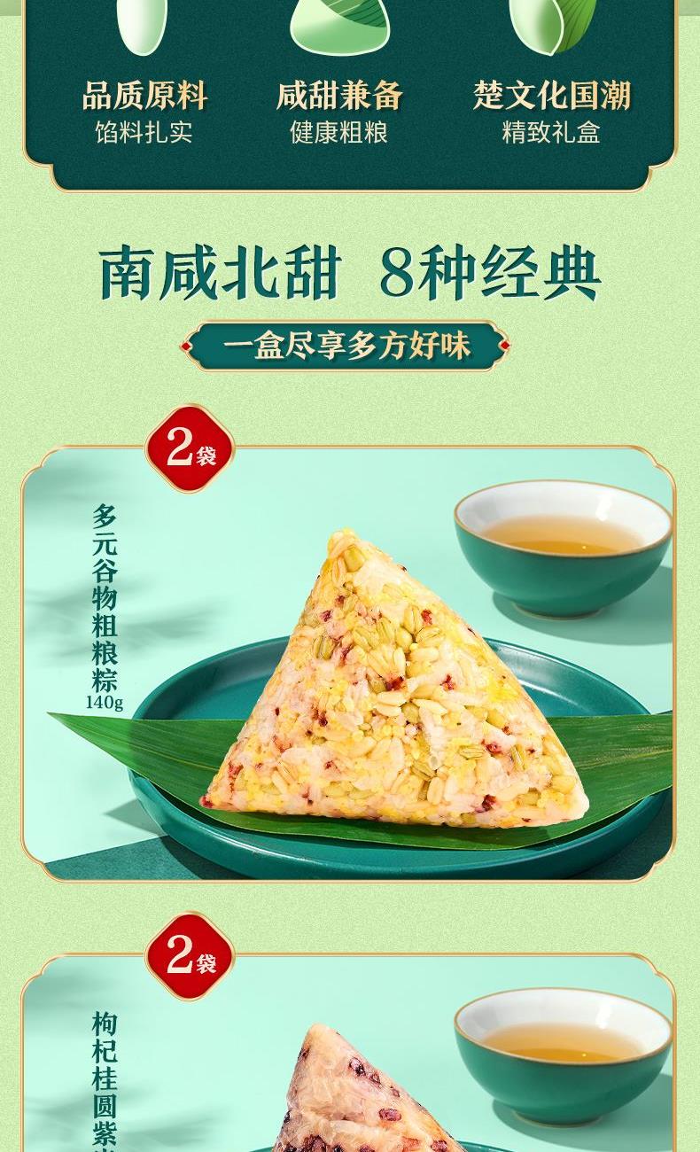 多元谷物粗粮粽140g*2 枸杞桂圆紫米粽140g*2 芡实紫薯荞麦粽140g*1 燕麦鲜肉粽140g*2 芡实排骨粗粮粽140g*1 燕麦云南火腿肉粽140g*1 水磨年糕500g*1 咸鸭蛋(熟)70g*4