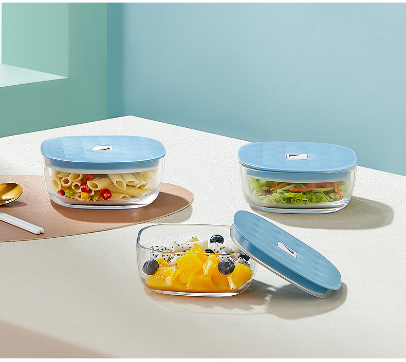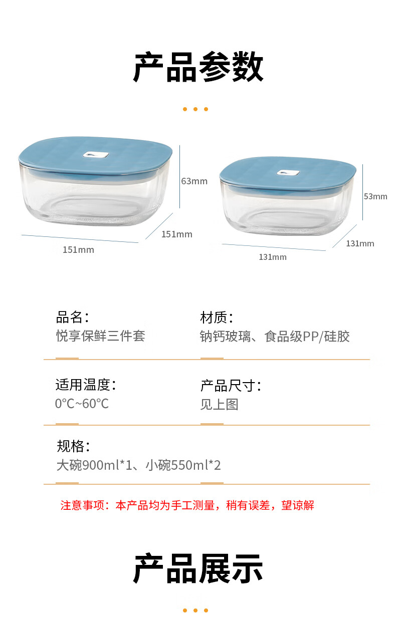 装 箱 规格:8套 /箱材 质:高白料钠钙玻璃,食品级硅胶,食品级pp产品参数:大号保鲜碗900ml*1、中号保鲜碗550ml*2彩盒尺寸:352*277*67mm 外箱尺寸:56.4*36.6*29.3cm