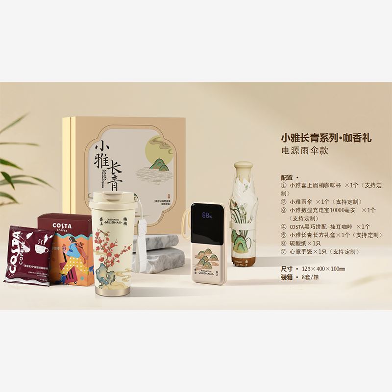 配置 · ① 小雅喜上眉梢咖啡杯 ×1个(支持定制) ② 小雅雨伞 ×1个(支持定制) ③ 小雅数显充电宝10000毫安 ×1个 (支持定制) ④ COSTA黑巧拼配-挂耳咖啡 ×1个 ⑤ 小雅长青长方礼盒×1个(支持定制) ⑥ 硫酸纸×1只 ⑦ 心意手袋×1只(支持定制) 尺寸 · 125×400×100mm 装 箱 · 8套 /箱