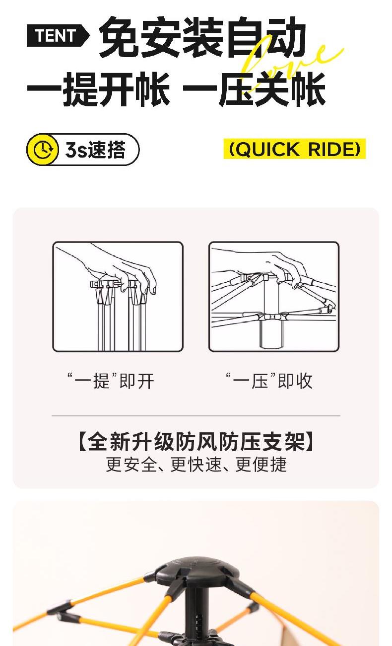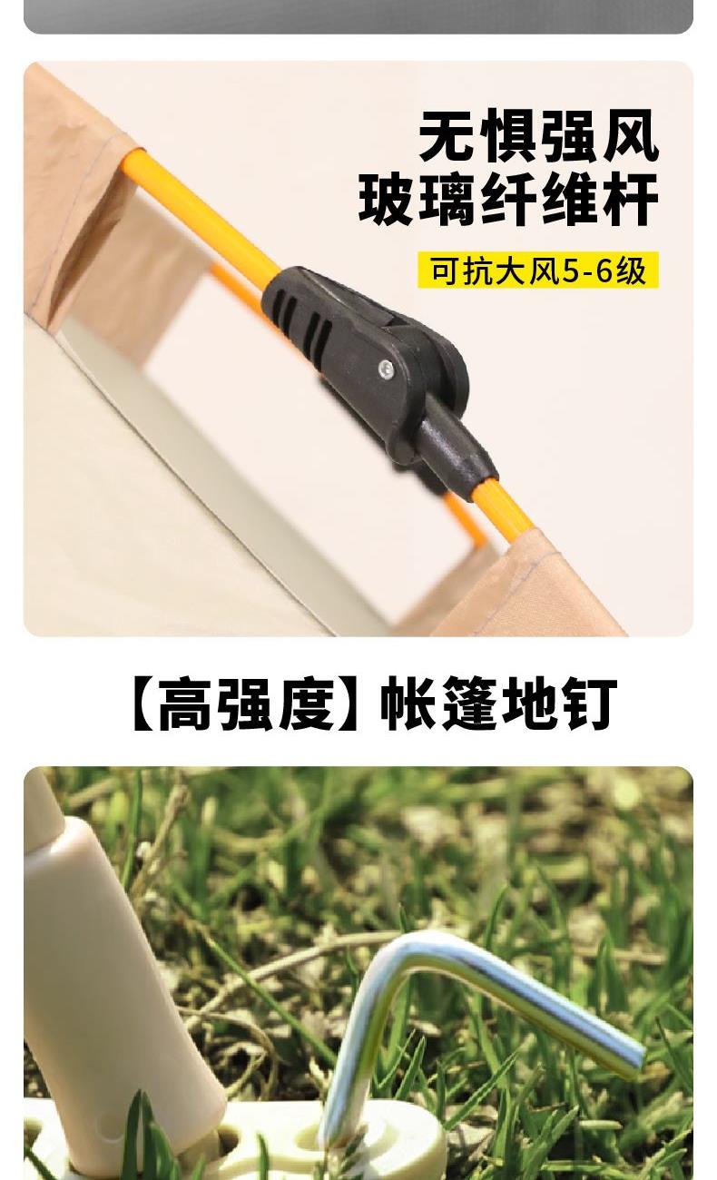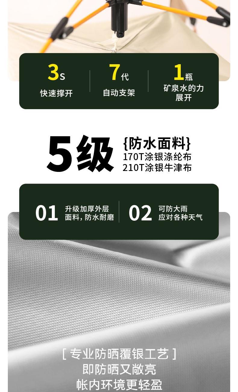 规格:200×150×115cm 材质:170T涂银涤纶布、210T涂银牛津布、自动 弹簧玻璃纤维杆 配置:铁地钉*8、调节防风绳*4、风扣*4 条形码:6978388730021