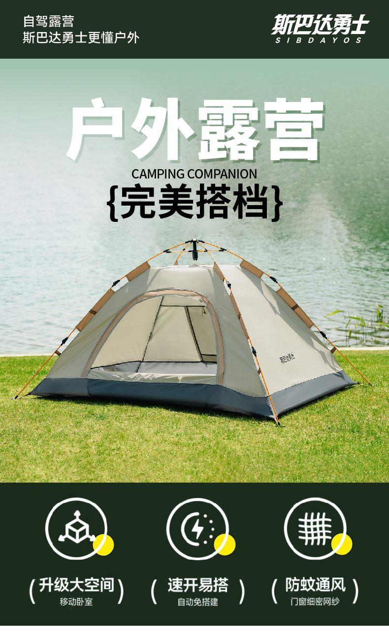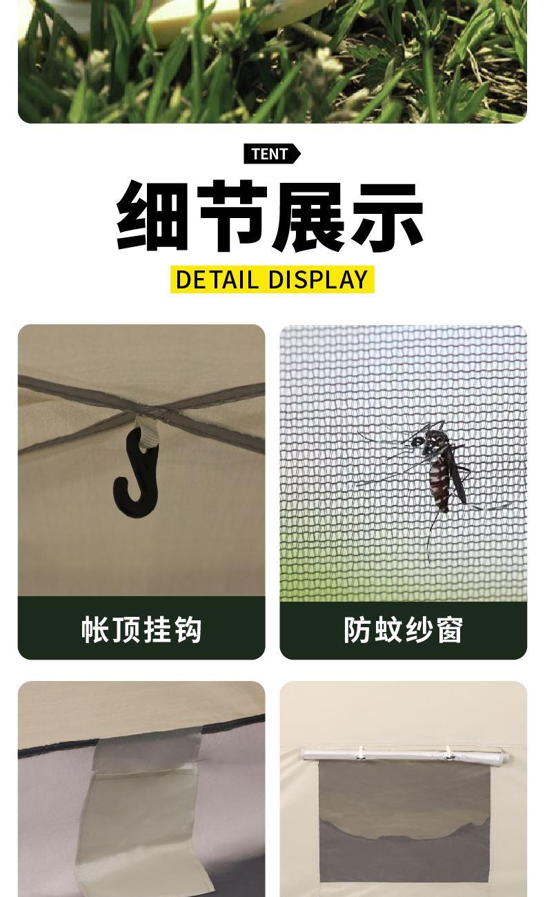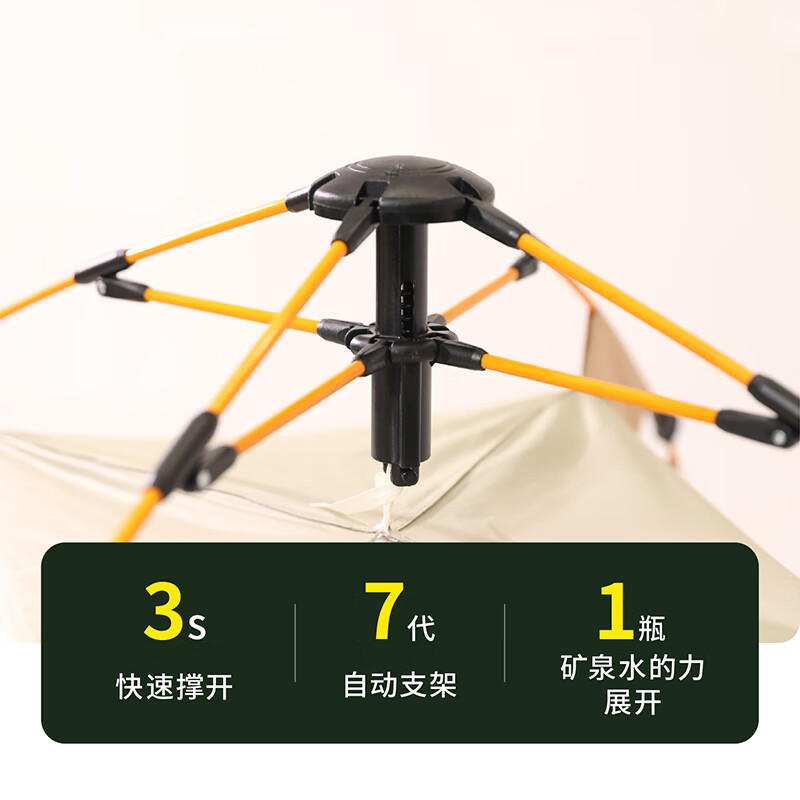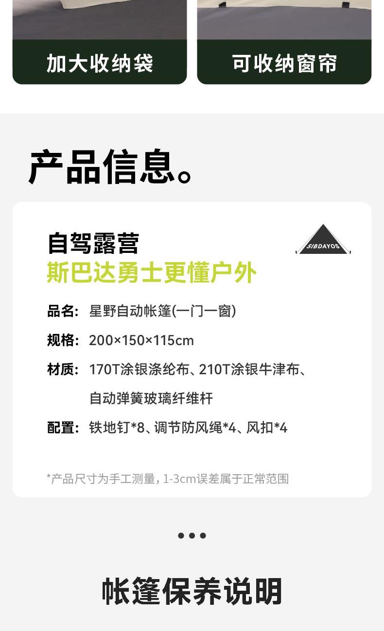 规格:200×150×115cm 材质:170T涂银涤纶布、210T涂银牛津布、自动 弹簧玻璃纤维杆 配置:铁地钉*8、调节防风绳*4、风扣*4 条形码:6978388730021