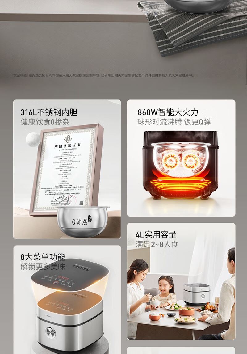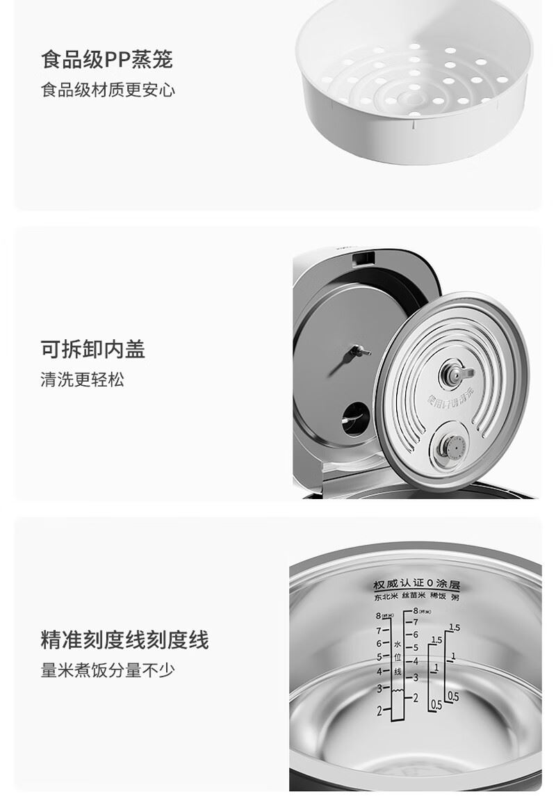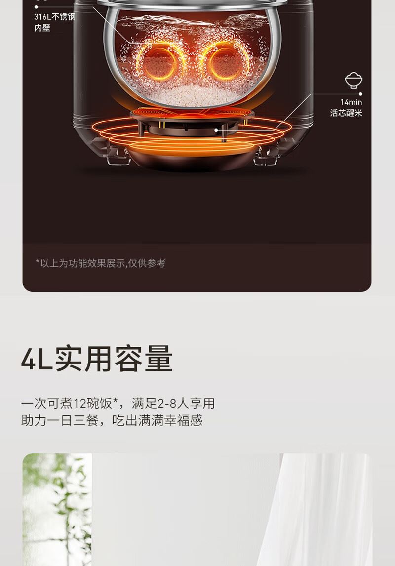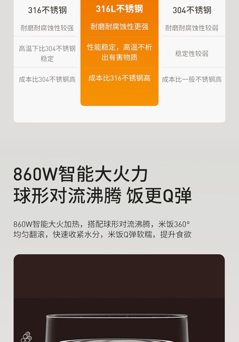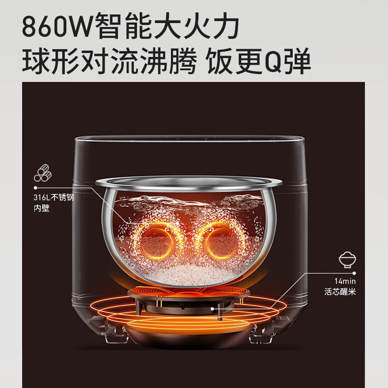 1、316L 不锈钢内胆,使用安全健康 2、4L家庭用量,满足全家需求。 3、860W 猛火煮沸, 4、品质保障,24小时智能预约 5、5A级好米饭 美味不久等
