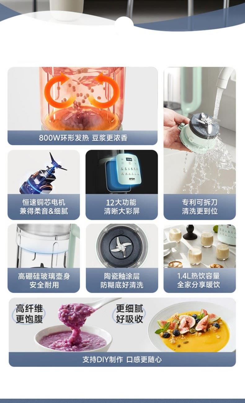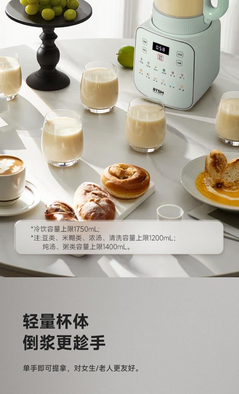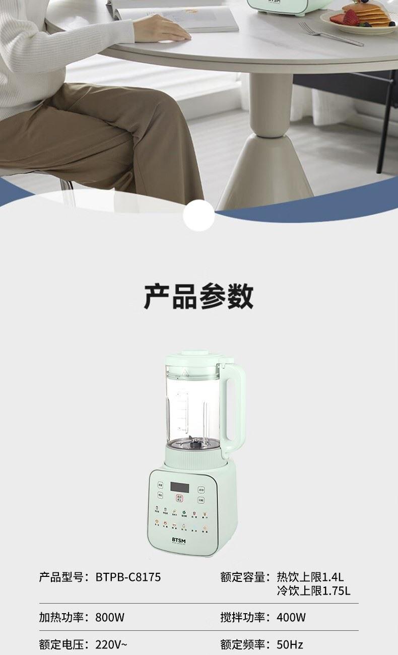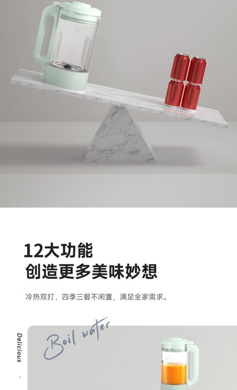 加热功率:800W 搅拌功率:400W 额定电压/频率:220V~ 50Hz 额定容量:热饮大容量:1.4L 冷饮大容量:1.75L 电机转速:23000转/分钟 产品净重:3.0kg 产品材质:PP、ABS、高硼硅玻璃、钢 条形码:6971679081321 装 箱数:1*1 产品尺寸:200*180*440mm 邮购箱尺寸:388*245*303mm 装 箱清单:主机*1、杯身*1、精钢刀组*1、杯盖*1、刷子*1、量杯*1、说明书*1