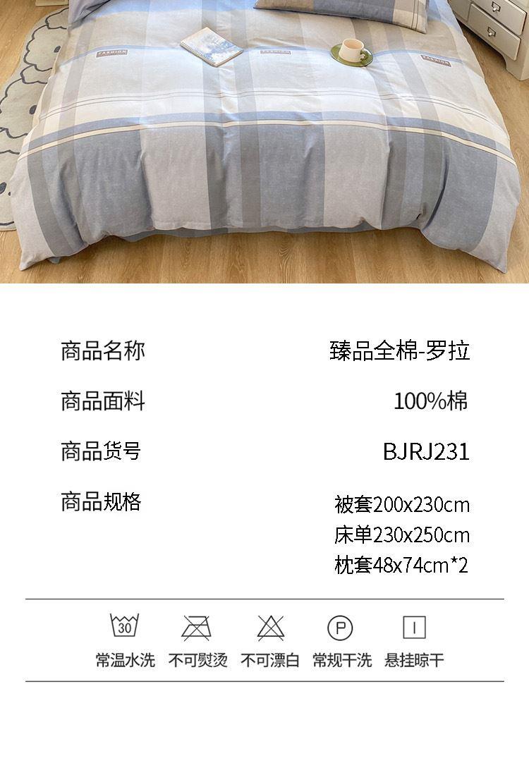 货 号:BJRJ231 材 质:100 %棉 规 格:被套200x230cm 床单230x250cm 枕套48x74cm*2 包 装:北极绒简易盒/天地盖 装 箱数:20套 / 箱