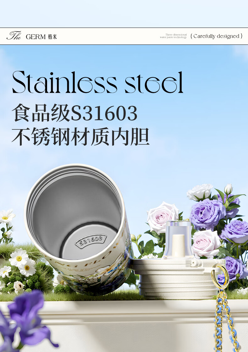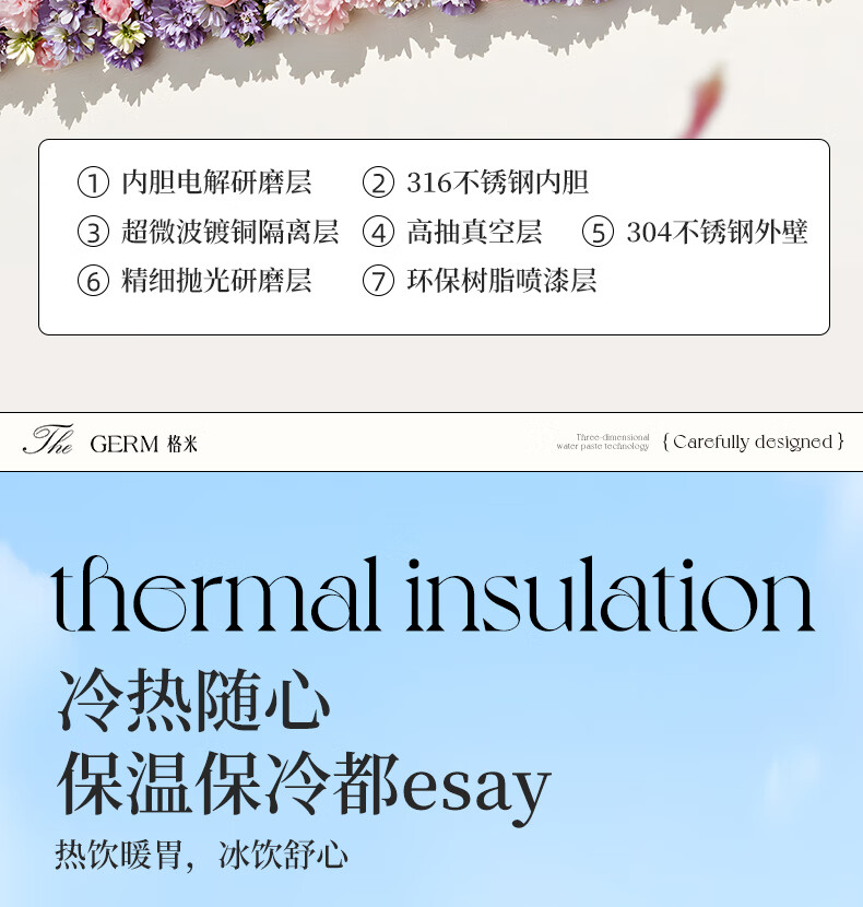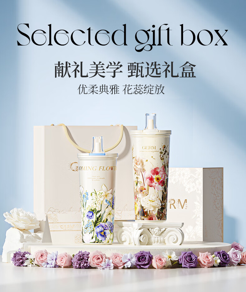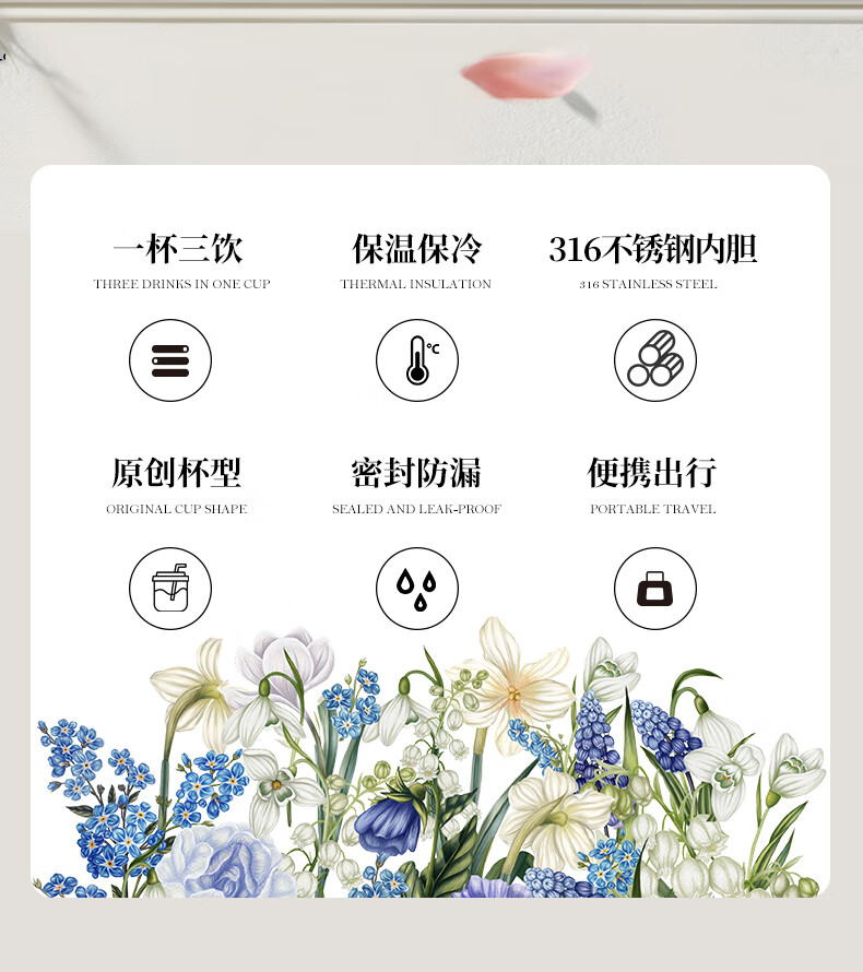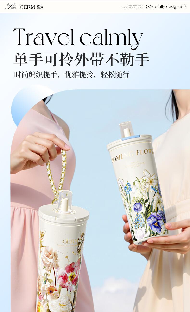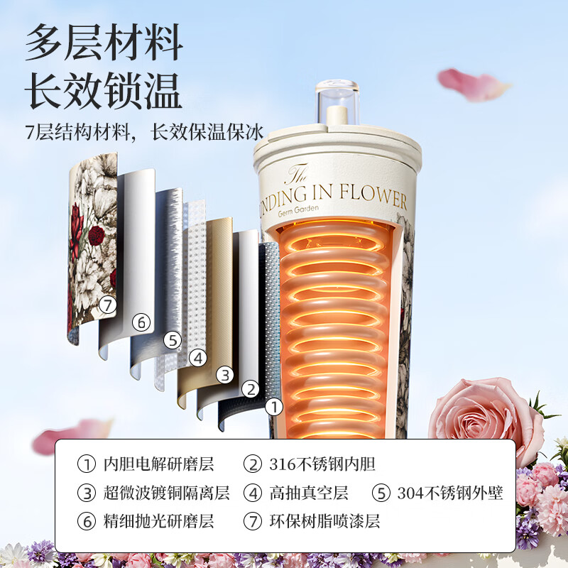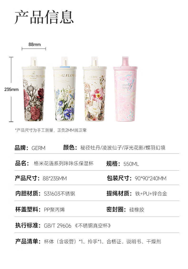 颜色: 凌波仙子 / 秘径牡丹 产品规格:550mL 材质:内胆 - 316不锈钢; 外壳 - 304不锈钢; 杯盖塑件/吸管 - PP; 密封圈/密封塞 - 硅橡胶包装尺寸:90*90*240mm 装 箱明细:20pcs/ 箱