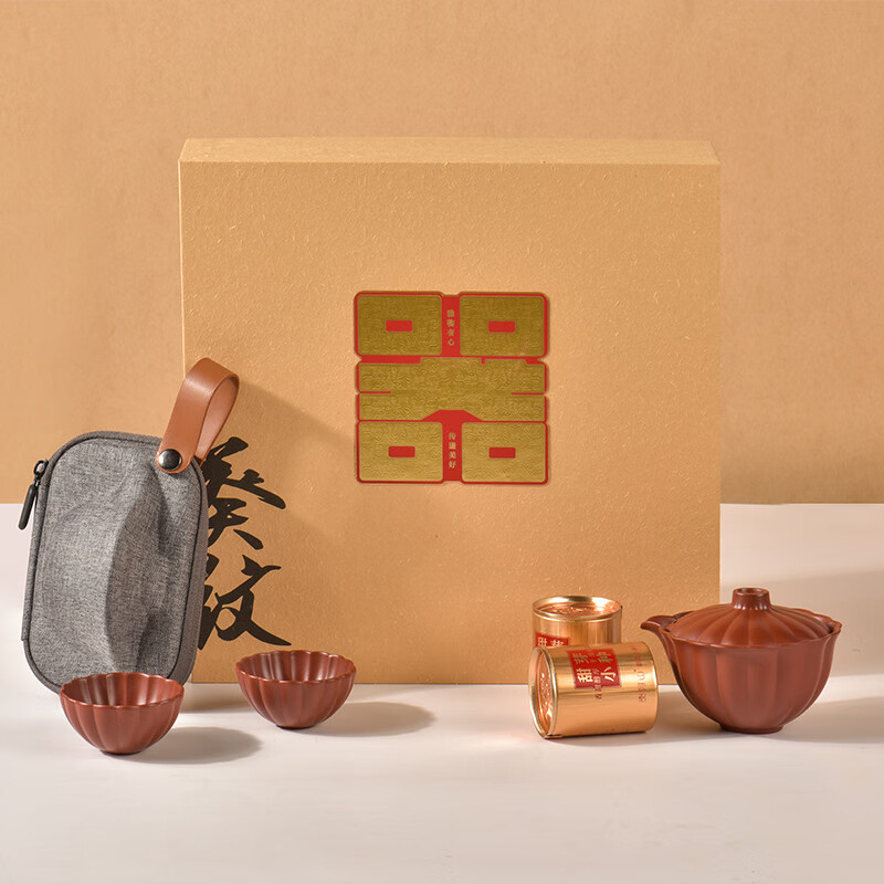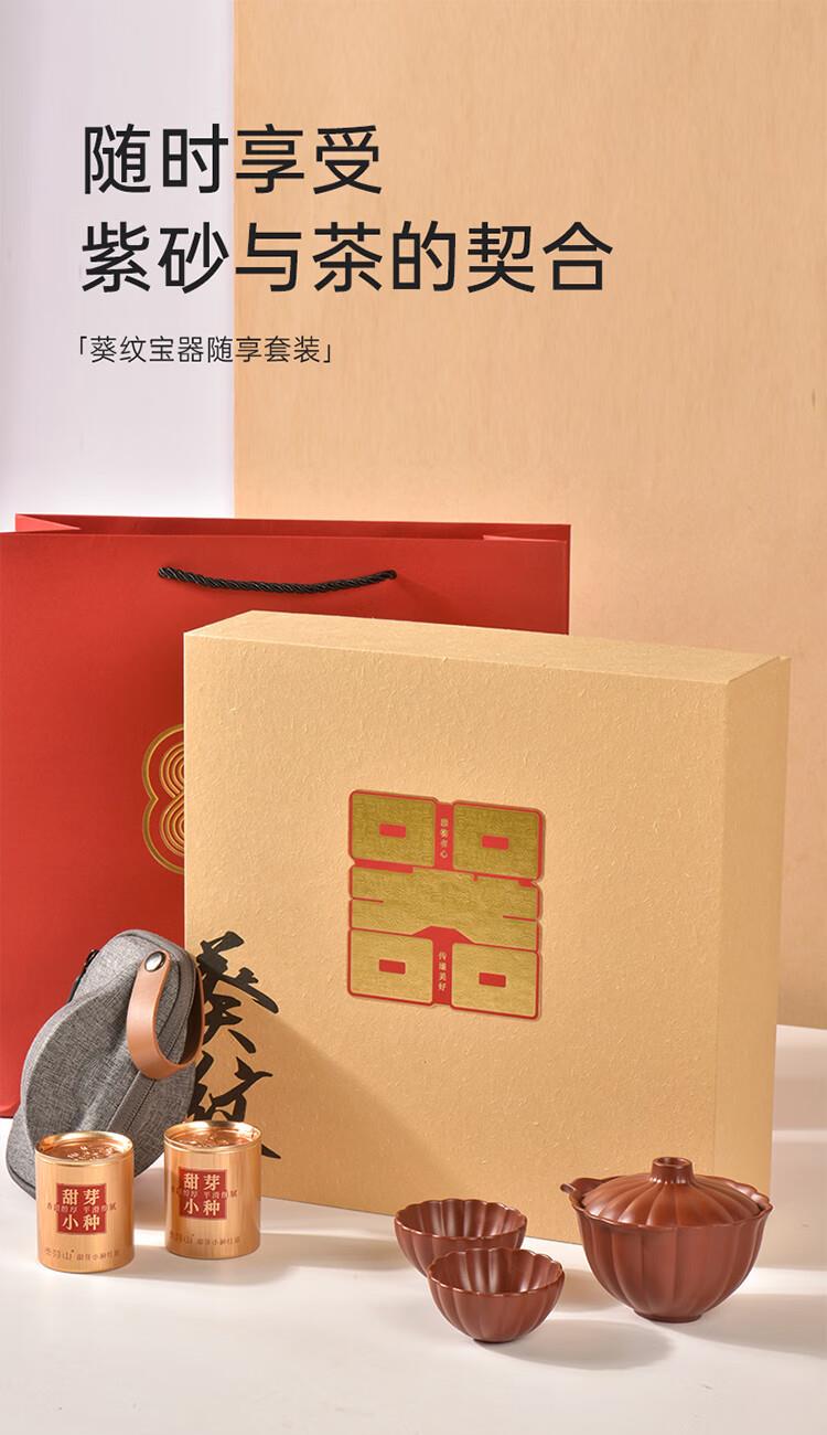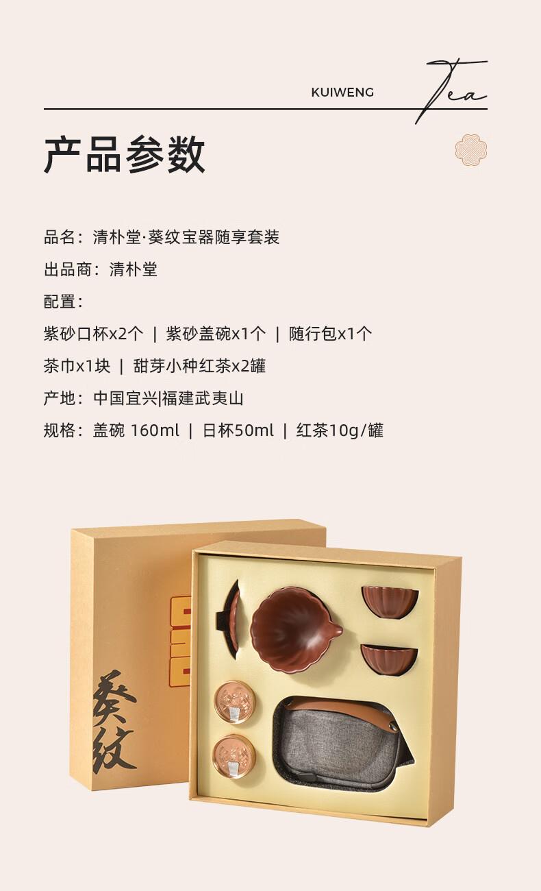 ①葵纹宝器·紫砂泡壶 ×1只 ②葵纹品茗葵纹杯 ×2只 ③差旅随身包(绅士灰) ×1只(支持定制) ④洁方茶巾 ×1块 ⑤甜芽小种红茶(10g)×2罐 ⑥精美礼盒×1套(支持定制) ⑦心意手袋×1只(支持定制) 尺寸 · 290×290×95mm(盒)丨315×110×325mm(袋) 装 箱 · 10套 /箱