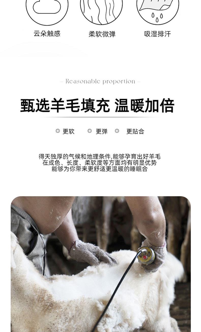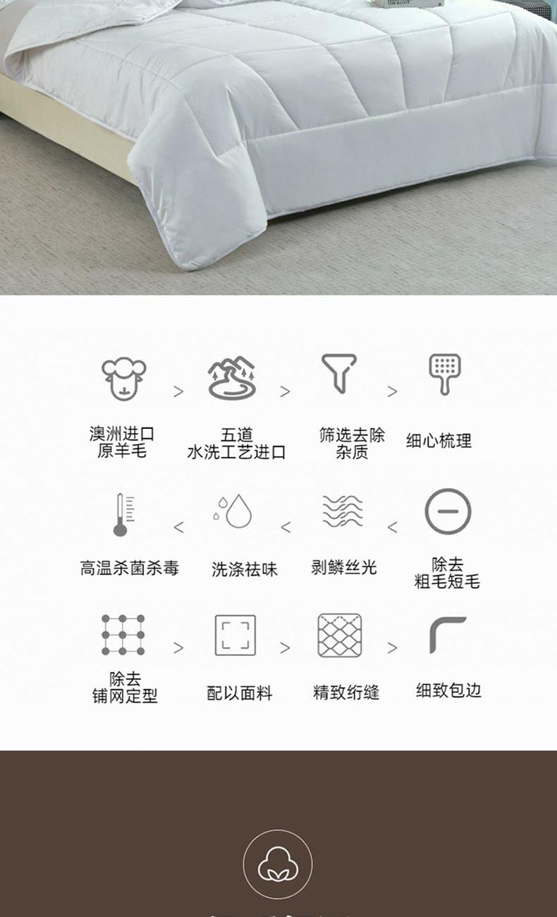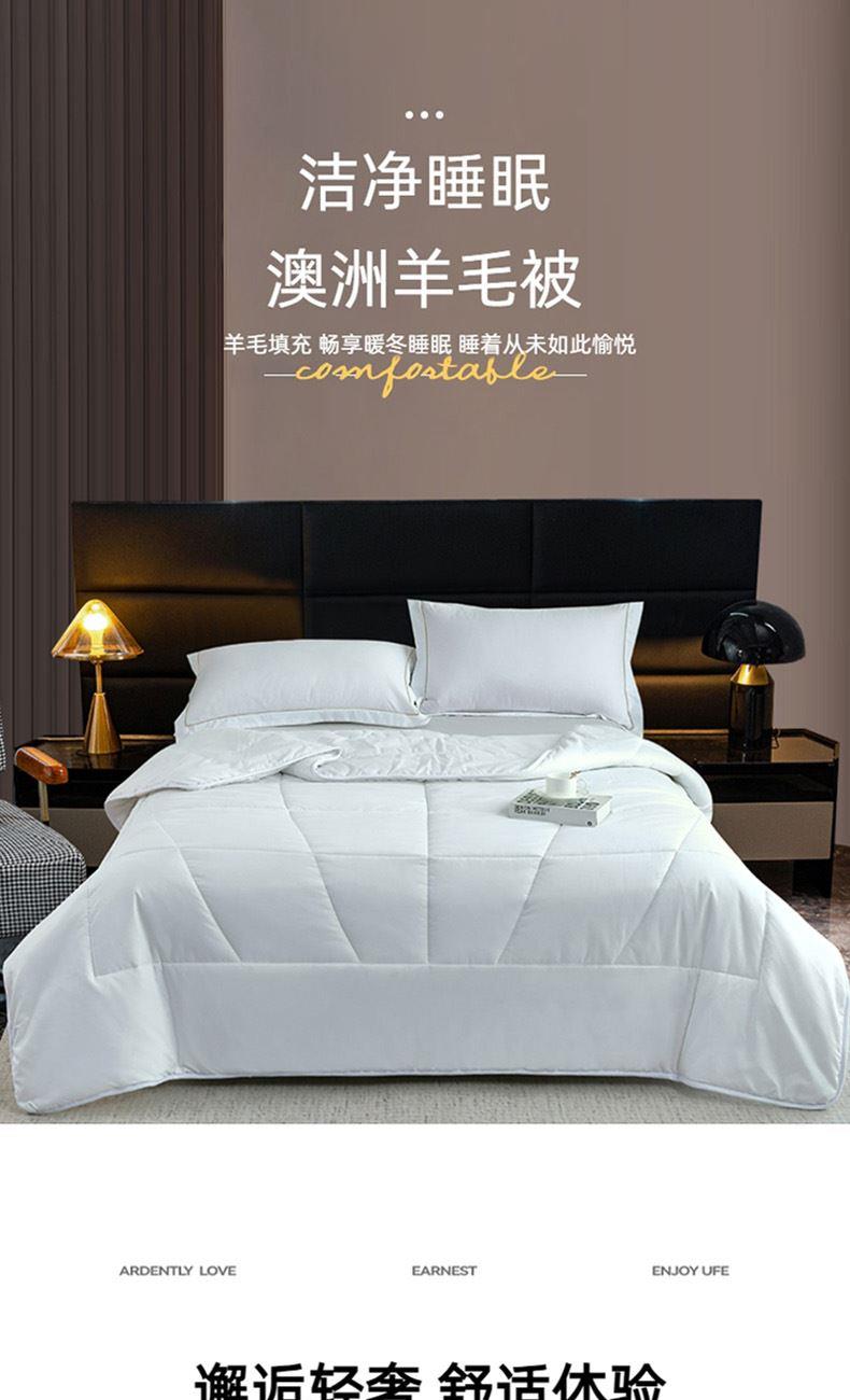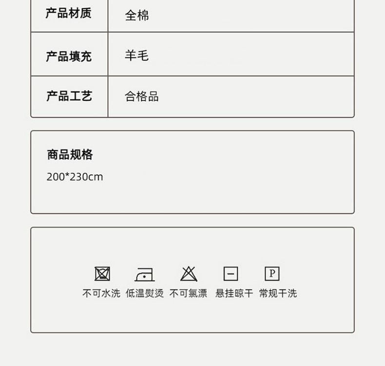 规 格:200*230cm/2600g 面 料:高密磨毛布(聚酯纤维) 填 充:51%羊毛+49%聚酯纤维 装 箱数:8床/箱或30床/包