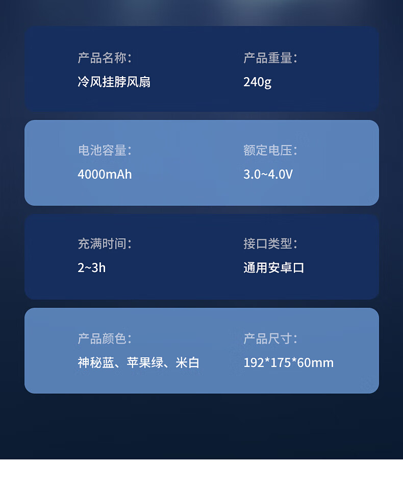 产品颜色:米白 蓝色 绿色 产品尺寸:20*19.7*6cm 产品材质:ABS环保材料 输入电流:1A 电池容量:3000mAH 功 率:5W 使用时间:3-7小时 产品重量:311g 装 箱数量:40个 装 箱重量:17kg 彩盒尺寸:21.5*18.5*6.2cm 装 箱尺寸: 66.5*38.5*44cm
