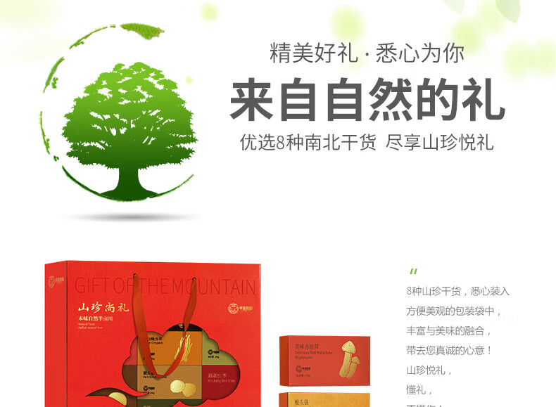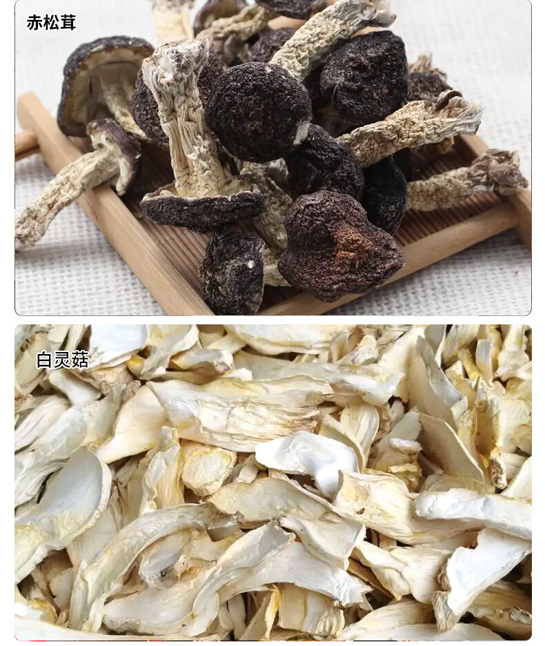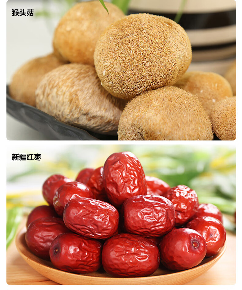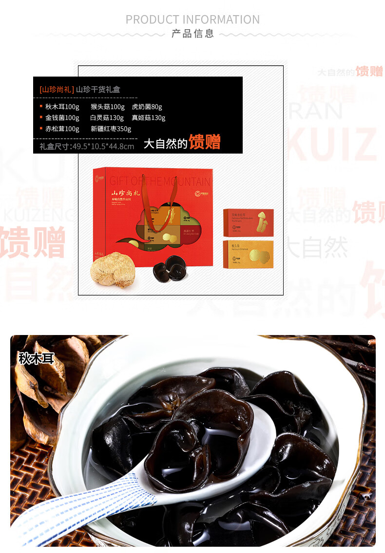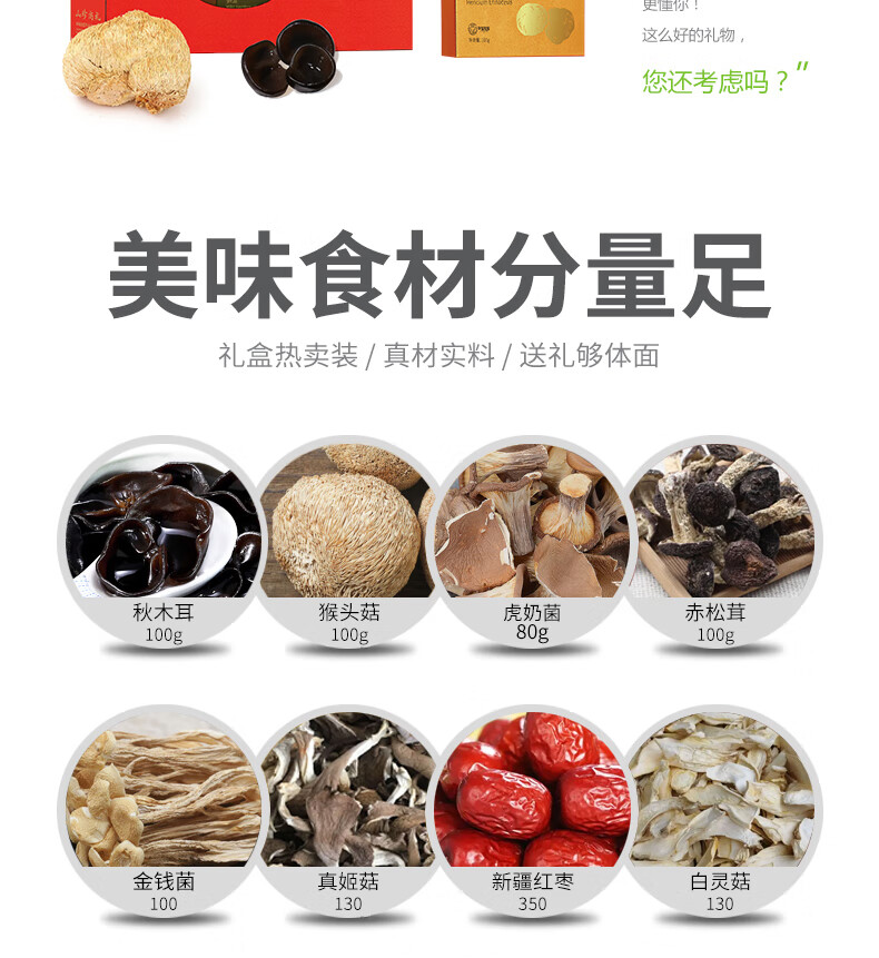 野生秋木耳100g、野生猴头菇100g野生虎奶菌80g、精选金钱菌100g精选白灵菇130g、精选真姬菇130g野生赤松茸100g、新疆红枣350g