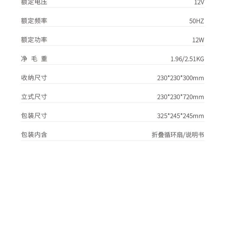 额定电压:12V / 额定功率:12W 伸缩杆:6063航天铝合金材质 预约定时:8小时 伸缩长度:7节可调 控制方式:遥控/液晶触控 充电方式:Type-C充电口 收纳尺寸:230*230*300mm 立式尺寸:230*230*720mm 包装尺寸:320*240*240mm