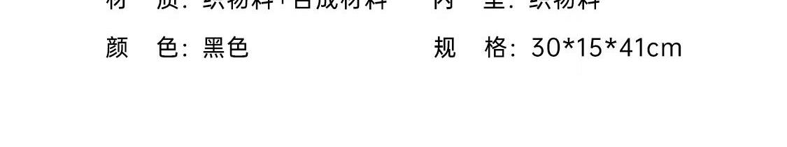 产品材质:织物料+合成材料 产品颜色:黑色 外观尺寸:300*150*410mm 产品容量:20L 产品条码:6958698322925 装 箱数量:6pc