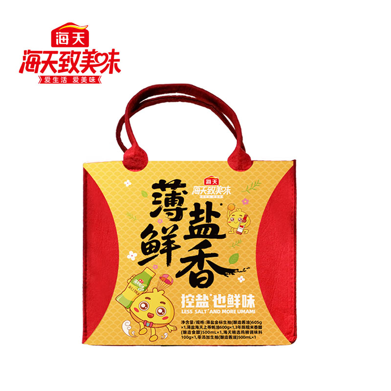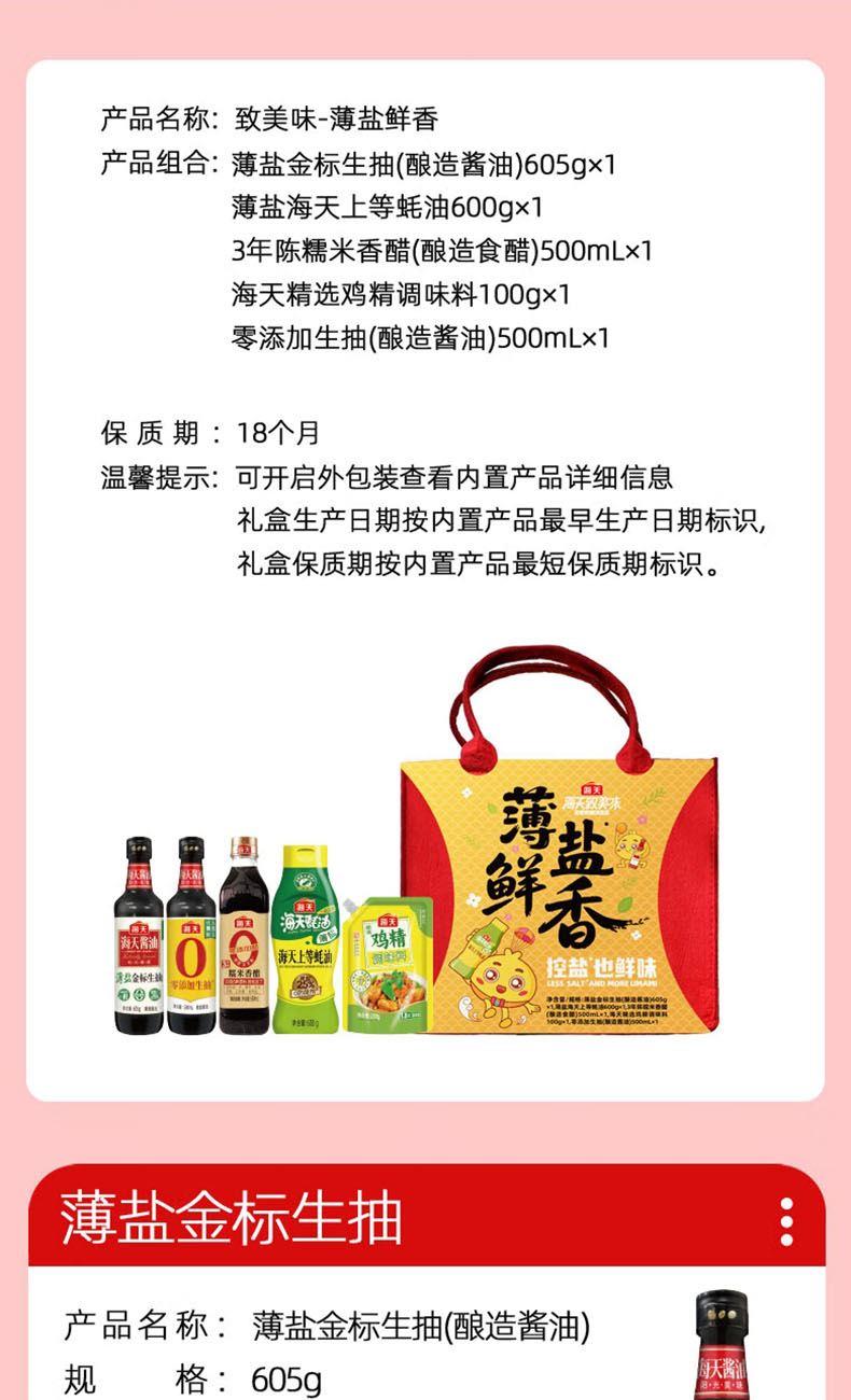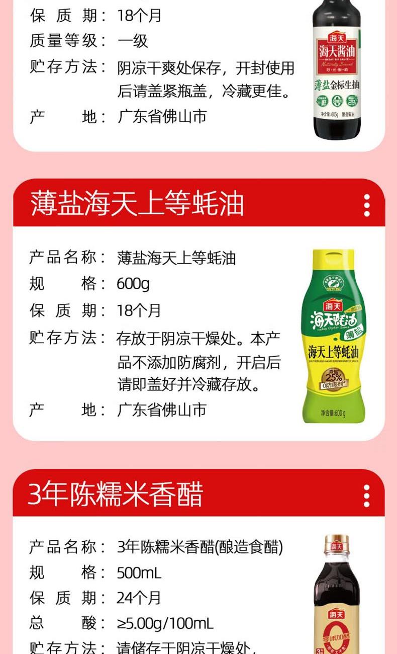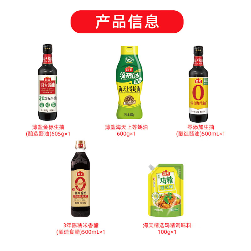 净含量:1000ml+1305g 内配: 薄盐金 标生抽(酿造酱油)605g*1 薄盐海天上等蚝油600g*1 3年陈糯米香醋500mL*1 零添加生抽500mL*1 海天精选鸡精调味料100g*1
