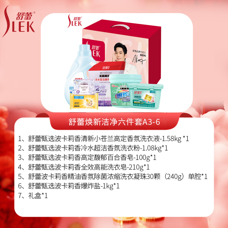 组合明细: 1、舒蕾甄选波卡莉香清新小苍兰高定香氛洗衣液-1.58kg *1 2、舒蕾甄选波卡莉香冷水超洁香氛洗衣粉-1.08kg*1 3、舒蕾甄选波卡莉香高定馥郁百合香皂-100g*1 4、舒蕾甄选波卡莉香全效高能洗衣皂-210g*1 5、舒蕾波卡莉香精油香氛除 菌浓缩洗衣凝珠30颗(240g)单腔*1 6、舒蕾甄选波卡莉香爆炸盐-1kg*1 7、礼盒*1