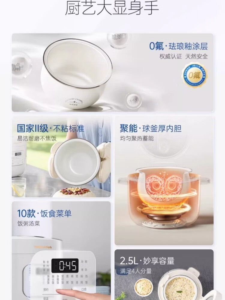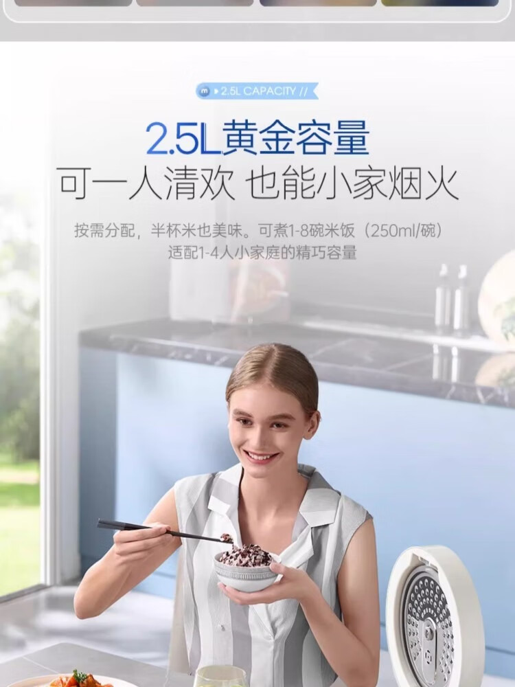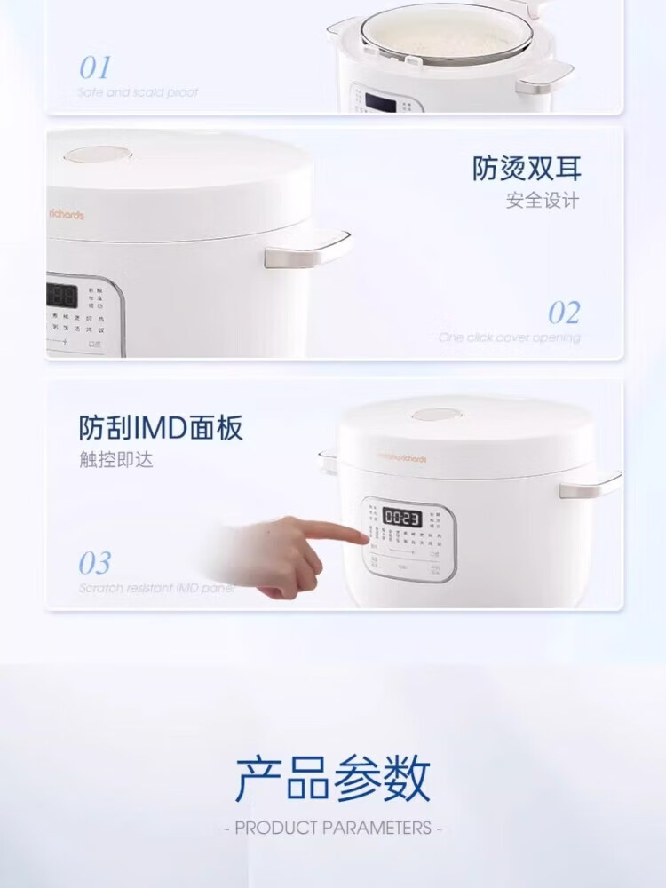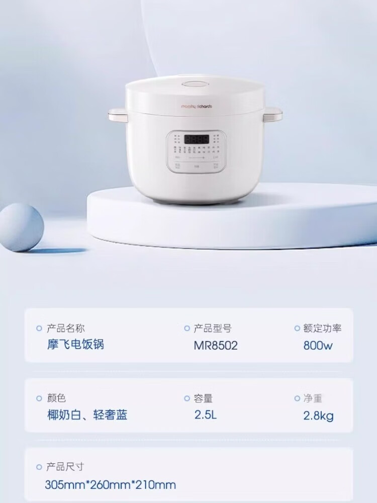 功率:800W 重量:3.75kg 装 箱数:1台 /箱 容量:2.5L 产品尺寸: 261.5*306.5*215 外箱尺寸: 310*304*274 颜色:白色、蓝色