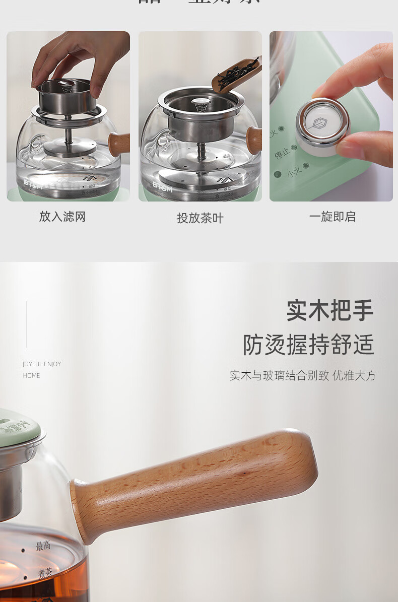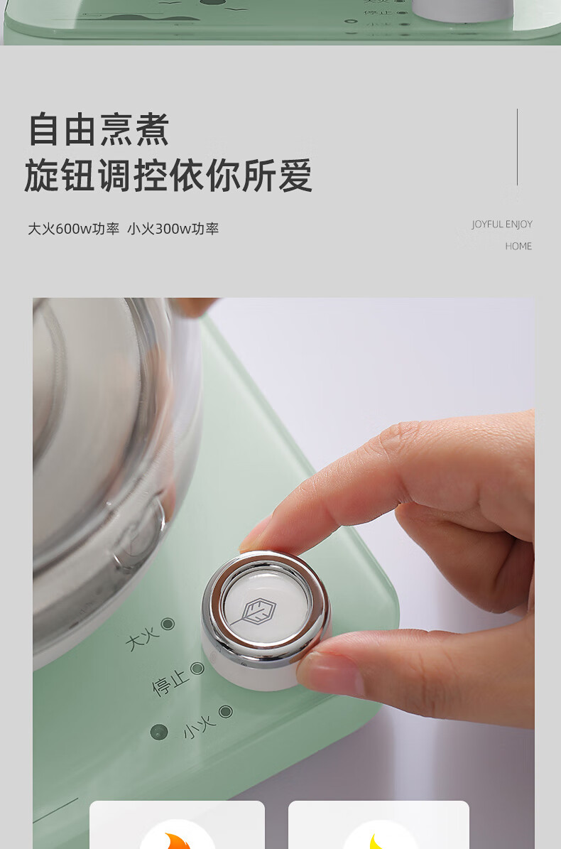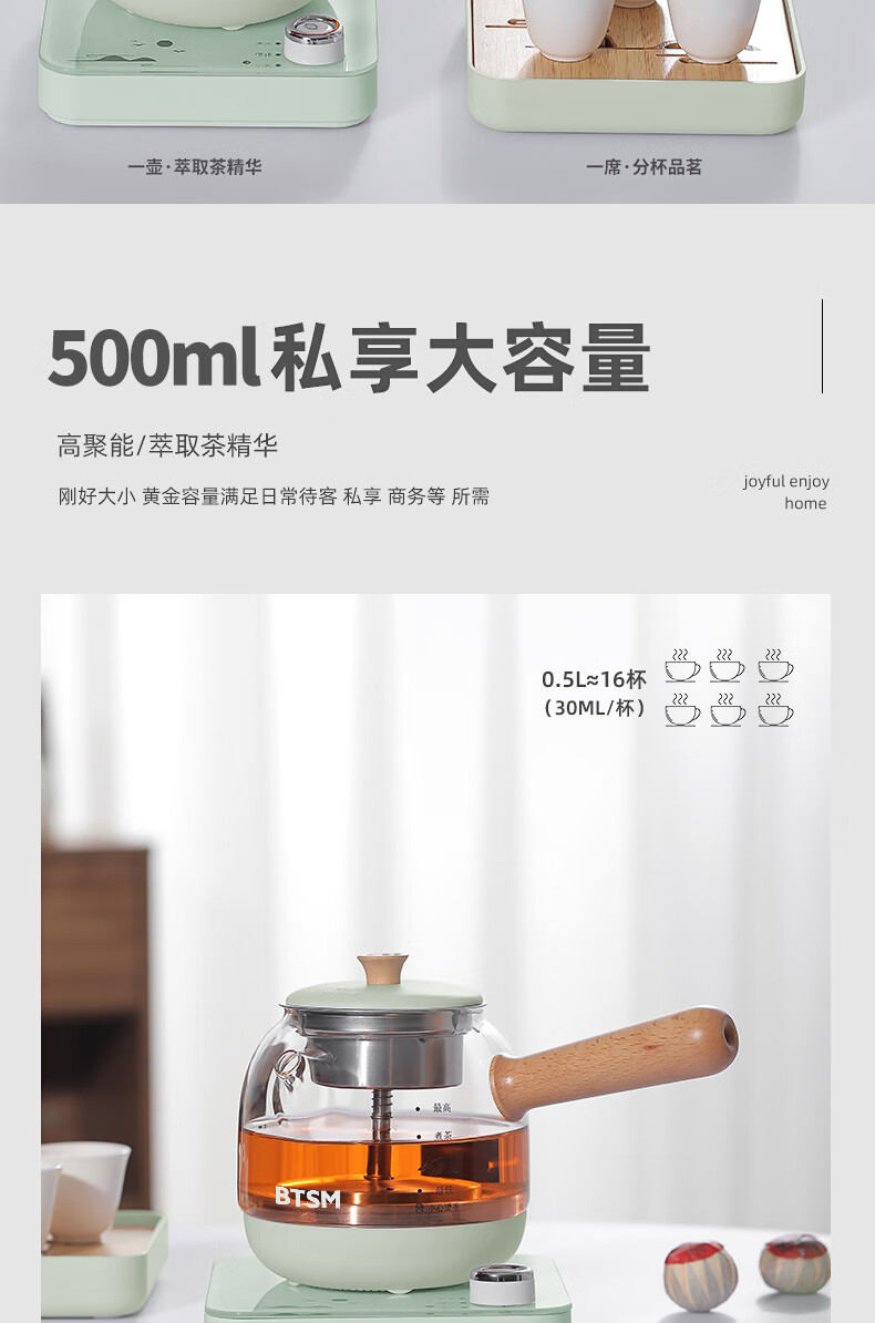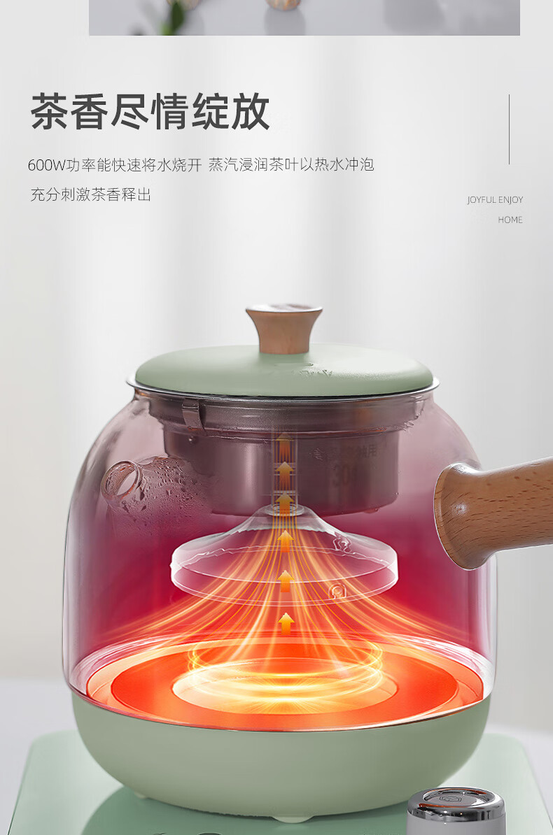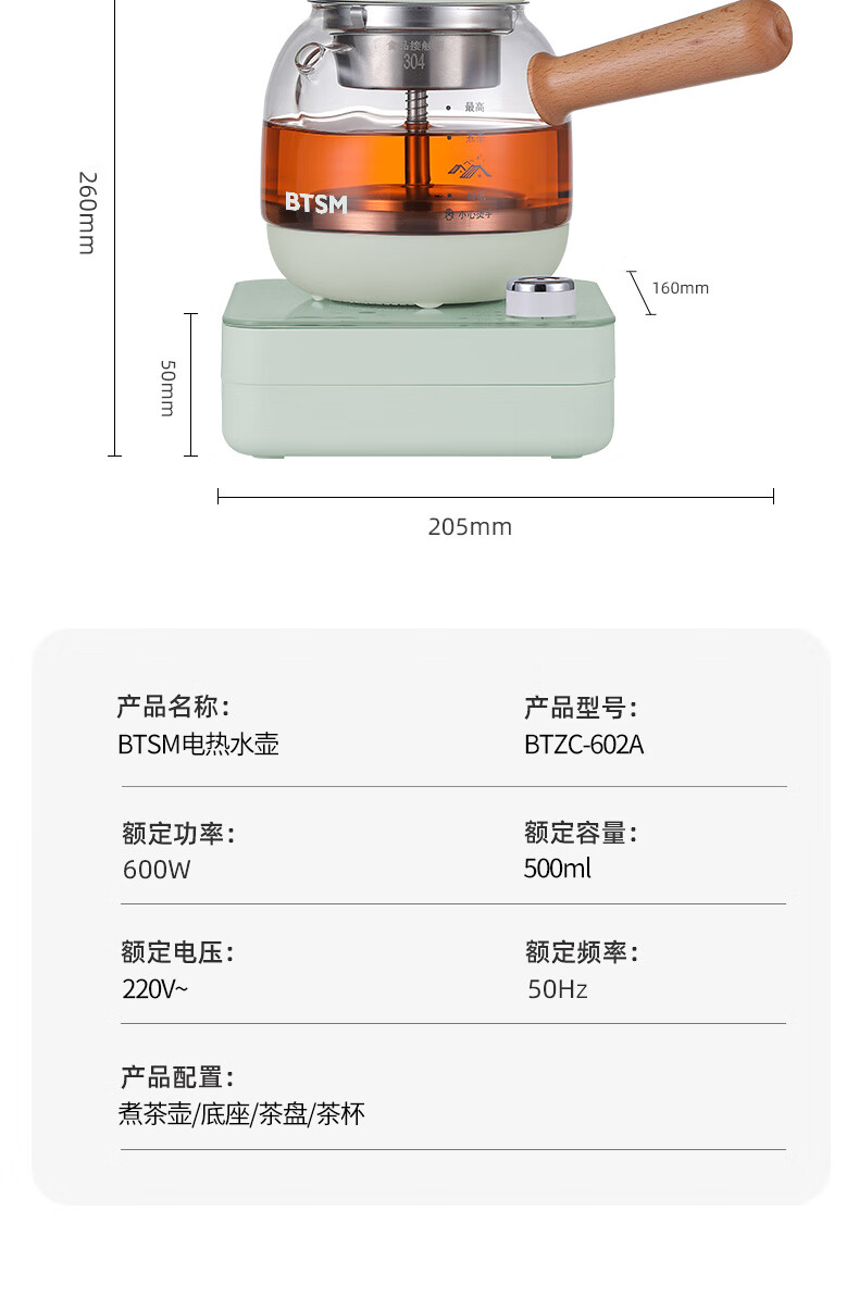 额定功率:600W 额定电源:220V~50Hz 额定容量:500ml 产品净重:1.28kg 产品材质:高硼硅胶玻璃、304不锈钢 条形码:6971679080669 装 箱数:1*1 产品尺寸:260*168*221mm 彩箱尺寸:355*212*208mm 邮购箱尺寸:365*212*218mm 装 箱清单:底座*1、壶体*1、蒸茶网*1、陶瓷杯*3、竹盘*1、盖子*1、电源线*1、说明书*1