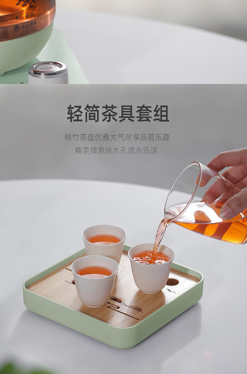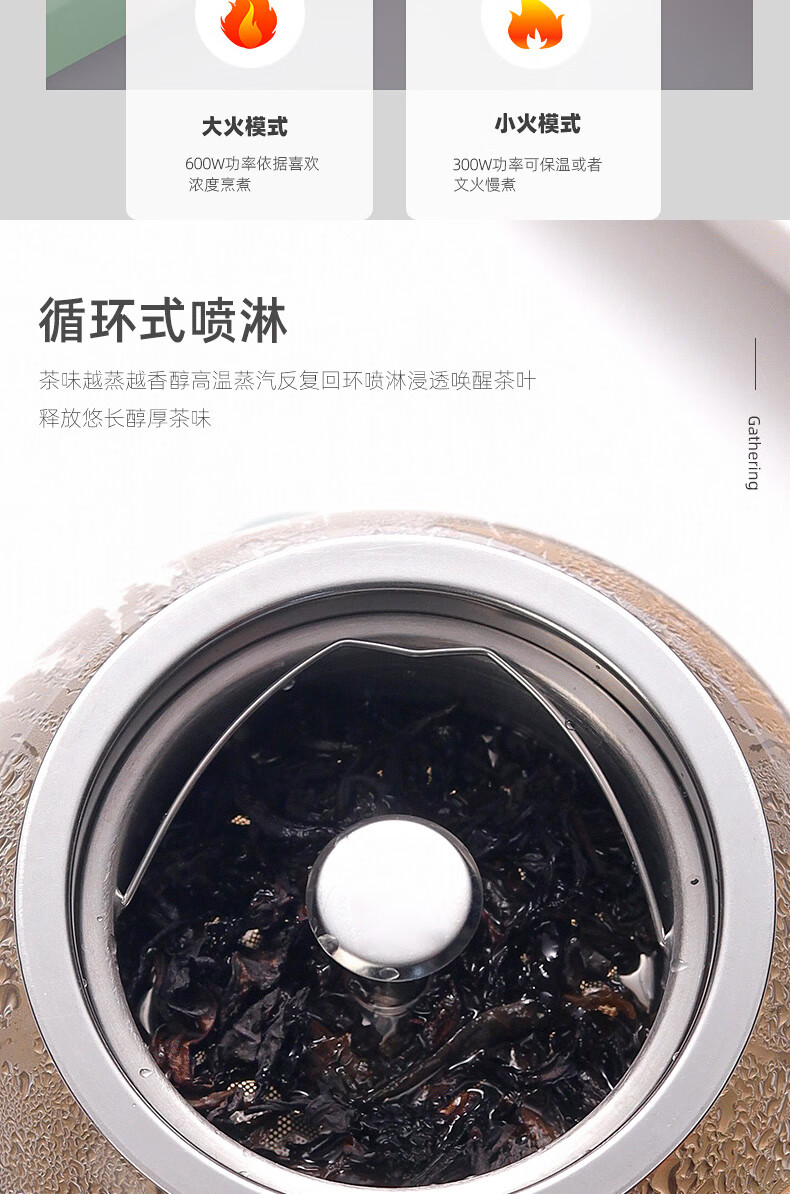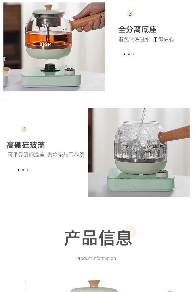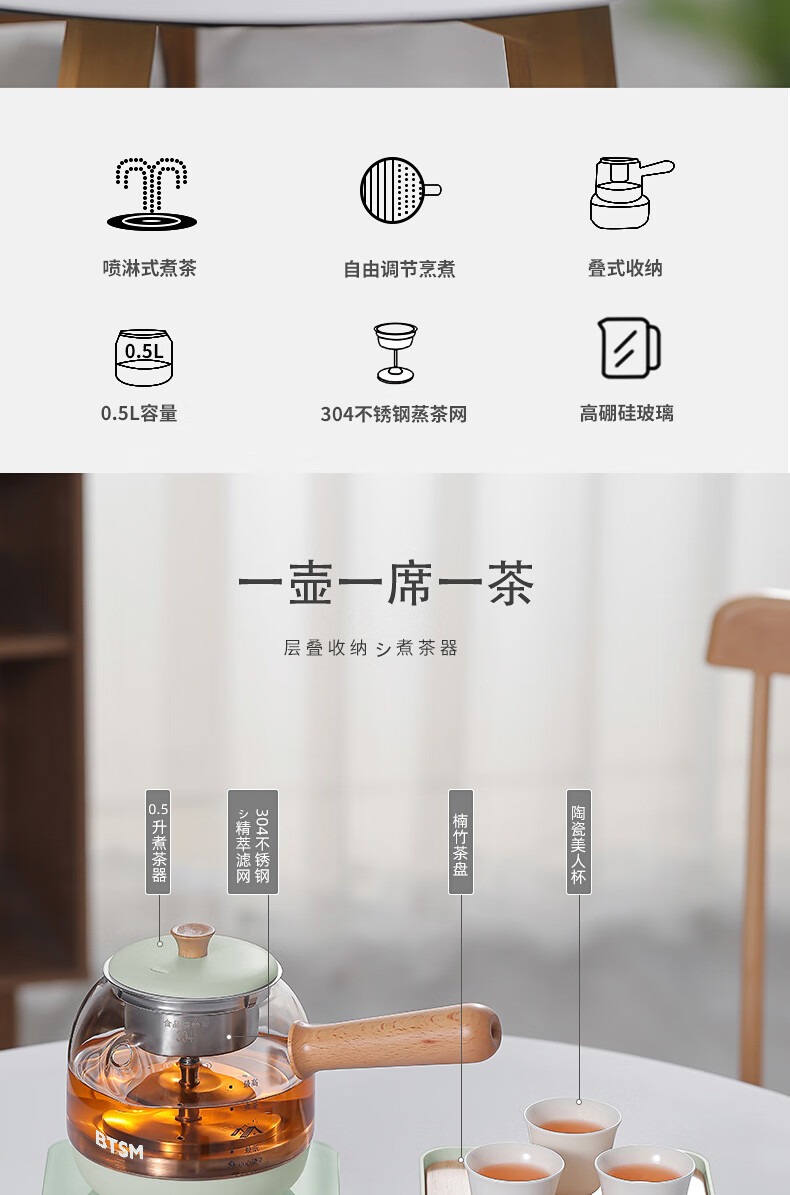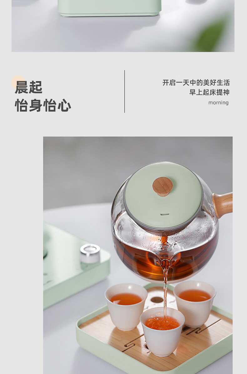额定功率:600W 额定电源:220V~50Hz 额定容量:500ml 产品净重:1.28kg 产品材质:高硼硅胶玻璃、304不锈钢 条形码:6971679080669 装 箱数:1*1 产品尺寸:260*168*221mm 彩箱尺寸:355*212*208mm 邮购箱尺寸:365*212*218mm 装 箱清单:底座*1、壶体*1、蒸茶网*1、陶瓷杯*3、竹盘*1、盖子*1、电源线*1、说明书*1