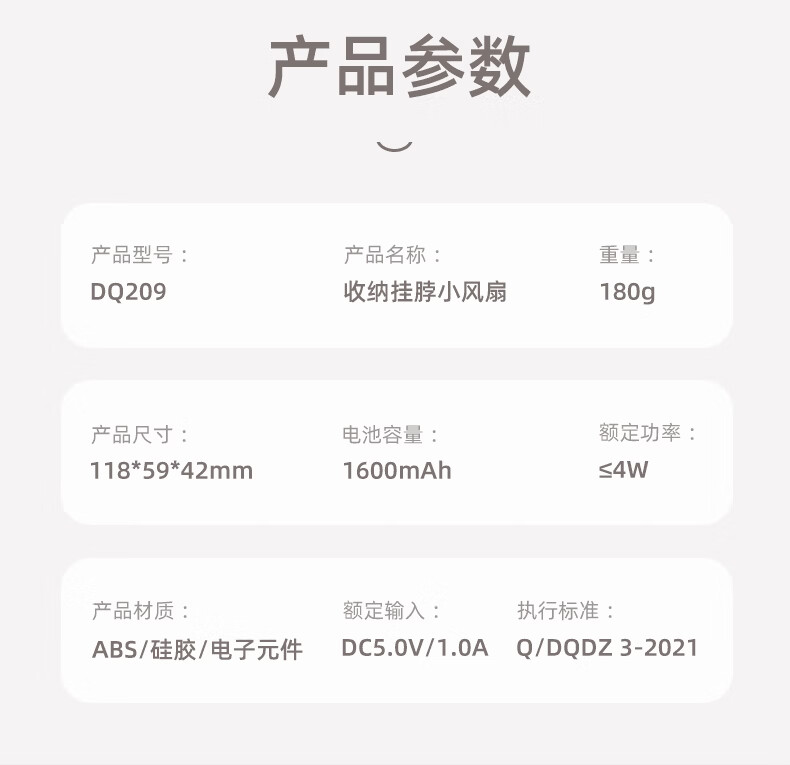 型 号:DQ209 产品颜色:白色 材 质:ABS+电子元器件 电池容量:1600mAh 续航时间:2-6小时 额定电压:DC5V-1A 风力档位:三档 产品尺寸:118*59*42mm 包装尺寸:123*65*67mm