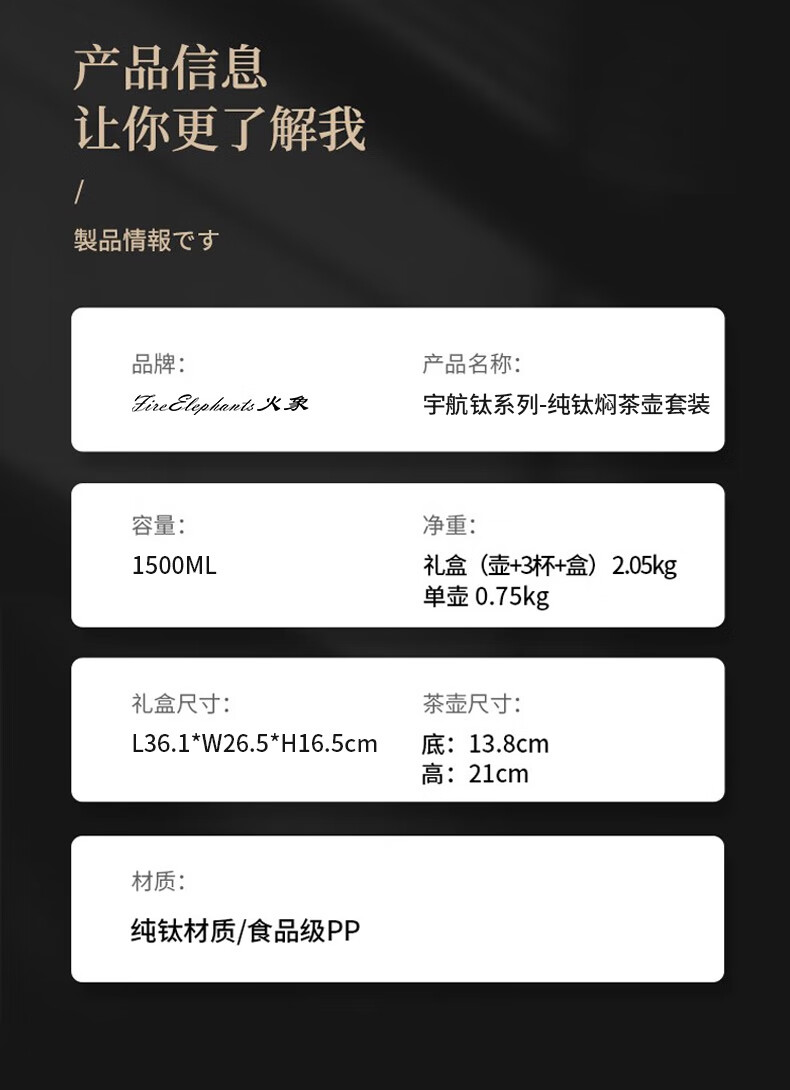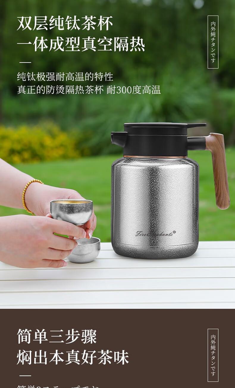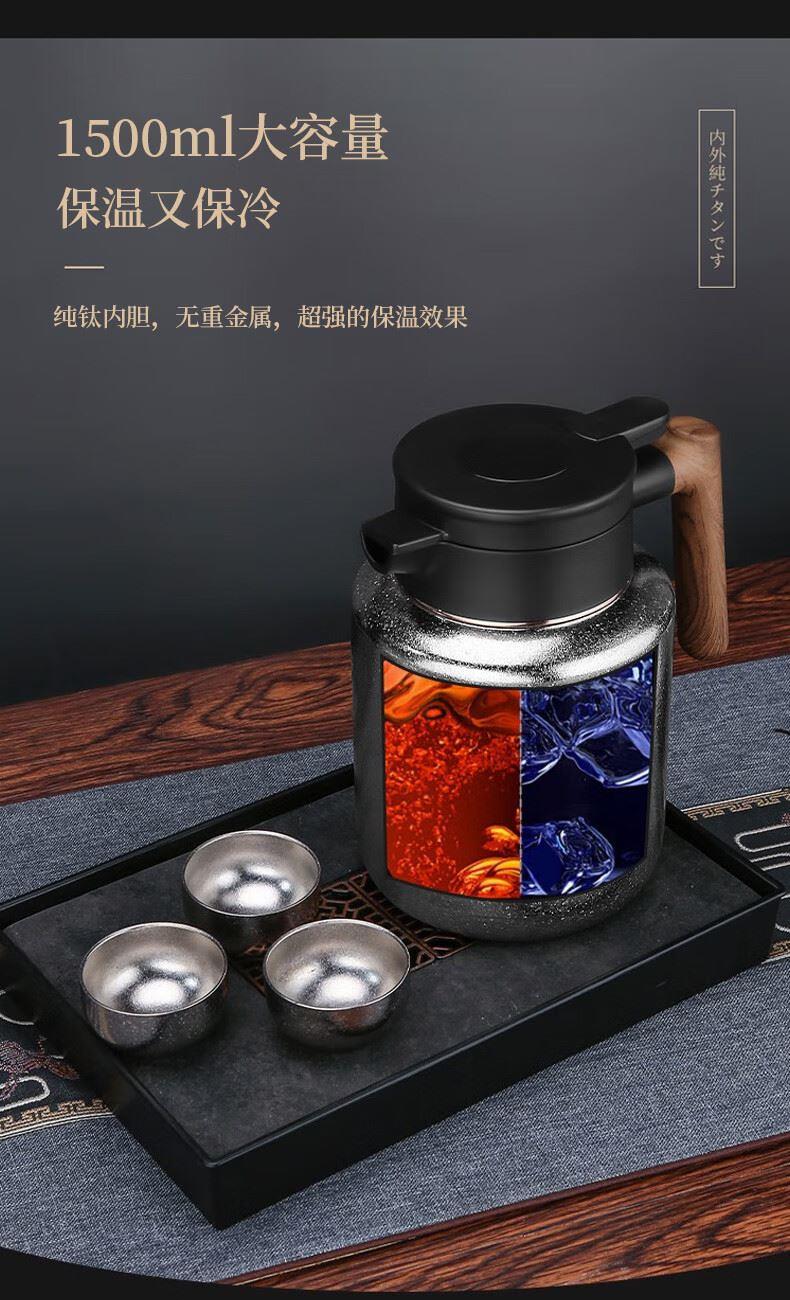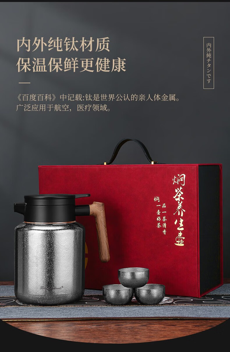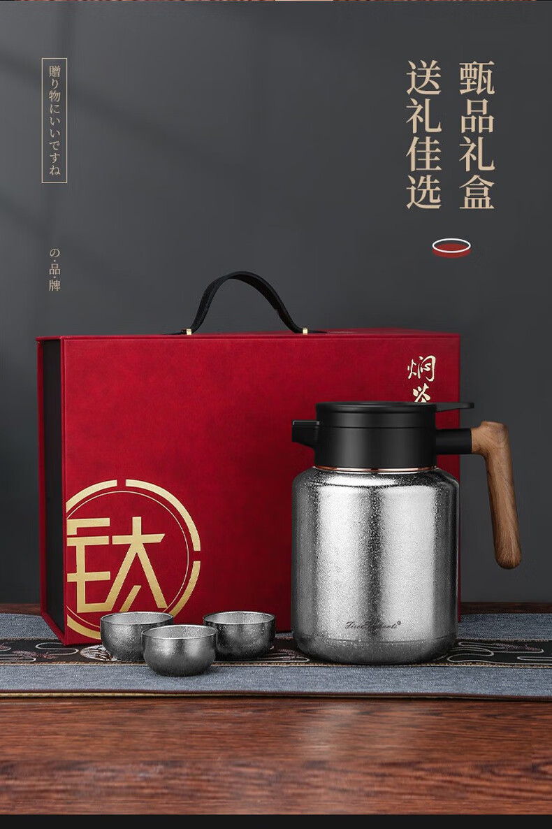 规 格:1500ml焖茶壶+3个50ml茶杯 材 质:焖茶壶 :内外纯钛 ;杯 盖:食品级PP 茶 隔 :纯 钛 茶 杯:纯 钛 颜 色:钛本色 装 箱 数:6pcs/箱 彩 盒 尺 寸:L36.1*W26.5*H16.5cm 外 箱 尺 寸:L56*W30*H76cm