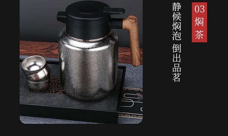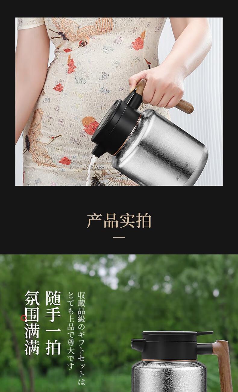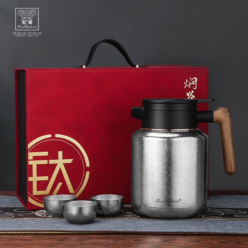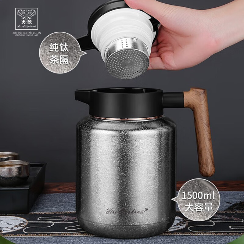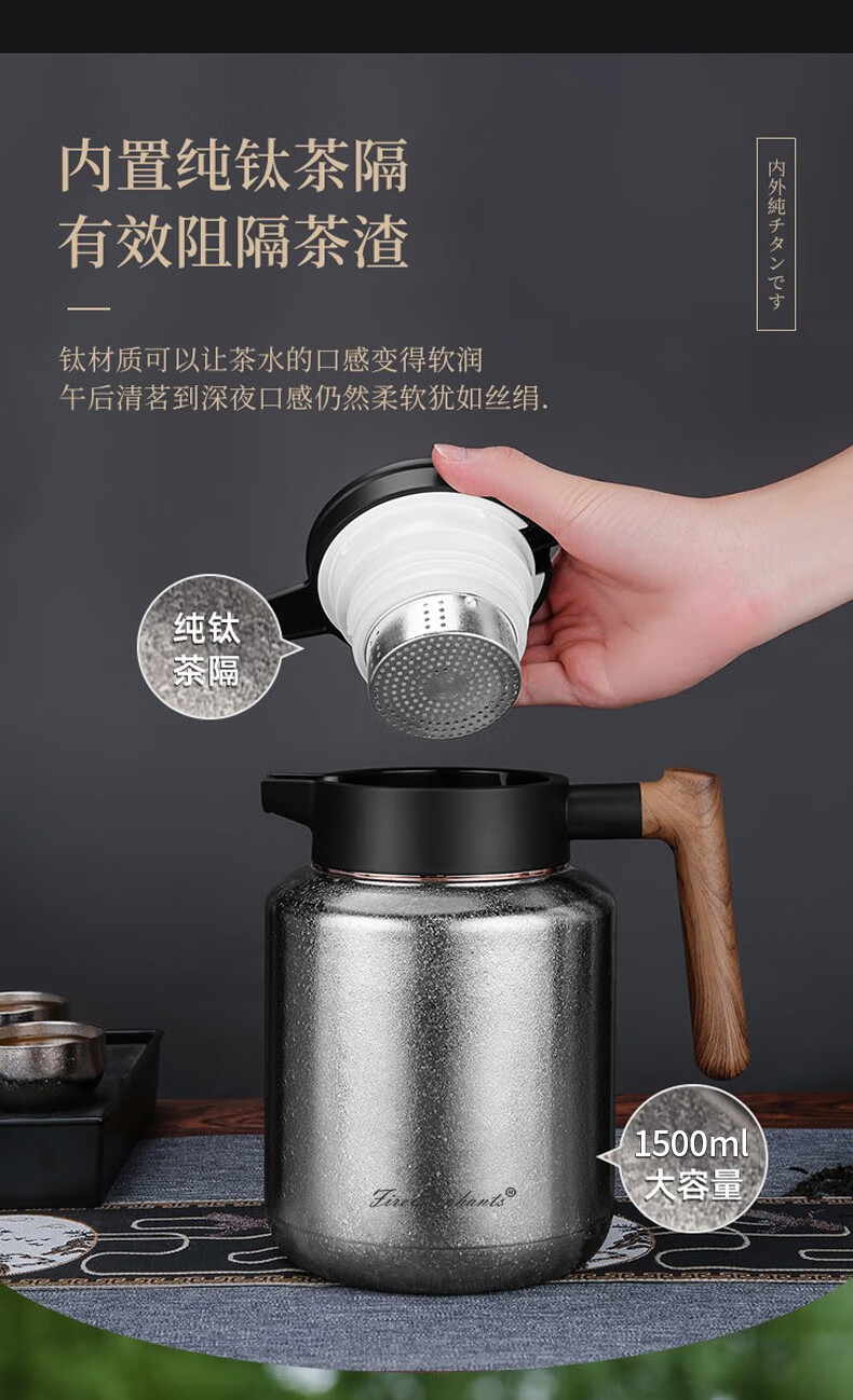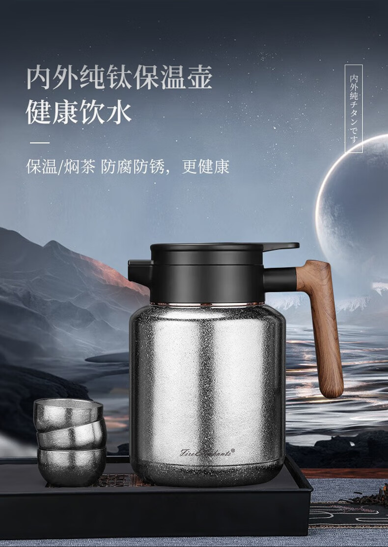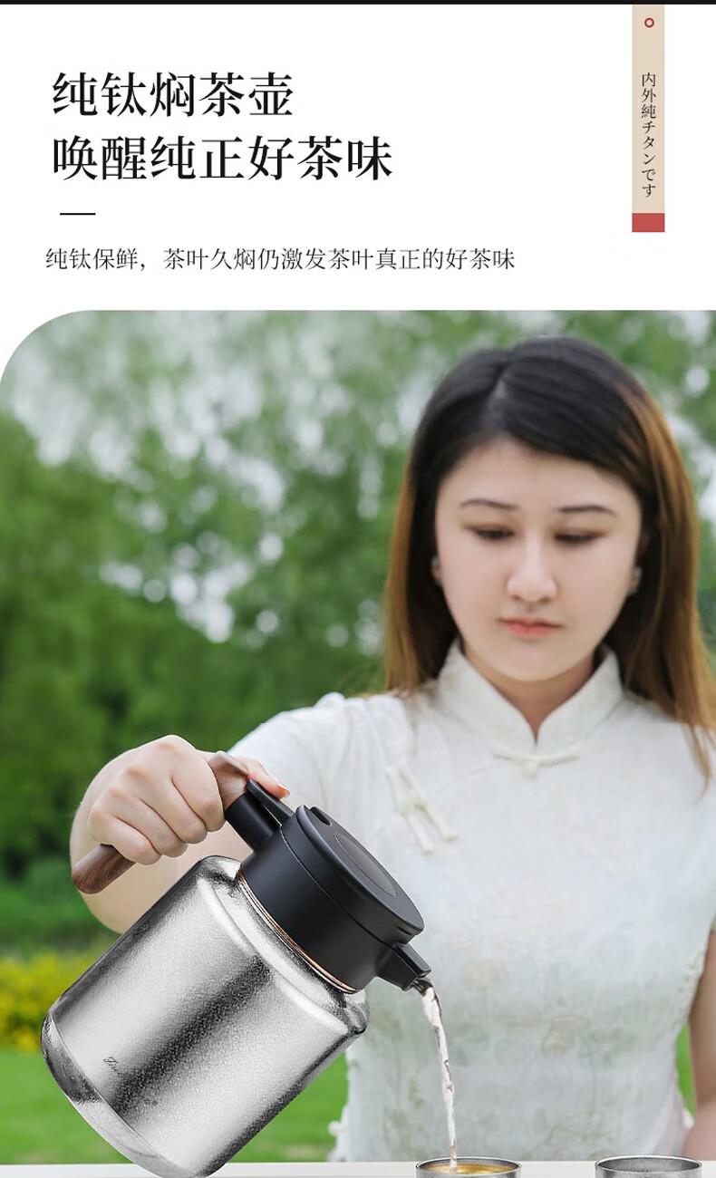规 格:1500ml焖茶壶+3个50ml茶杯 材 质:焖茶壶 :内外纯钛 ;杯 盖:食品级PP 茶 隔 :纯 钛 茶 杯:纯 钛 颜 色:钛本色 装 箱 数:6pcs/箱 彩 盒 尺 寸:L36.1*W26.5*H16.5cm 外 箱 尺 寸:L56*W30*H76cm