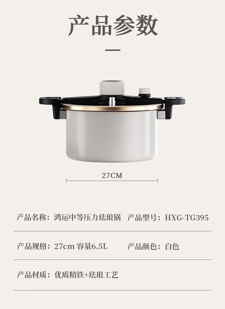 规 格:27cm 容量6.5L 材 质:优质精铁+珐琅工艺 颜 色:白色(红色定制) 装 箱 数:4pcs/箱 彩 盒 尺 寸:L33.8*W33.8*H23cm 外 箱 尺 寸:L69.5*W69.5*H25cm