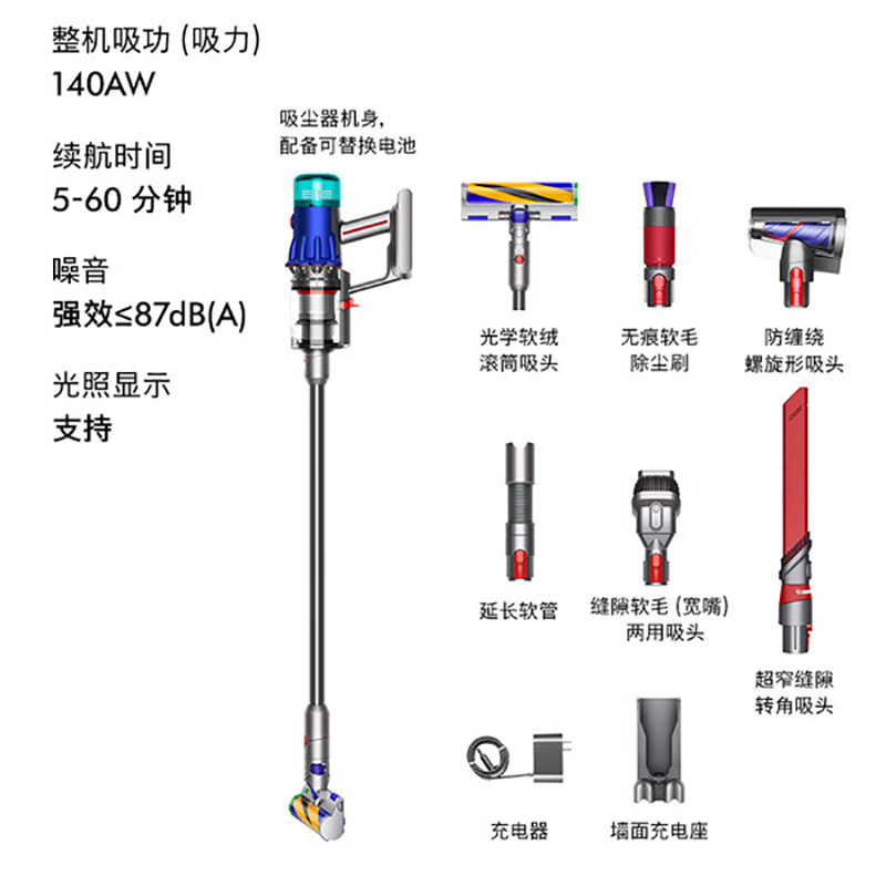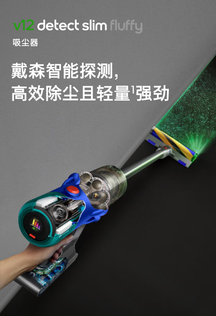 型号:V12 detect slim filffy 22款 v12 detect slim fluf尺寸:1234x250x252MM 地面运行时间 高达50分钟有助吸附99.99%小至0.1微米的微尘