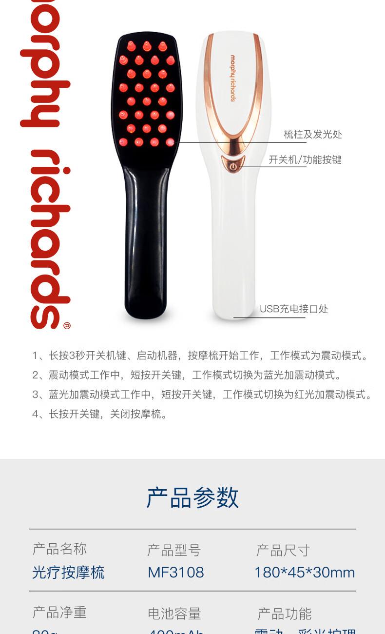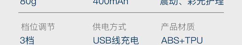 续航:满电可连续使用3小时 充电时间:1小时±0.5小时 充电电压:5V1A 额定功率:2.5w 额定电流:0.5A 充电接口:Type-C 电池容量:400毫安 执行标准:GB4706.1-2005 配件:按摩梳,充电线