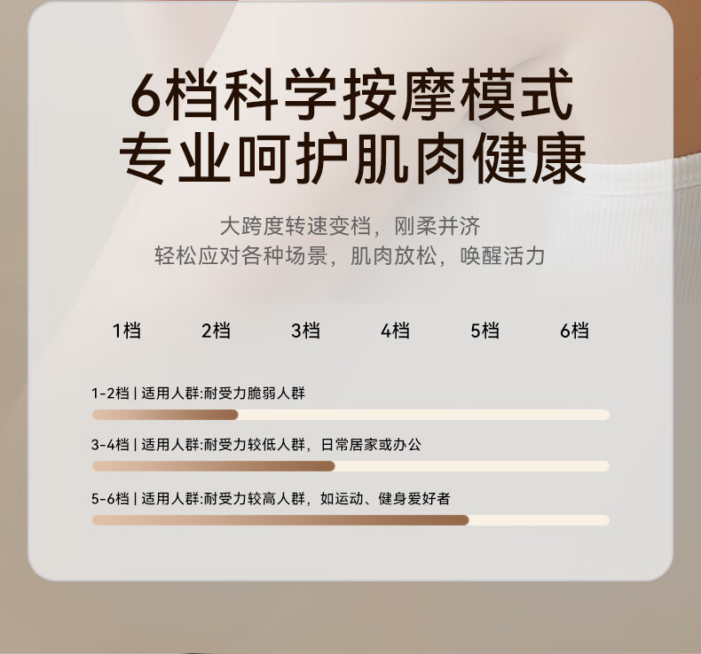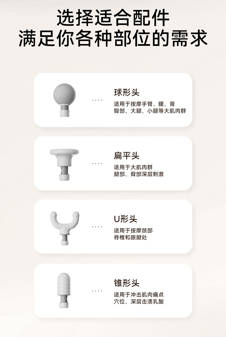 续航: ≈3h 充电时间:2.5小时±0.5小时 充电电压:DC 5V2A 大功率:10w 工作电压:7.4V 充电接口:Type-C 电池容量:1200毫安 执行标准:GB4706.1-2005 配件:主机,按摩头*4,充电线