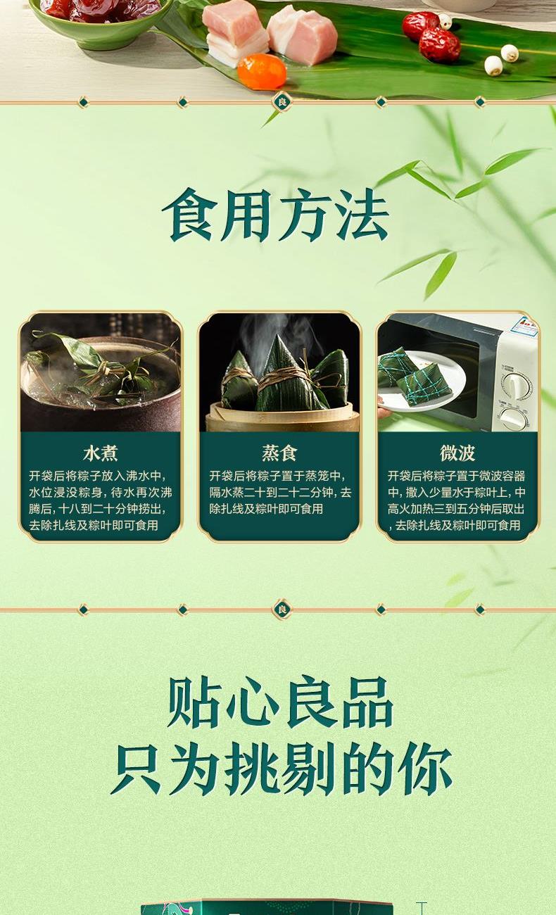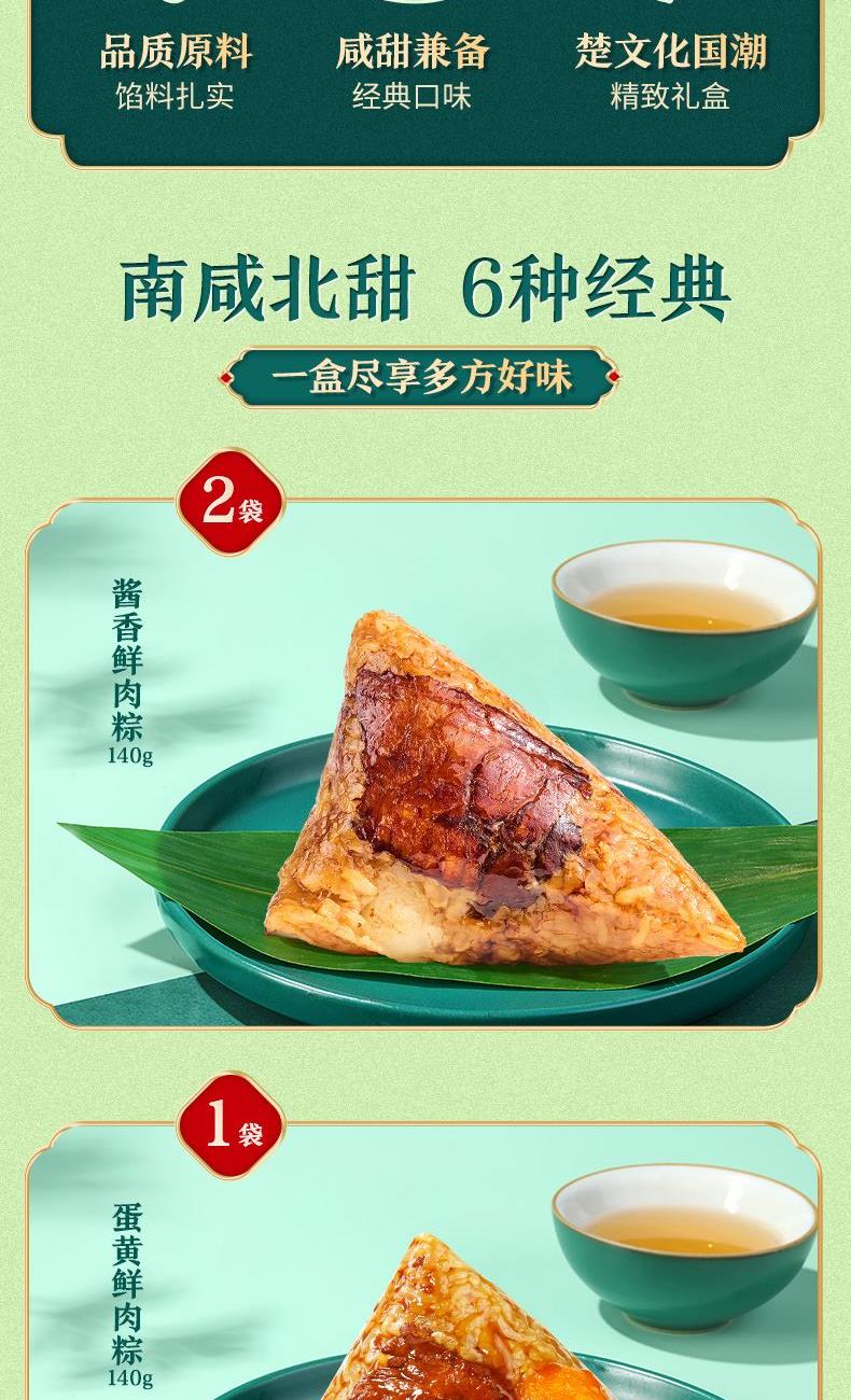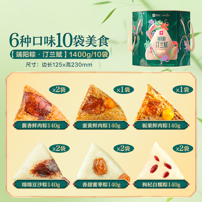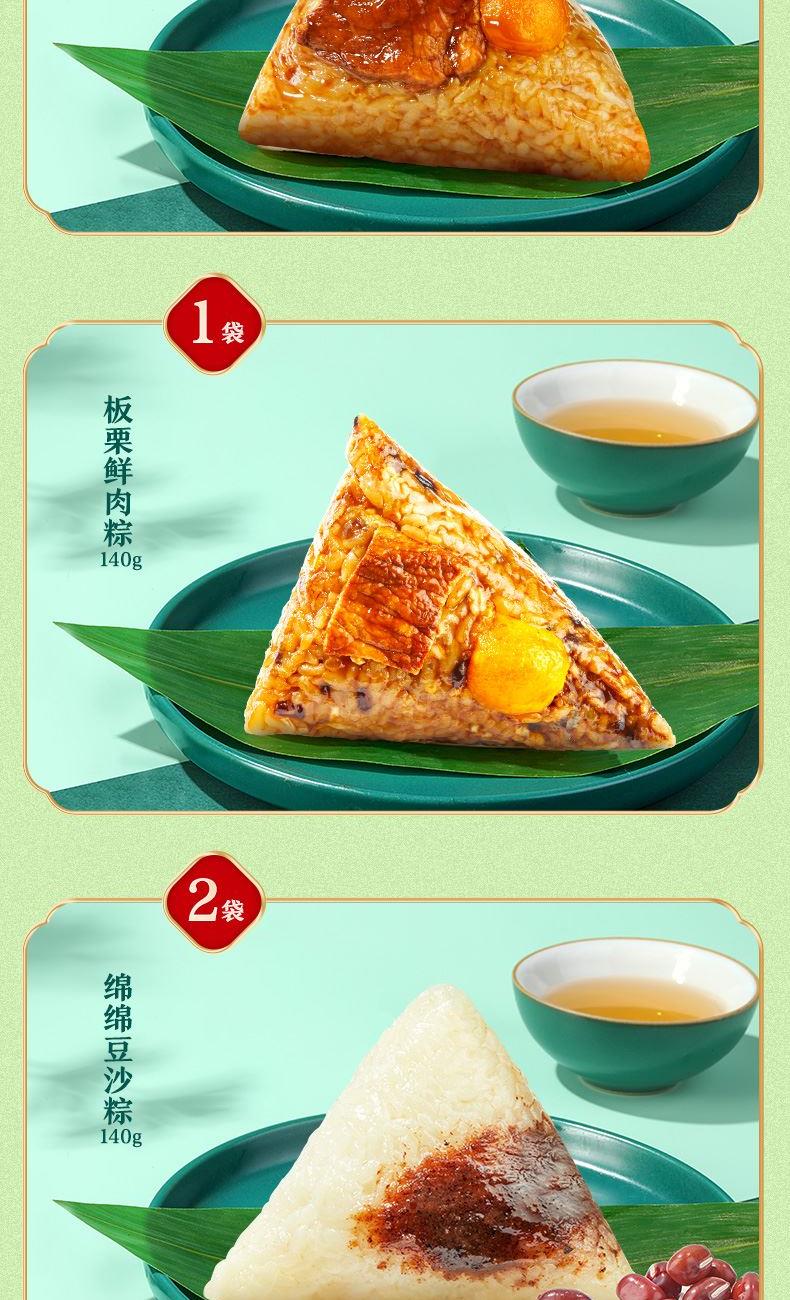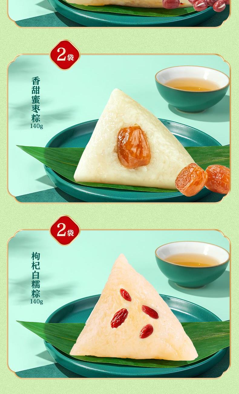 酱香鲜肉粽140g*2 蛋黄鲜肉粽140g*1 板栗鲜肉粽140g*1 绵绵豆沙粽140g*2 香甜蜜枣粽140g*2 枸杞白糯粽140g*2