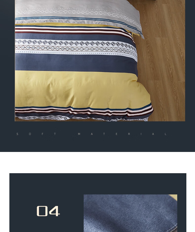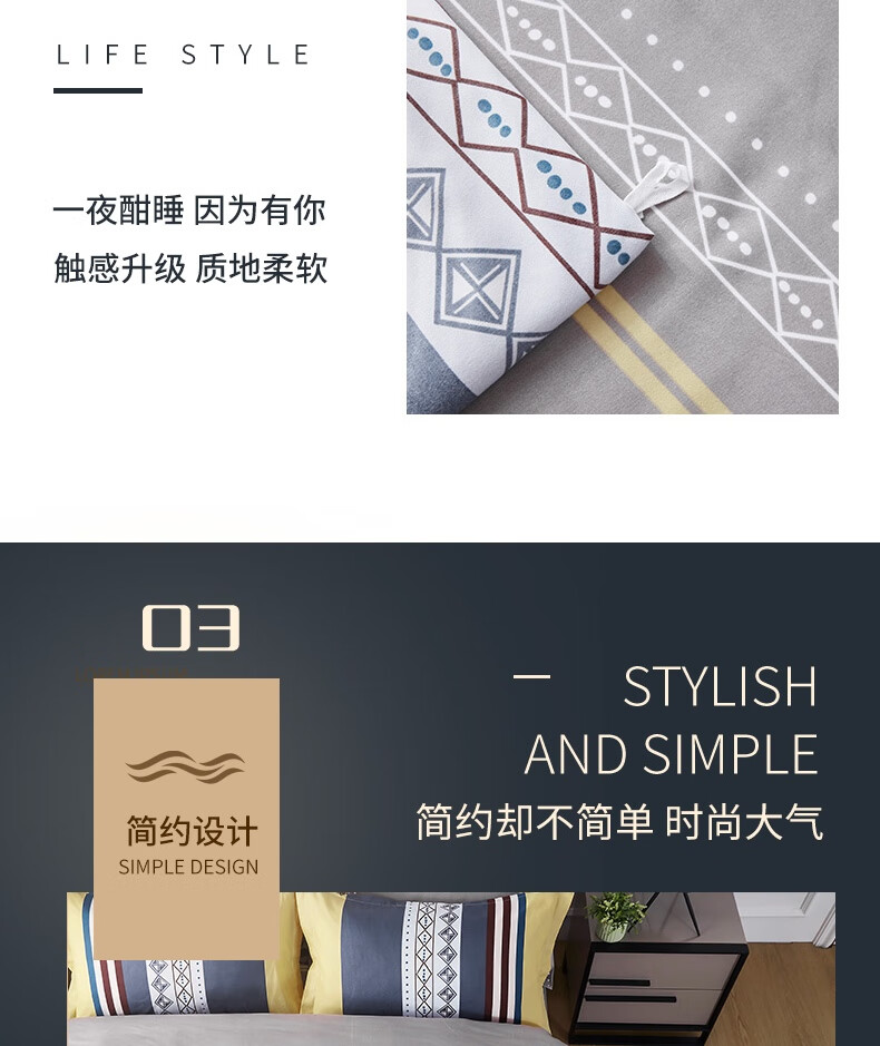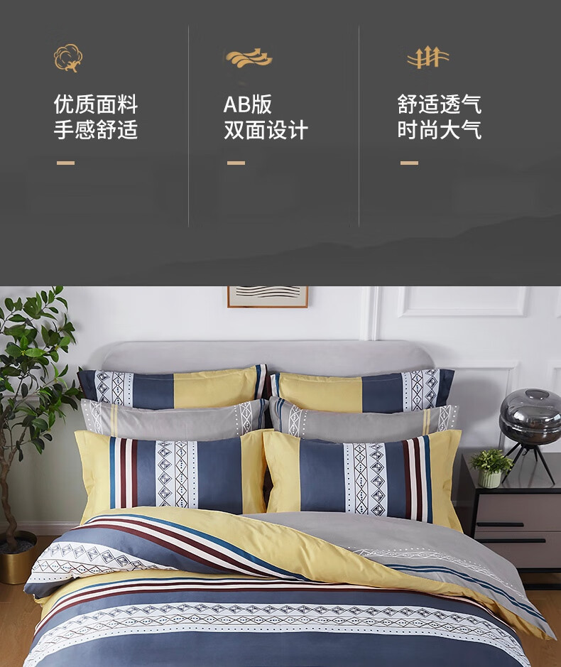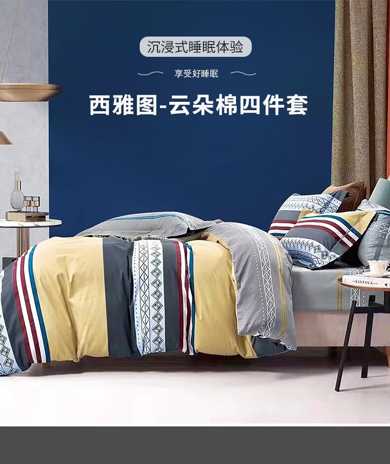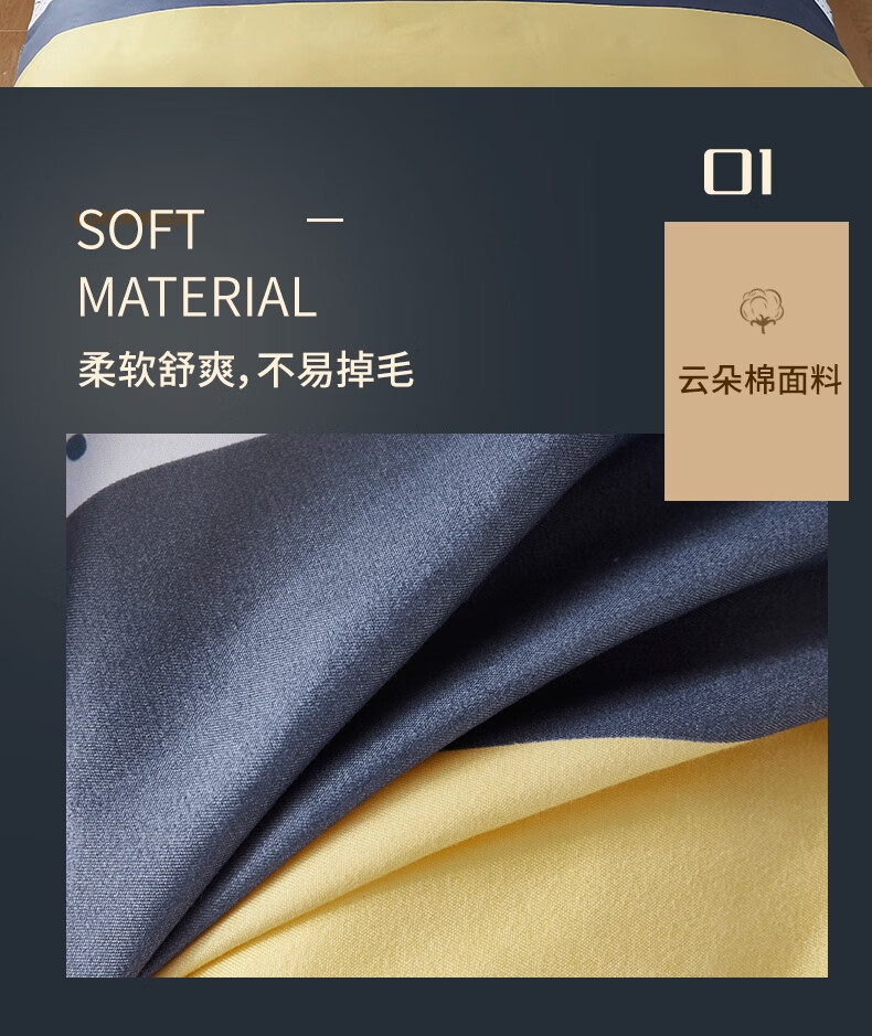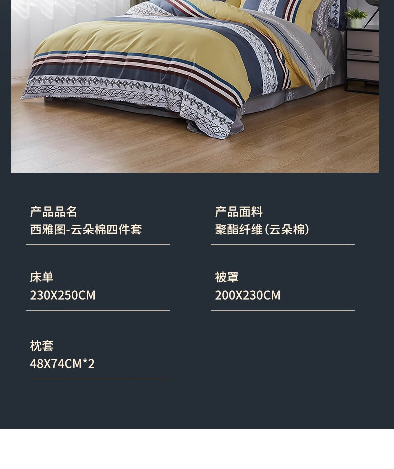 规格:床单:230x250cm 被罩:200x230cm 枕套:48x74cm*2 材质:聚酯纤维(云朵棉)