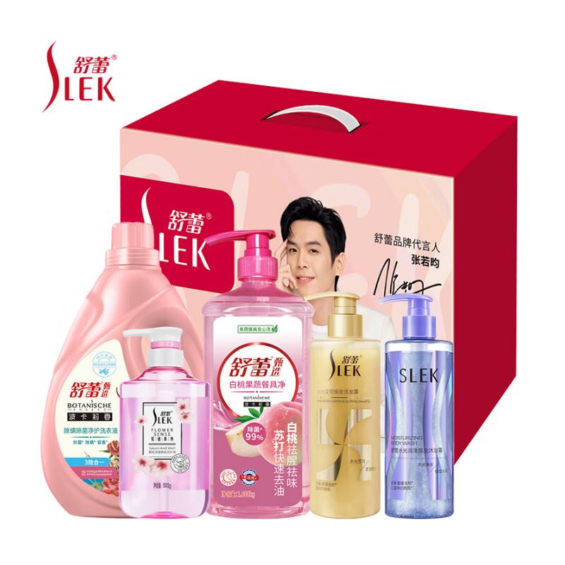 组合明细: 舒蕾樱花浪漫香氛洗手液-500g*1 舒蕾波卡莉香白桃果蔬餐具净1.008kg(电商盖+泵头)*1瓶 舒蕾水光润泽烁金沐浴露-400g*1 舒蕾水光莹亮烁金洗发露-400g*1 "舒蕾波卡莉香除螨除 菌净护洗衣液-1.58kg*1 礼盒*1