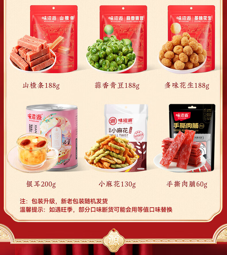味滋源 巴旦木 60g味滋源 双色果罐头200g味滋源 小麻花130g味滋源 小白杏 60g 味滋源 小白杏 60g 味滋源 多味花生 188g (红色款)味滋源 山楂条 188g (红色款)味滋源 蒜香青豆 188g (红色款)